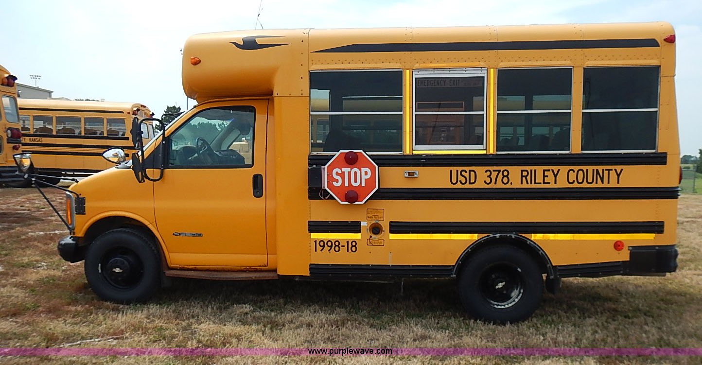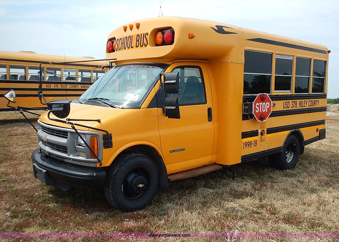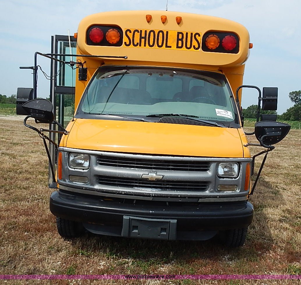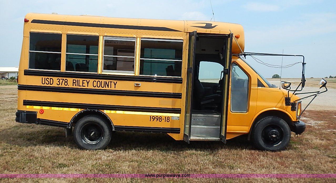 Purple Wave is selling a used Bus in Kansas. This item is a 1998 Chevrolet G3500 school bus with the following: 166,538 miles on odometer, 5.7L V8 gas engine, Automatic transmission, Heat, Manual windows and locks, Vinyl interior, Heated mirrors, 21 passenger capacity, Seat belts, 35 gallon fuel tank, Rear tow hooks, 225/75R16 tires, GVWR 10,000 lbs, Steering column damaged, Rust, Paint faded, Unit# 1998-18