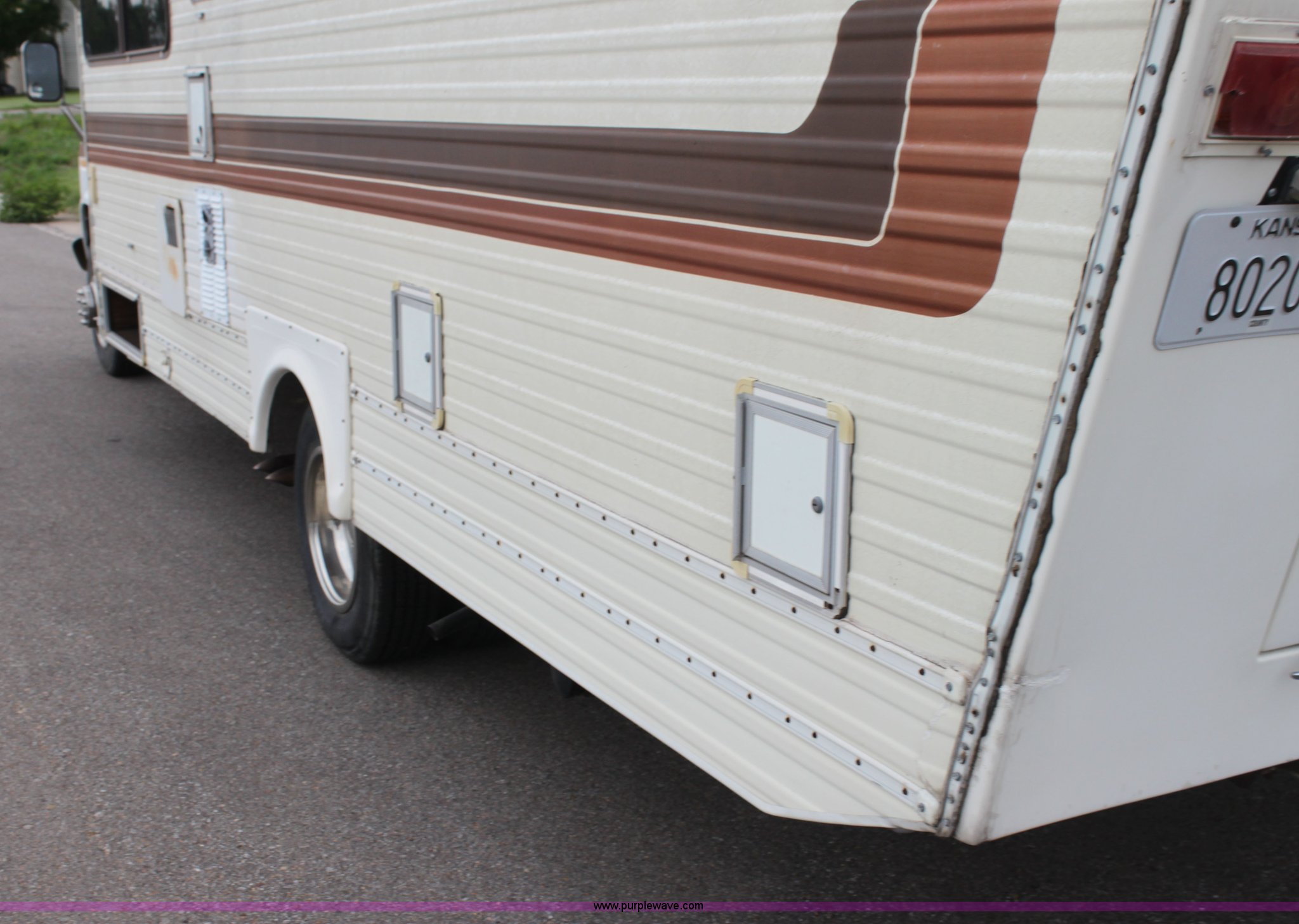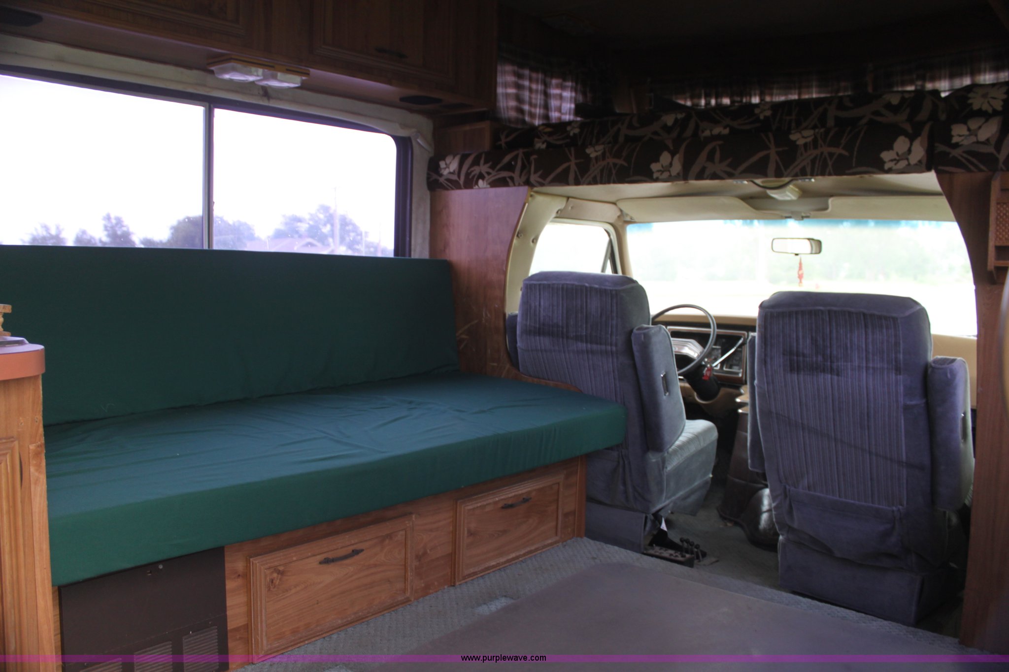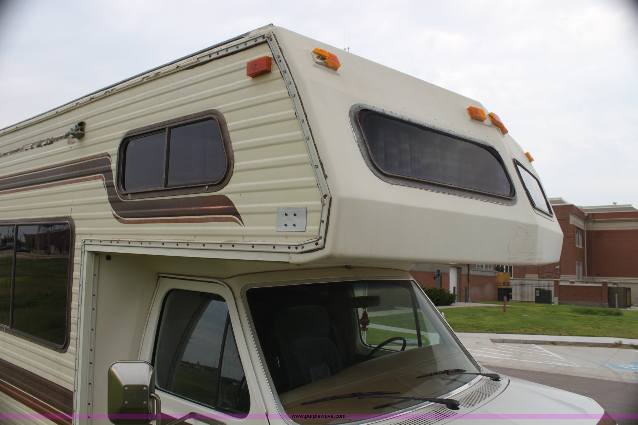 Purple Wave is selling a used RV in Kansas. This item is a 1984 Ford Econoline E350 RV with the following: 66,833 miles on odometer, 7.5L V8 OHV 16V gas engine, Automatic transmission, AC and heat, AM/FM, Manual windows and locks, Front bunk bed, Pull out couch, Master bed in rear, Stove and cook top, Electric/gas refrigerator/freezer, Unknown operating condition, Roof top AC, Onan GenSet generator, 4 kW, Electric start, 8.75/16.5 tires, Interior/exterior cosmetic damage, Sky light in shower broken