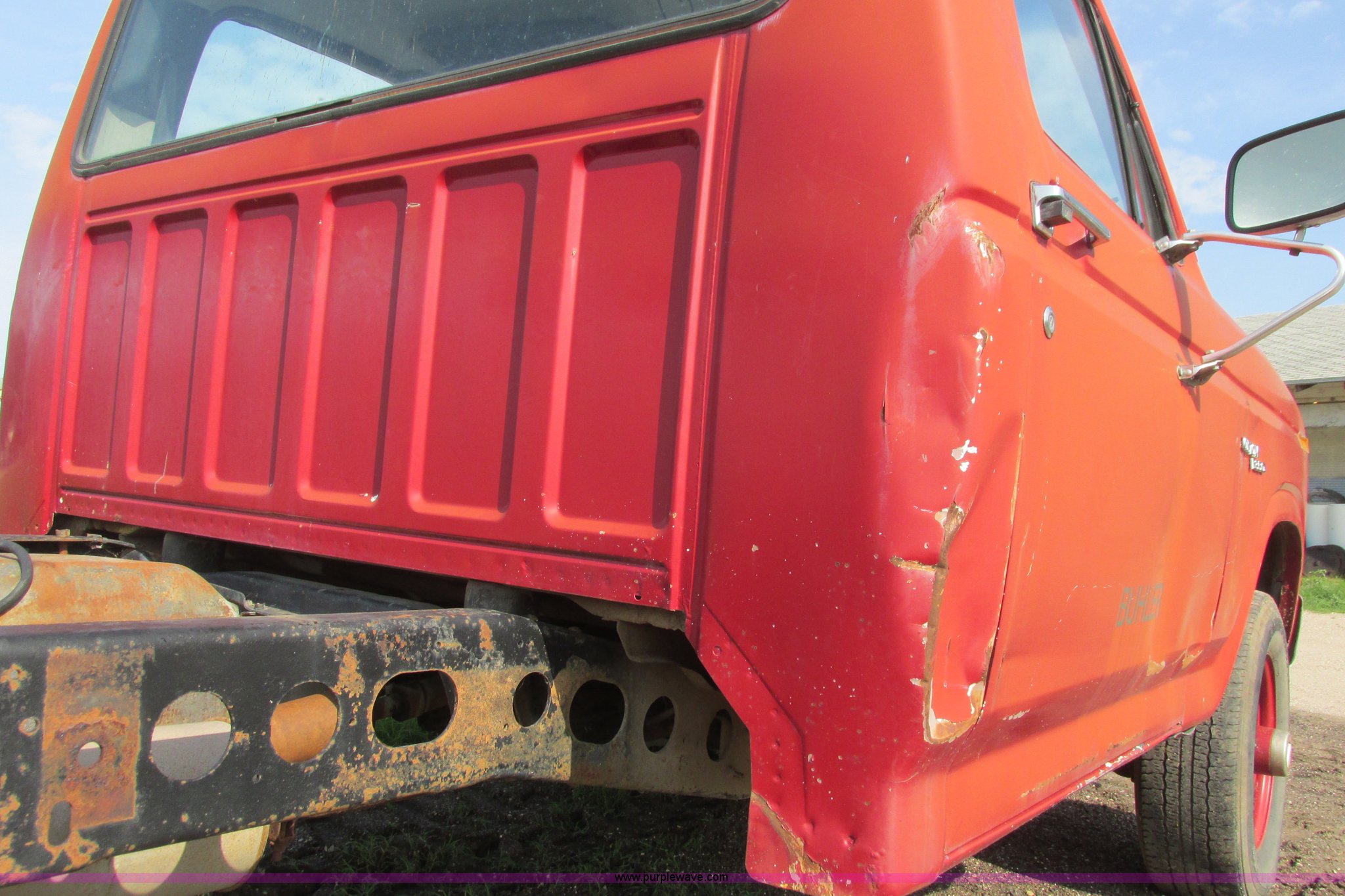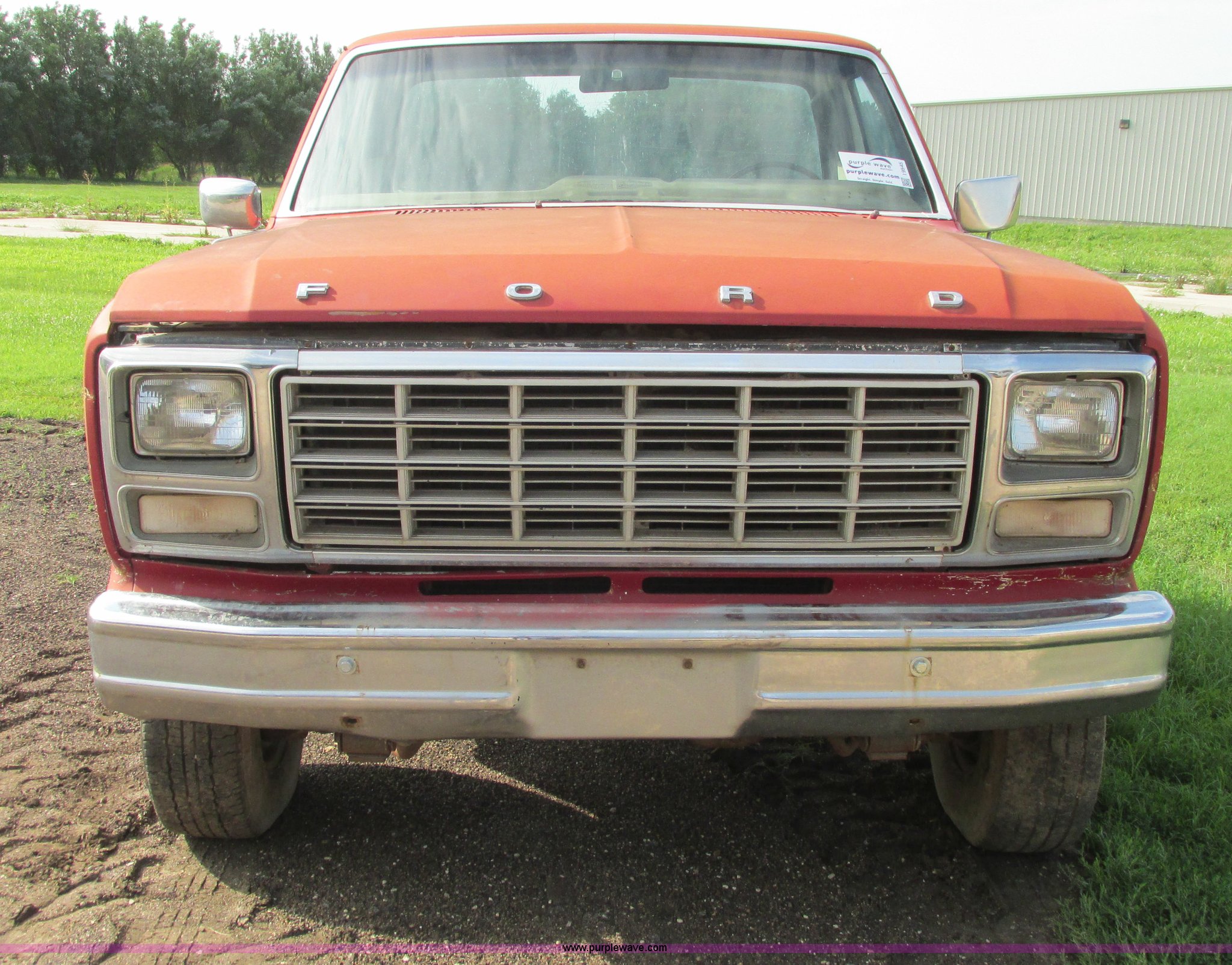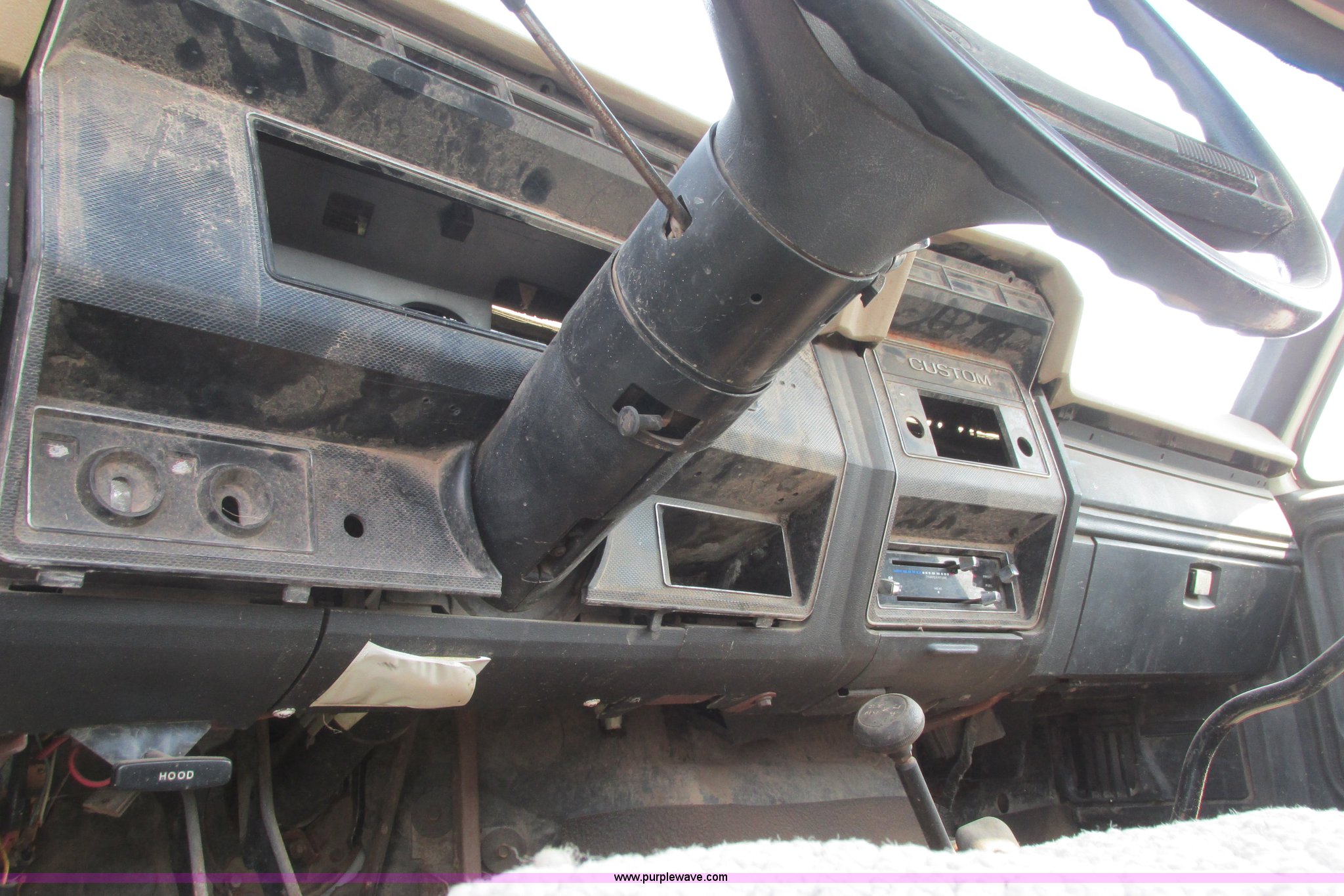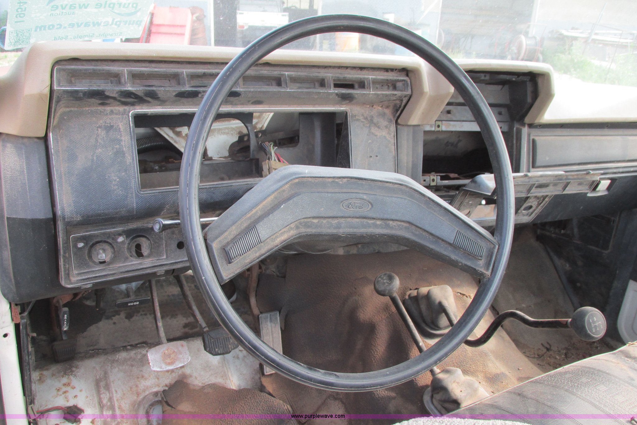 Purple Wave is selling a used 3/4 or 1 Ton Pickup or Van in Kansas. This item is a 1980 Ford F350 truck cab and chassis with the following: Unknown miles on odometer, 6.6L eight cylinder gas engine, Four speed manual transmission, Four wheel drive, Lock-out hubs, Manual windows and locks, Vinyl interior, LT245/75R16 front tire, LT225/75R16 front tire, 7.50-16LT rear tire, LT235/85R16 rear tire, Speedometer cluster missing, Dash electronics missing, Seat worn and torn, Rust, Fuel tank cap missing, Rear tires are bad, Cab damaged, Paint oxidized, Hood does not latch, Parts missing, Non-operational unit
