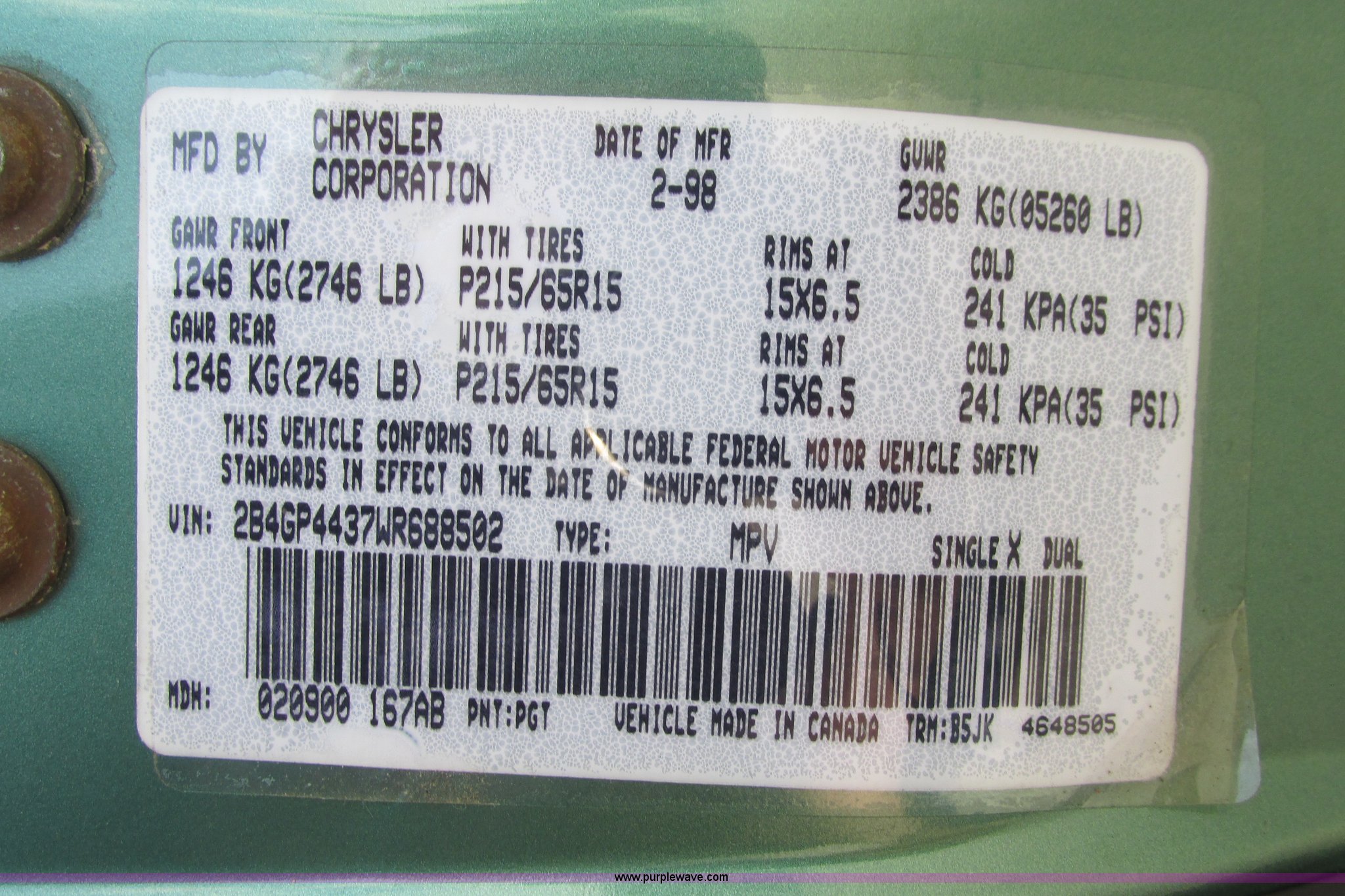 1998 Dodge Grand Caravan SE van. 87,809 actual miles, 3.0L V6 OHV 12V FFV gas engine, Automatic transmission, AC and heat, Tilt, Cruise, AM/FM/cassette, Power windows and locks, Middle seat included, 215/65R15 tires, Clear coat peeling, Decals will be removed prior to auction, Tailgate damaged, Hail damage, Hood dented, Interior/exterior cosmetic damage, Fire extinguisher is not included, Unit# 4. 2B4GP4437WR688502. USD 418. 210 N Elm. MCpherson, KS 67460