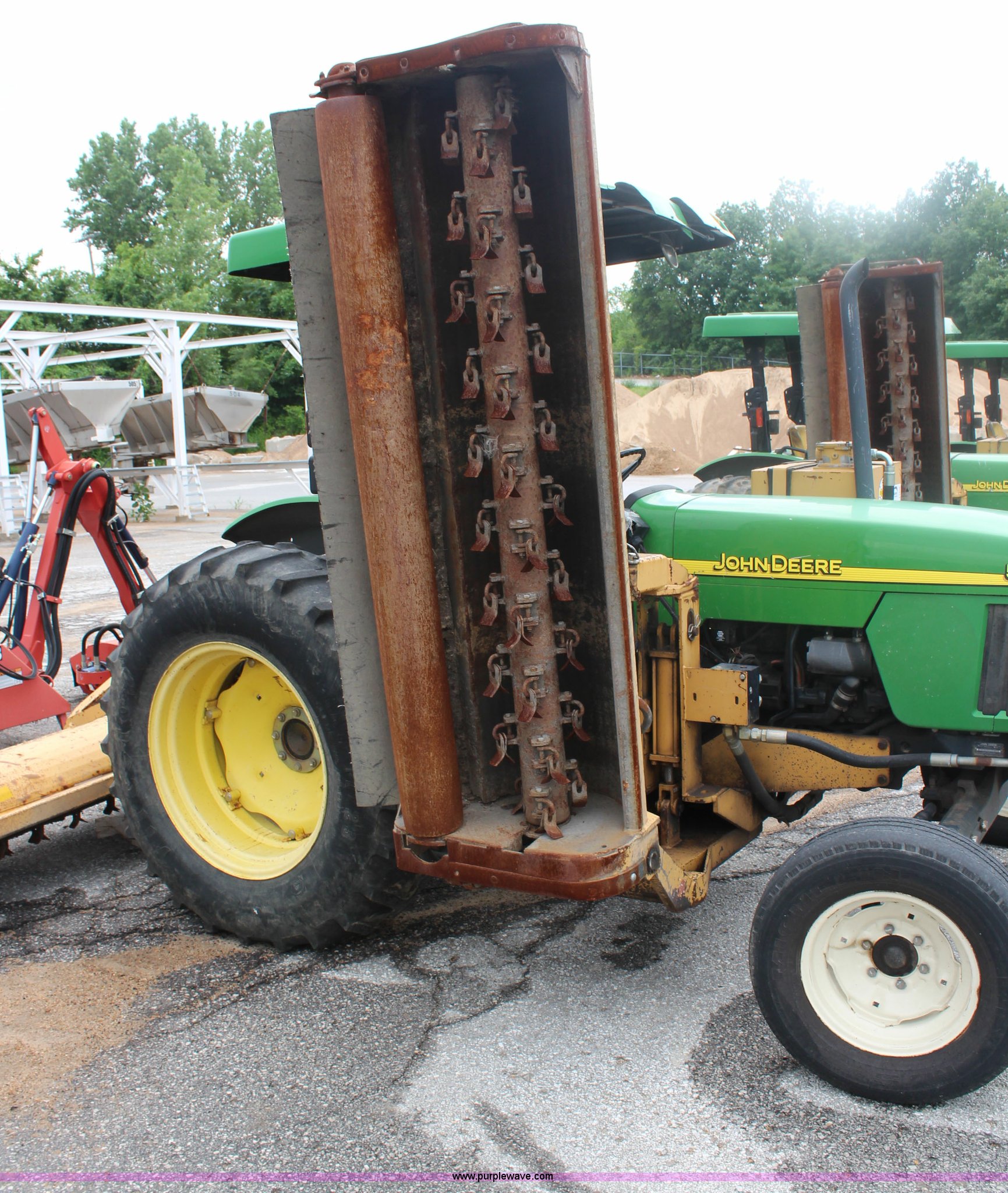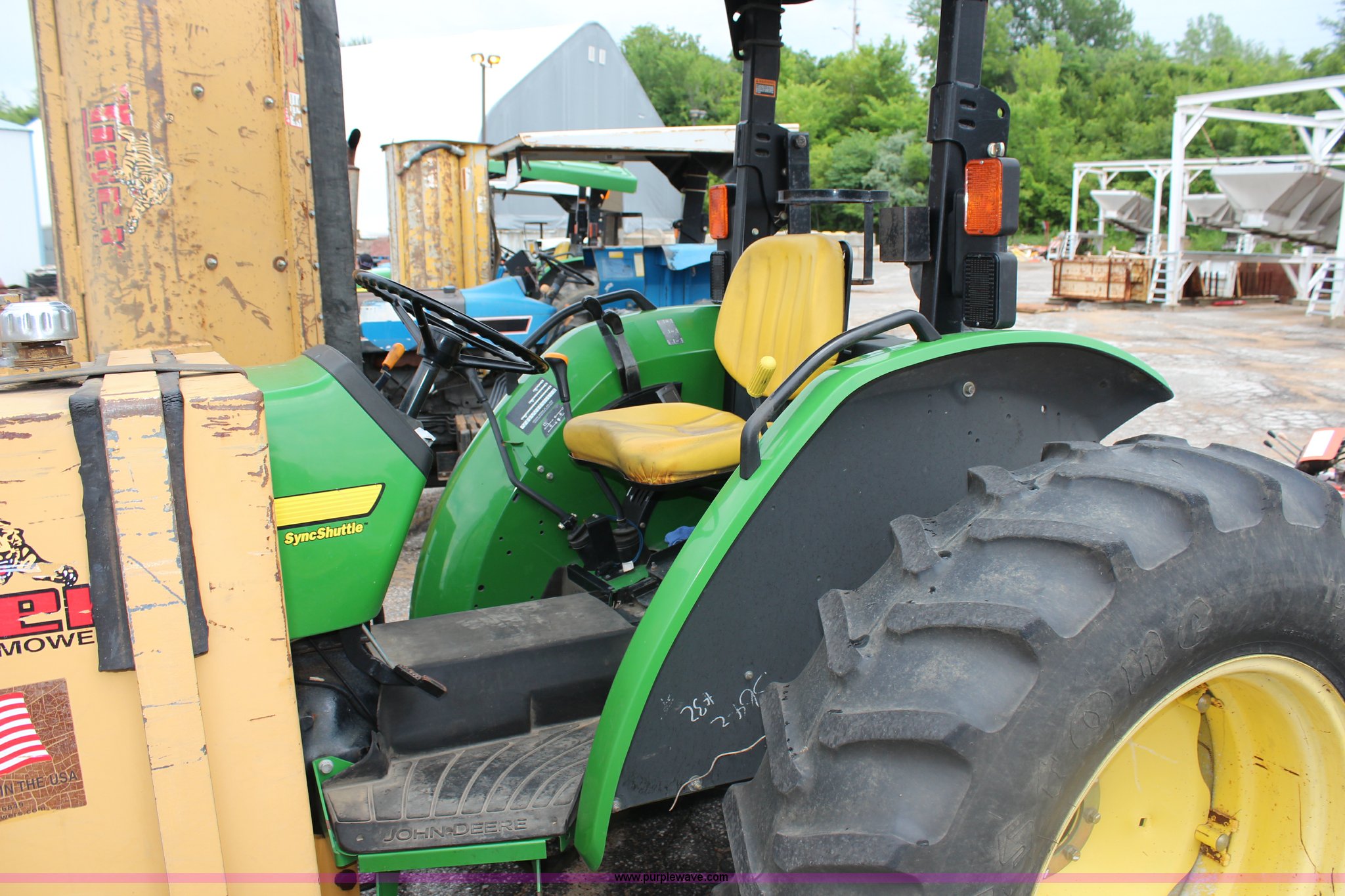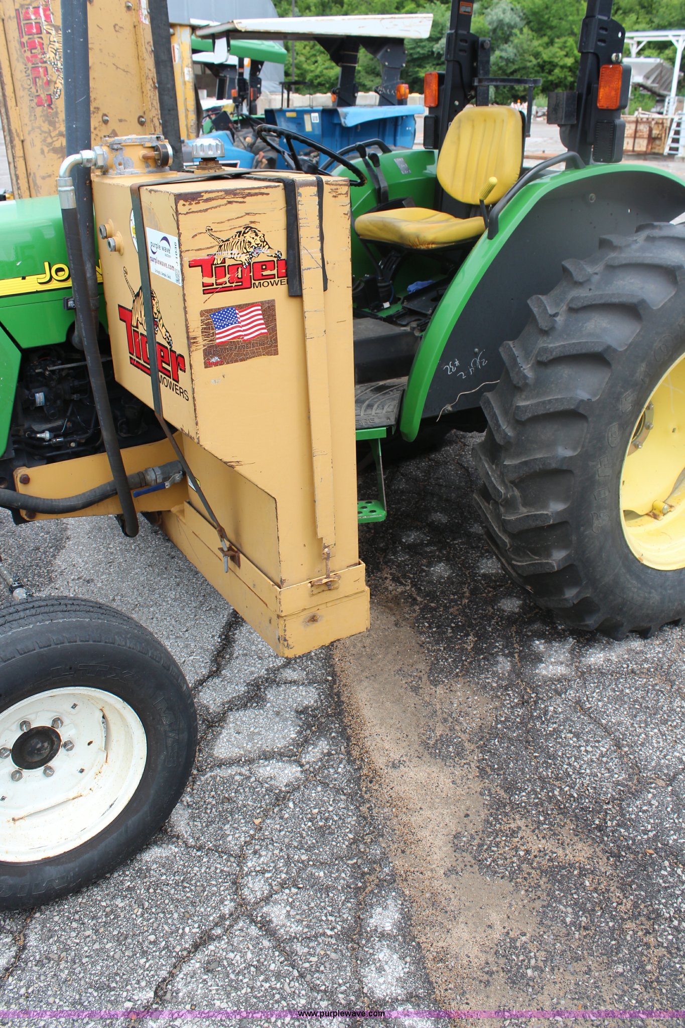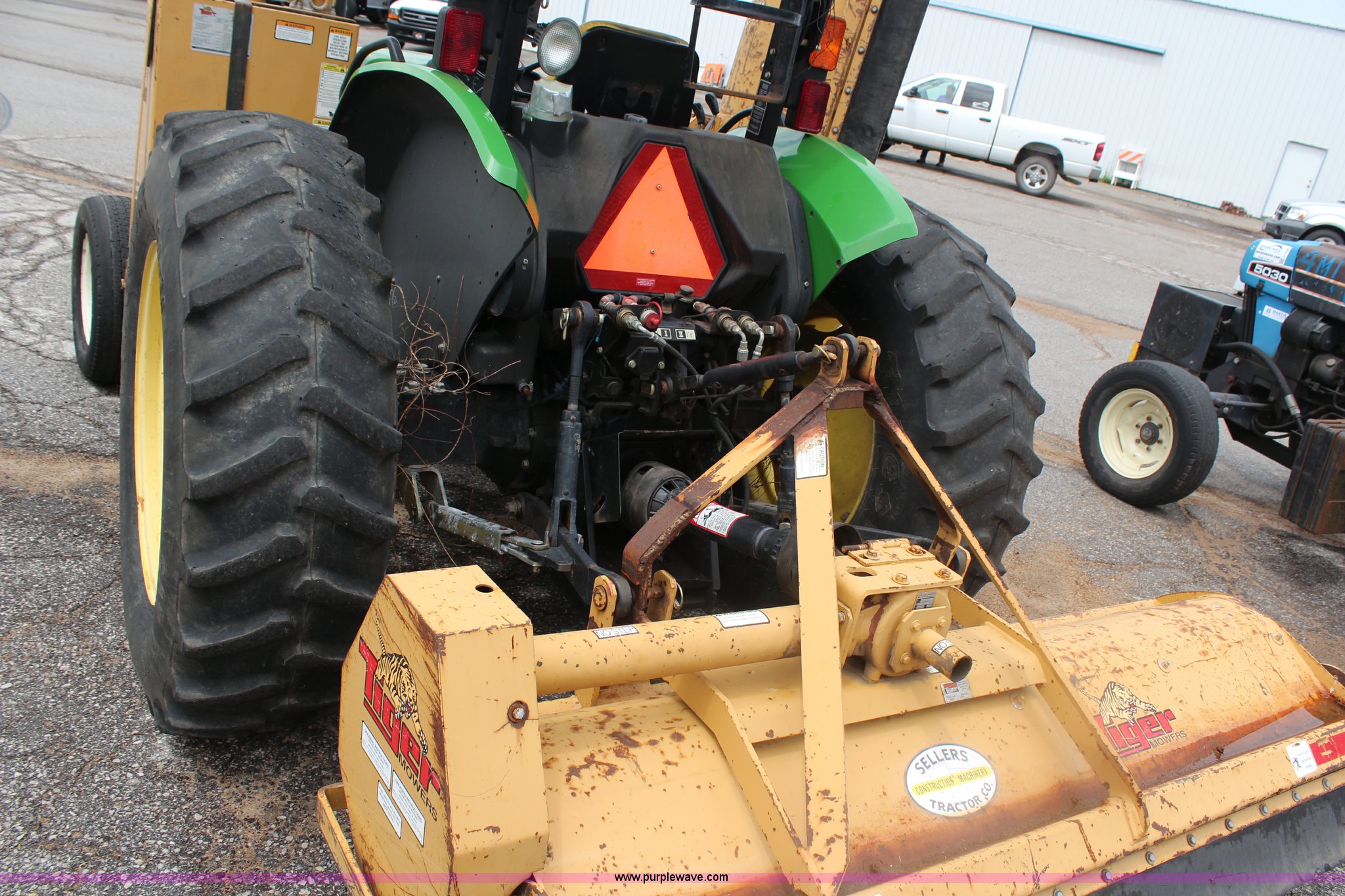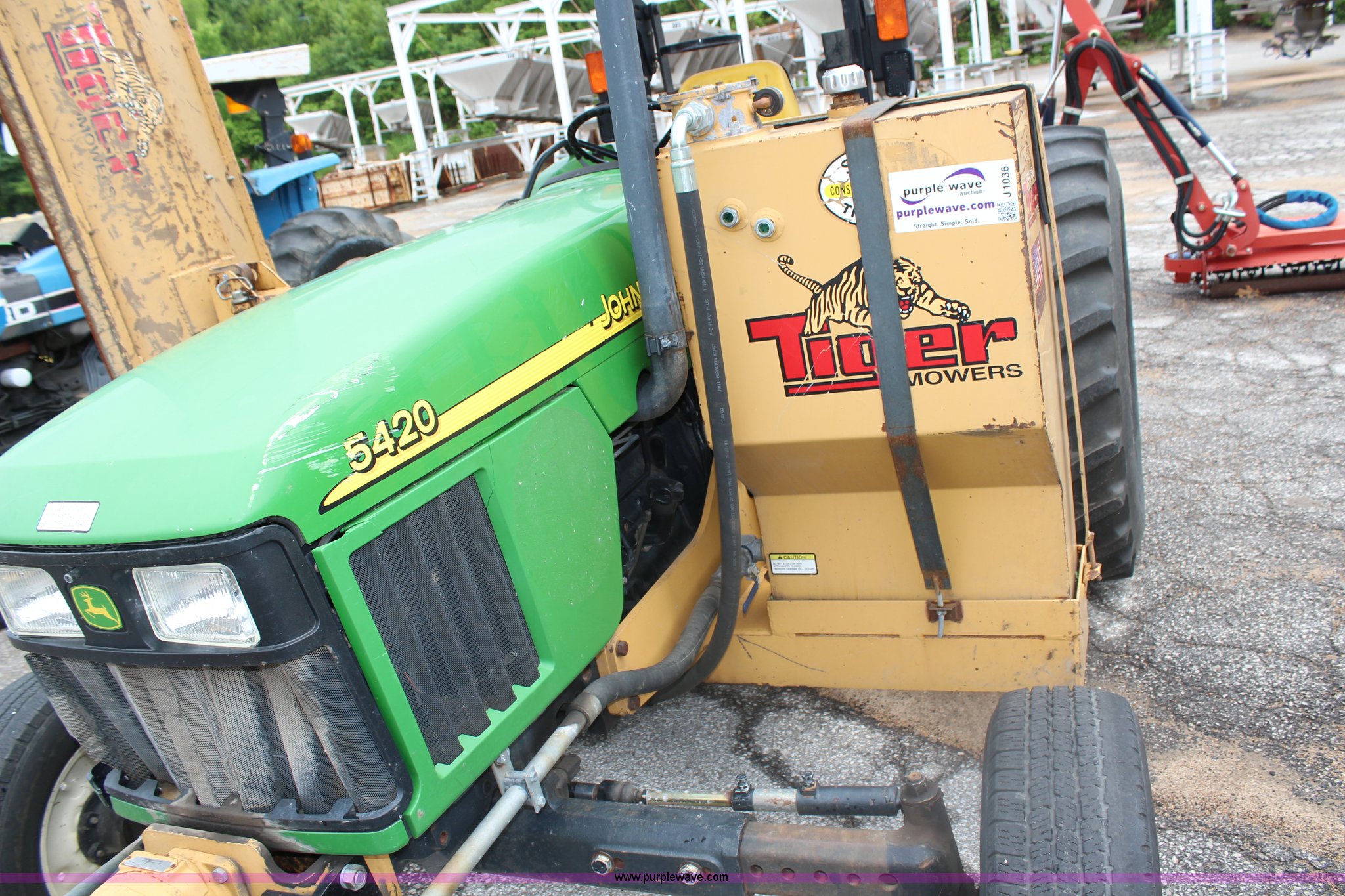 Purple Wave is selling a used Tractor in Kansas. This item is a 2003 John Deere 5420 tractor with the following: 2,297 hours on meter, John Deere 4.5L four cylinder diesel engine, 65 HP, Serial PE4045D263413, Shuttle synch transmission, 9F-3R gears, Canopy, Vinyl seat, Flashers, Three point, 540 PTO, (2) sets of rear hydraulic remotes, 18,120 gallon fuel capacity, 225/75R16 front tires, 16.9-30 rear tires, Tiger flail mower system, 91" rear flail mower, 76" side flail mower, Serial LV5420S342784