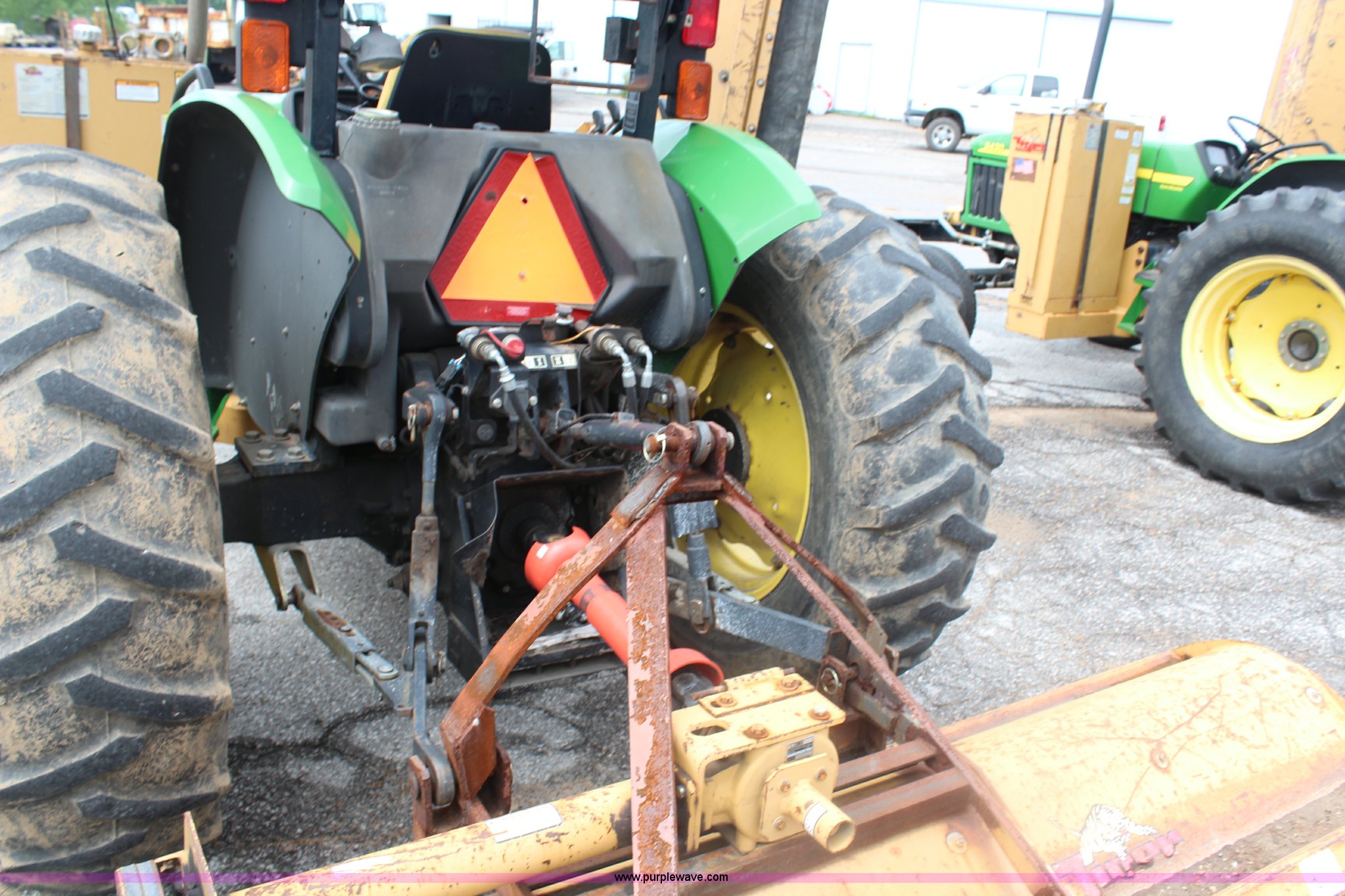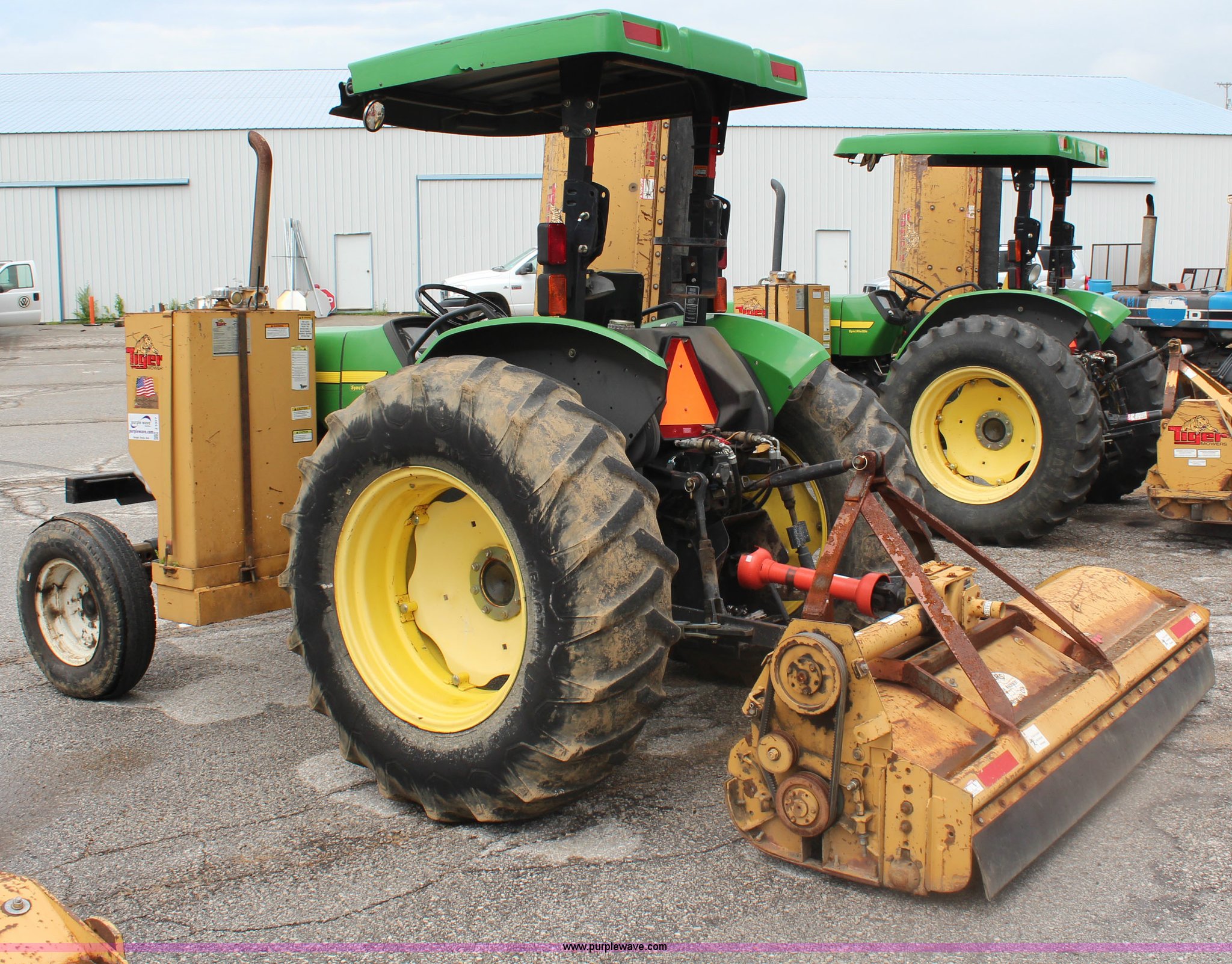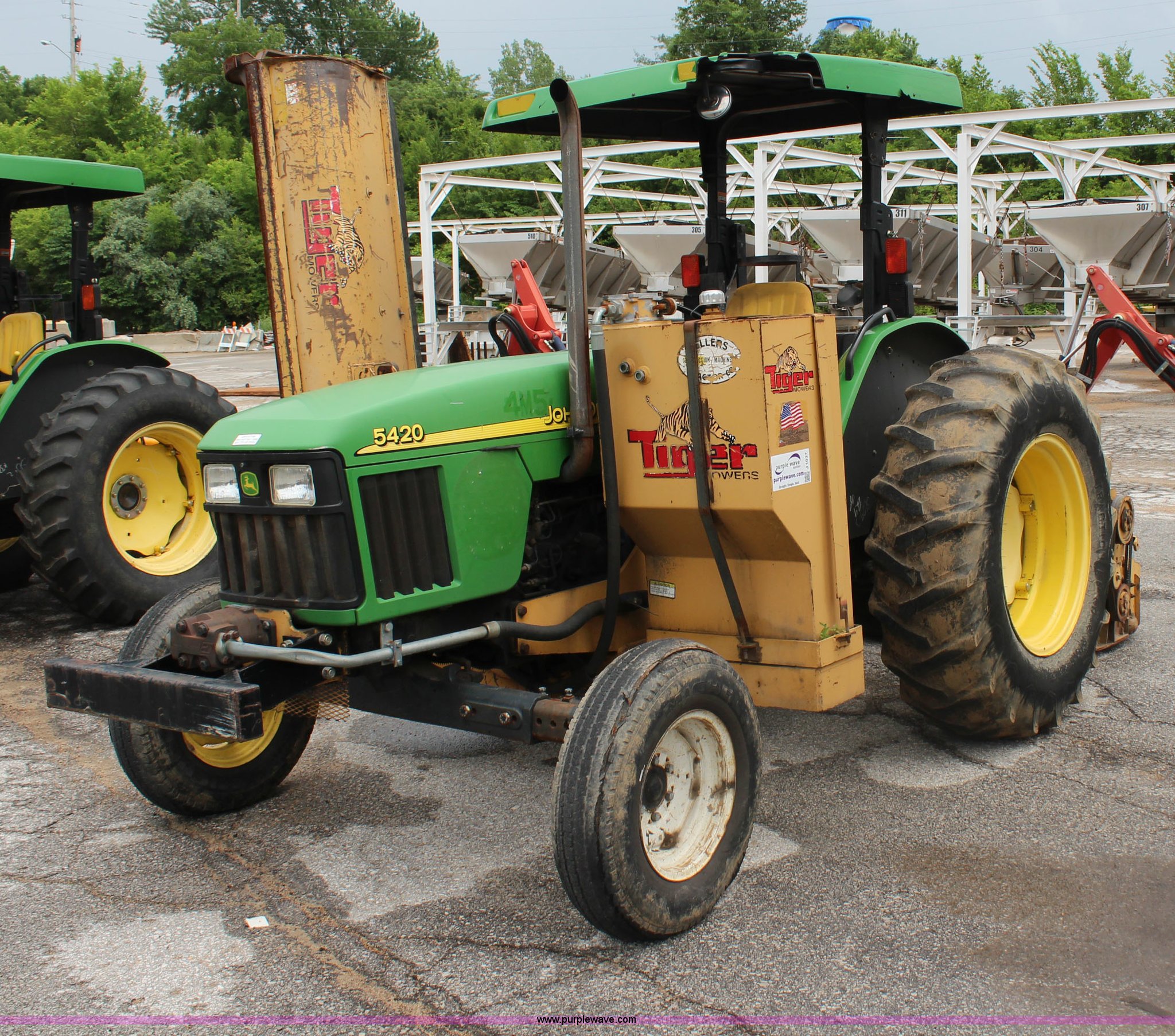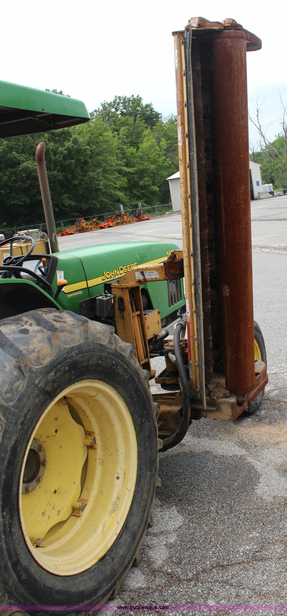 Purple Wave is selling a used Tractor in Kansas. This item is a 2003 John Deere 5420 tractor with the following: 2,892 hours on meter, John Deere 4.5L four cylinder diesel engine, 65 HP, Serial PE4045D263396, Shuttle synch transmission, 9F-3R gears, Canopy, Flashers, Vinyl seat, Three point, 540 PTO, (2) sets of rear hydraulic remotes, 18,120 gallon fuel capacity, 225/75R15 front tires, Worn, 16.9-30 rear tires, Tiger flail mower system, 91" rear flail mower, 76" side flail mower, Serial LV5420S342788