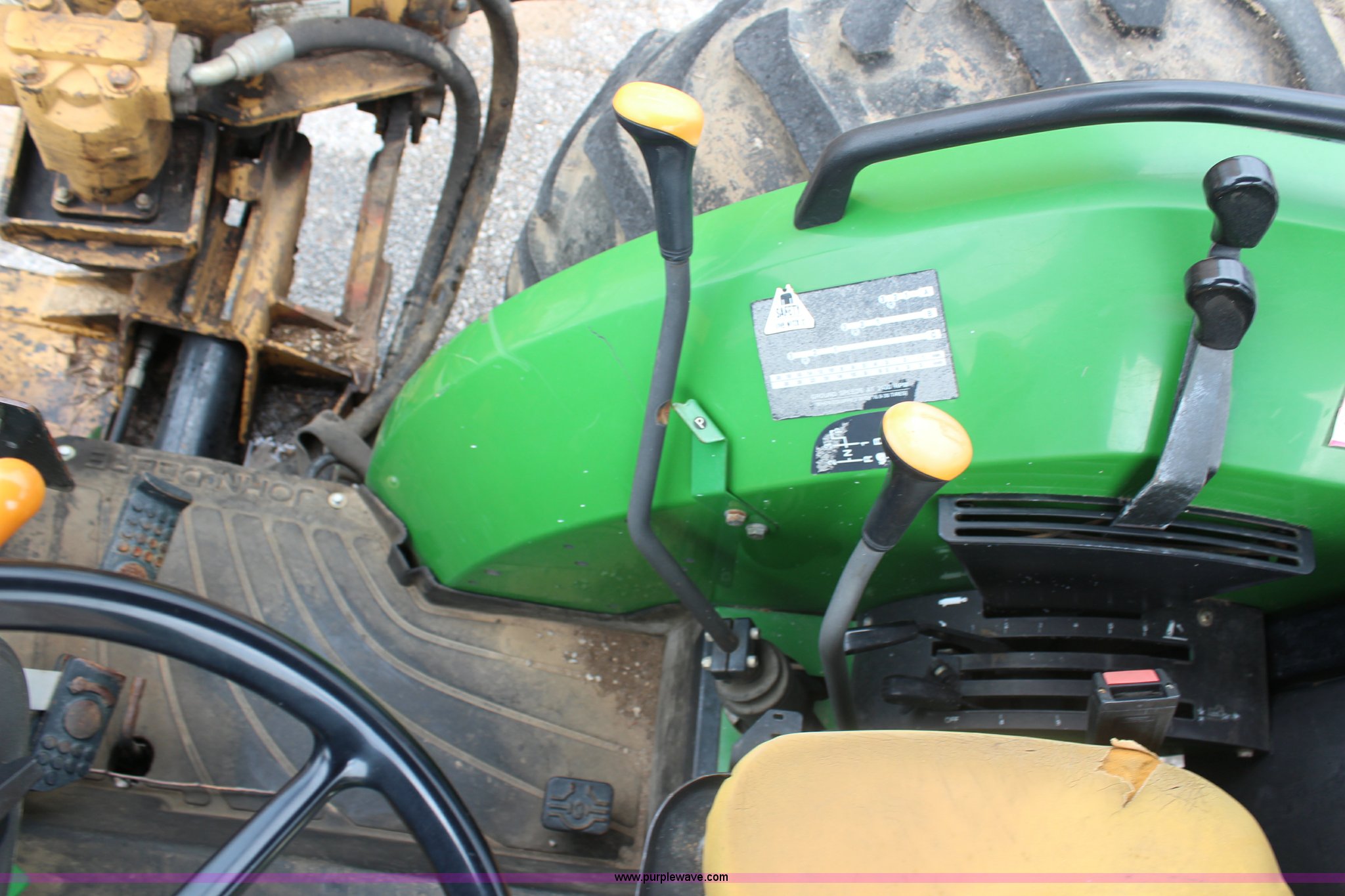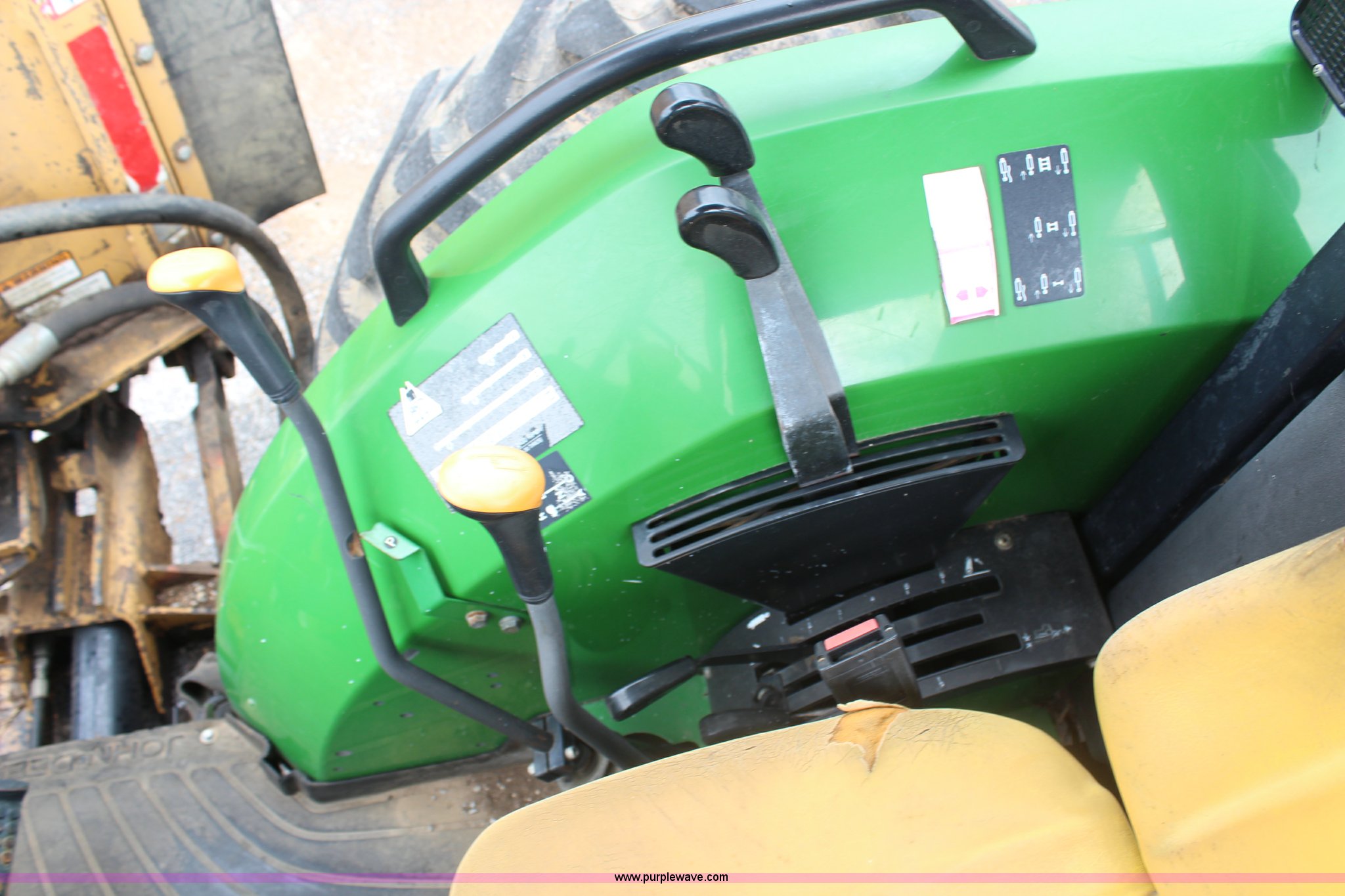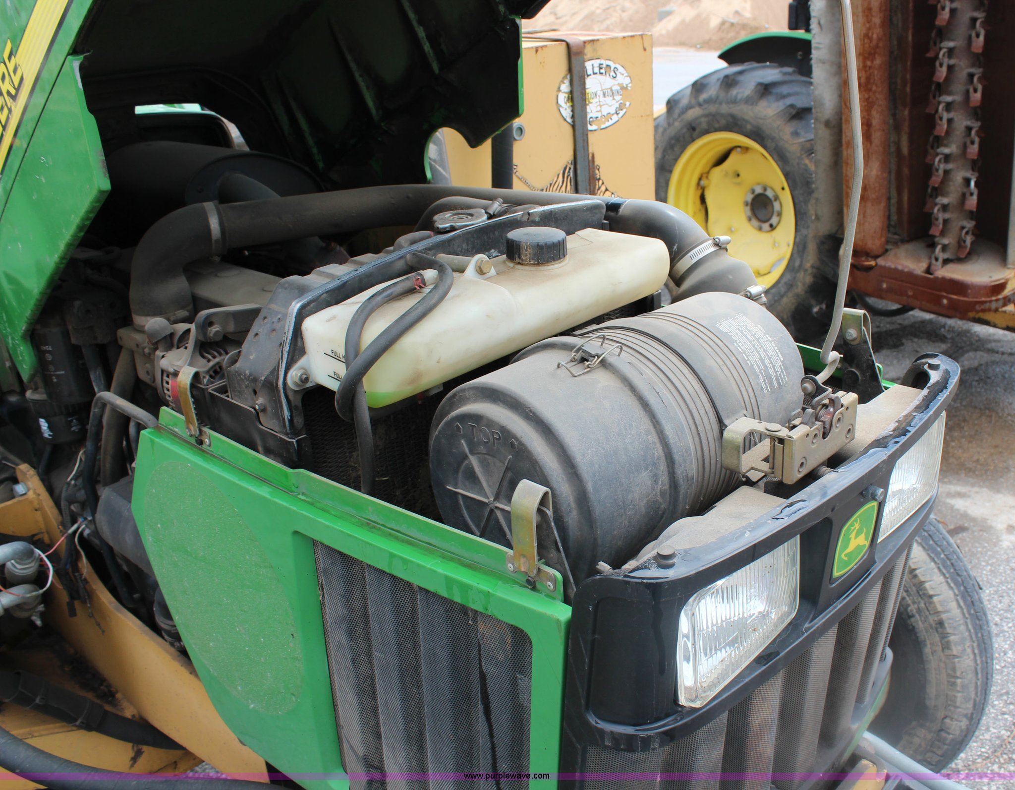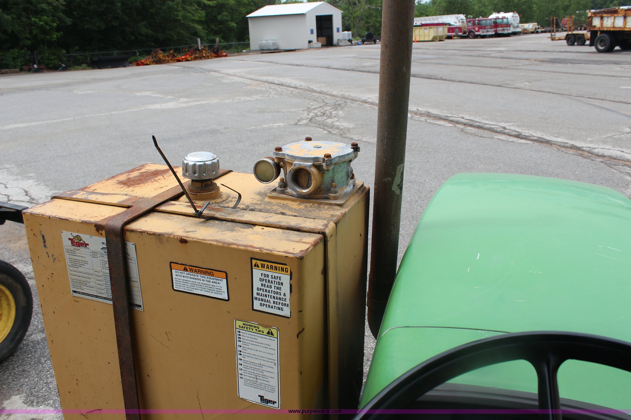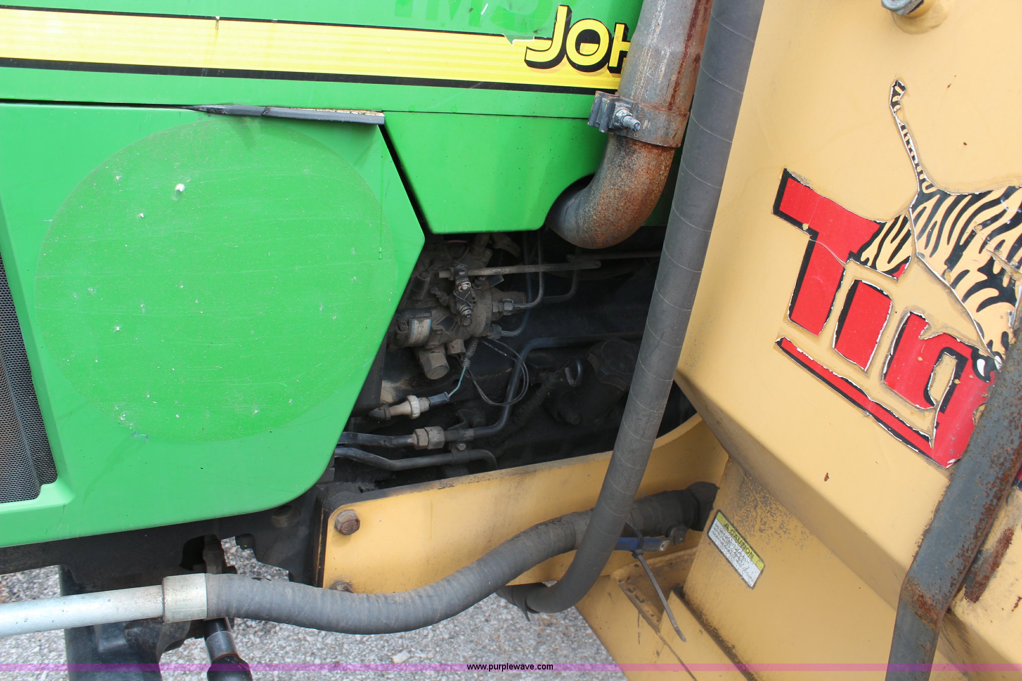 Purple Wave is selling a used Tractor in Kansas. This item is a 2003 John Deere 5420 tractor with the following: 2,892 hours on meter, John Deere 4.5L four cylinder diesel engine, 65 HP, Serial PE4045D263396, Shuttle synch transmission, 9F-3R gears, Canopy, Flashers, Vinyl seat, Three point, 540 PTO, (2) sets of rear hydraulic remotes, 18,120 gallon fuel capacity, 225/75R15 front tires, Worn, 16.9-30 rear tires, Tiger flail mower system, 91" rear flail mower, 76" side flail mower, Serial LV5420S342788