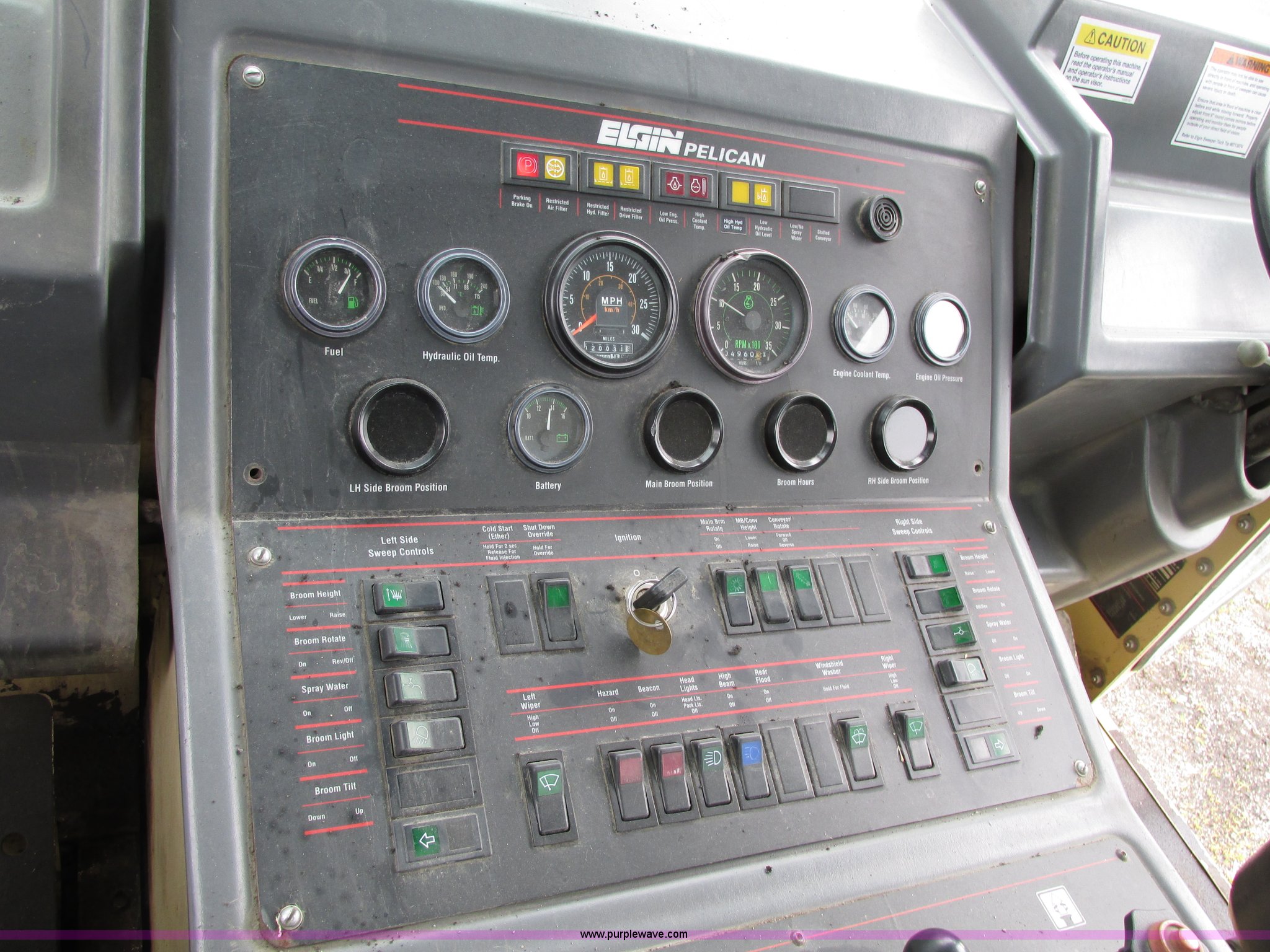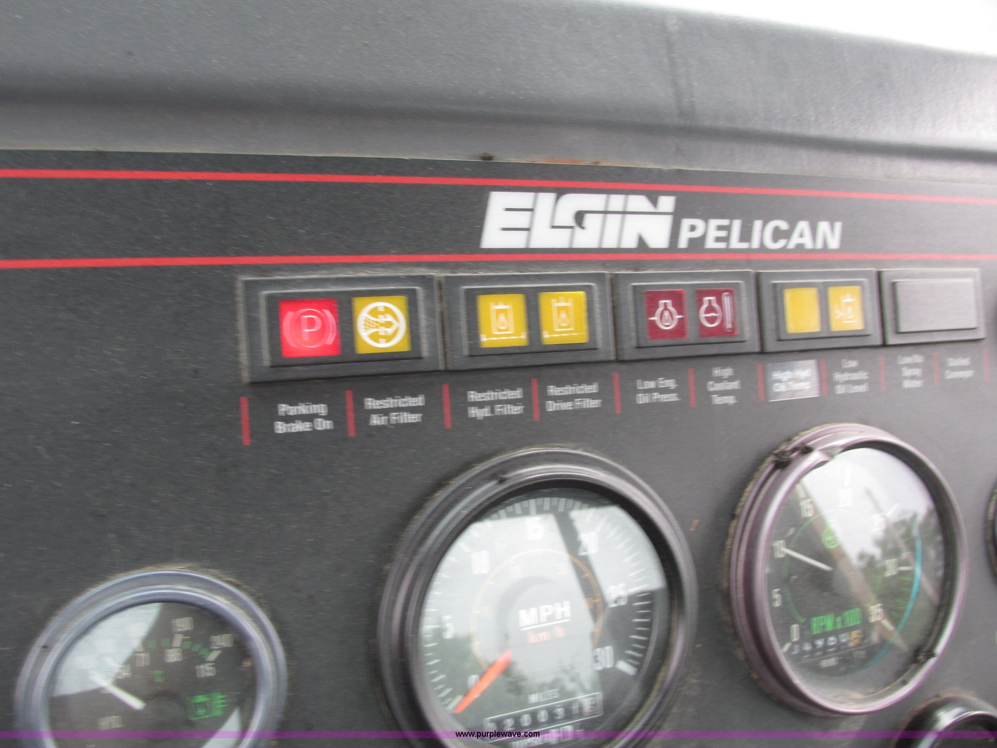 Purple Wave is selling a used Sweeper in Kansas. This item is a 1998 Elgin Pelican P series street sweeper with the following: 20,031 miles on odometer, 4,960 hours on meter, Four cylinder diesel engine, AC and heat, Cloth interior, Rear sliding window, 66" x 28" rear broom, 24" side bristles, 11R22.5 front tires, 9R17.5 rear tires