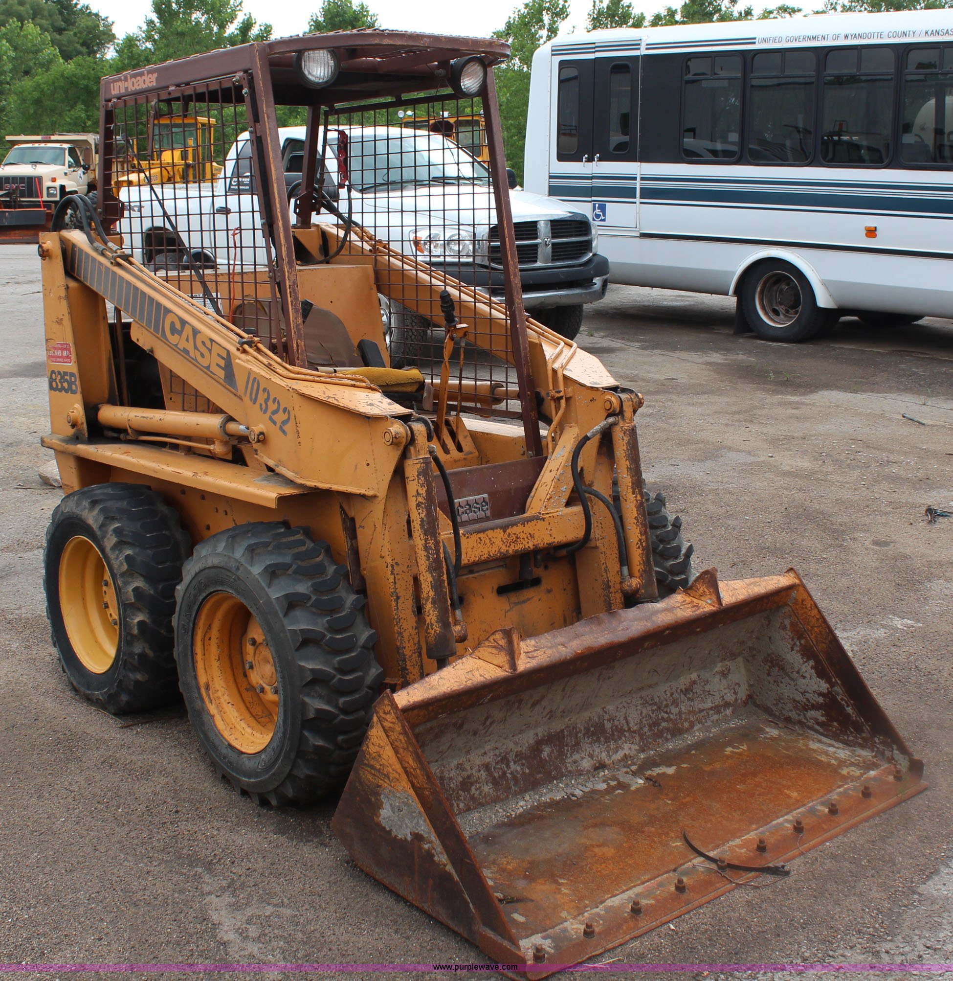 Case 1835B Uniloader skid steer. 3,069 hours on meter, Four cylinder diesel engine, Hydrostatic transmission, OROPS, D10 5'L x 28"W x 18"H bucket Bolt-on cutting edge, Hydraulic quick coupler, Front and rear work lights, Auxiliary hydraulics, Dynamo 10-16.5 tires Tires flat, Unit will not start, Unknown operating condition. Unified Government of Wyandotte County. 5033 State Avenue. Kansas City, KS 66102