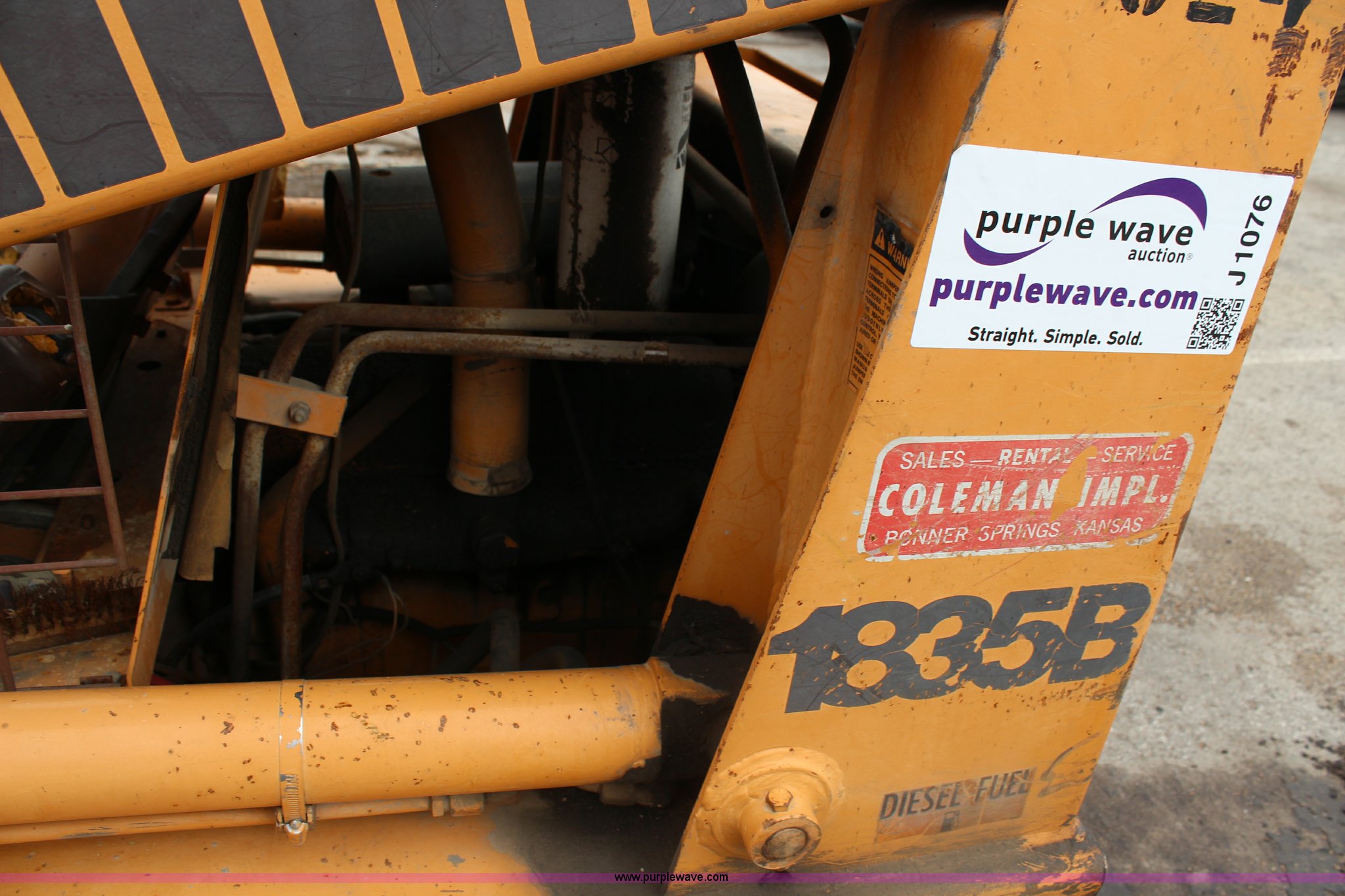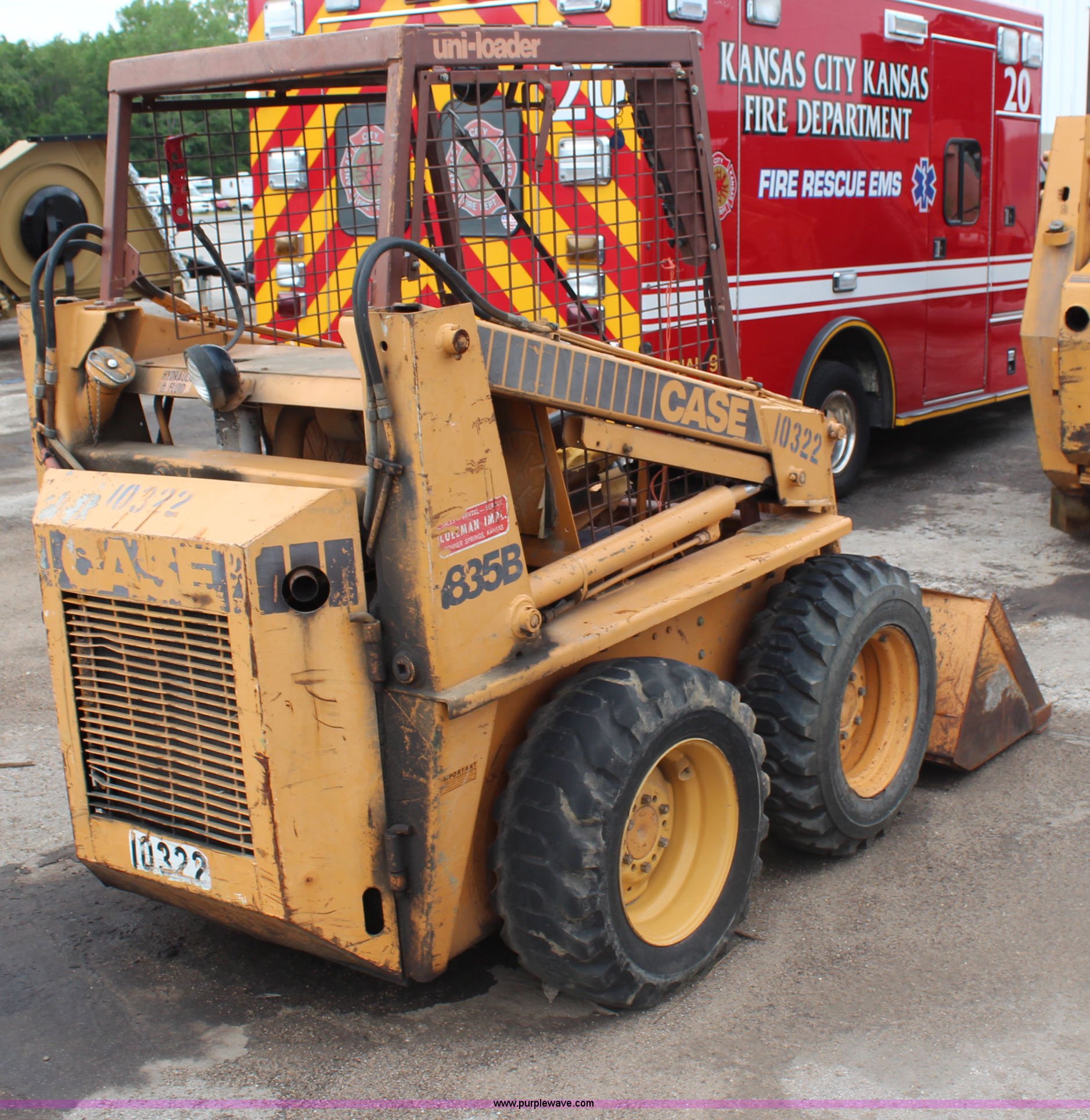 Purple Wave is selling a used Skid Steer Loader in Kansas. This item is a Case 1835B Uniloader skid steer with the following: 3,069 hours on meter, Four cylinder diesel engine, Hydrostatic transmission, OROPS, D10 5'L x 28"W x 18"H bucket, Bolt-on cutting edge, Hydraulic quick coupler, Front and rear work lights, Auxiliary hydraulics, Dynamo 10-16.5 tires, Tires flat, Unit will not start, Unknown operating condition
