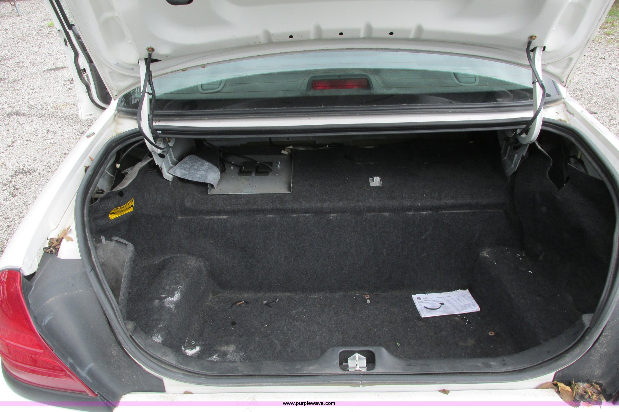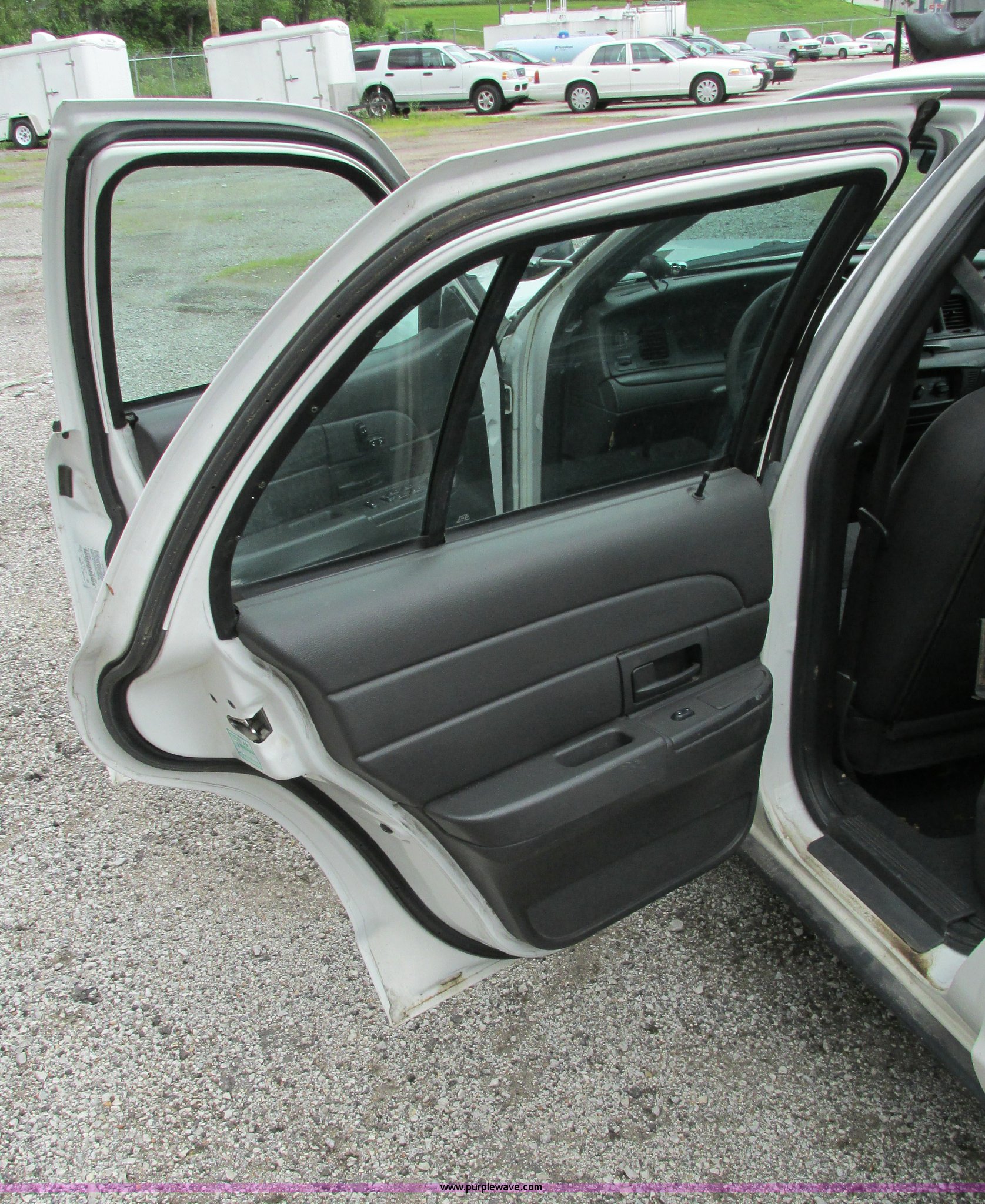 Purple Wave is selling a used Passenger Vehicle in Kansas. This item is a 2005 Ford Crown Victoria Police Interceptor with the following: 107,390 miles on odometer, 4.6L V8 SOHC 16V gas engine, Automatic transmission, AC and heat, Tilt, Cruise, AM/FM, Power windows, locks, mirrors, and seats, Cloth interior, Spotlight, 225/60R16 tires, Driver's side interior door panel loose, Hole in roof from equipment, Rust, Paint peeling, Front end cosmetic damage, Driver's side mirror missing