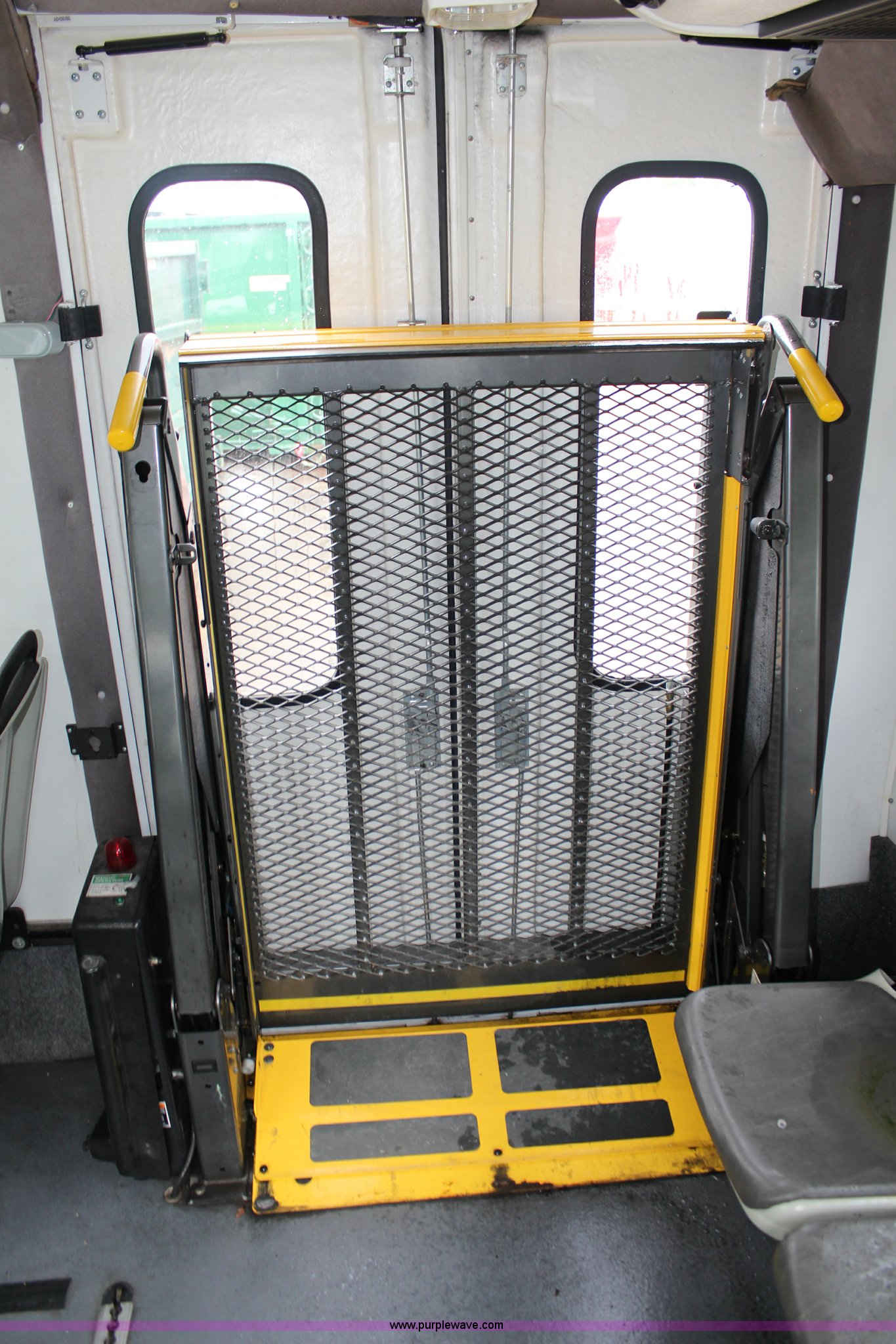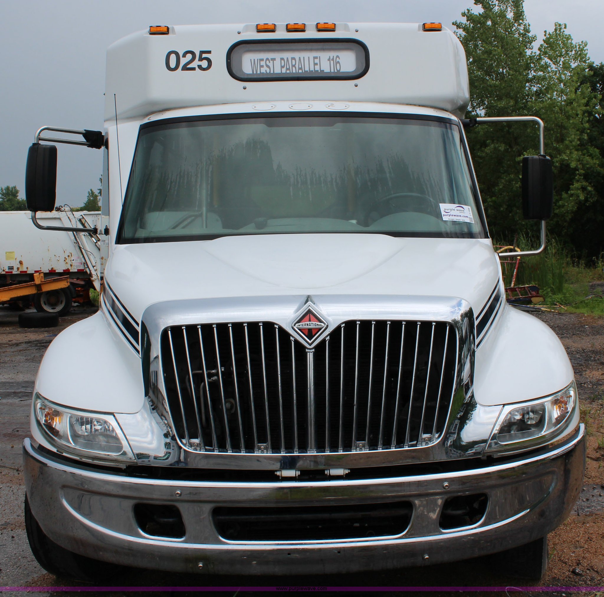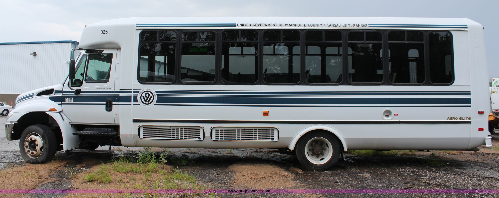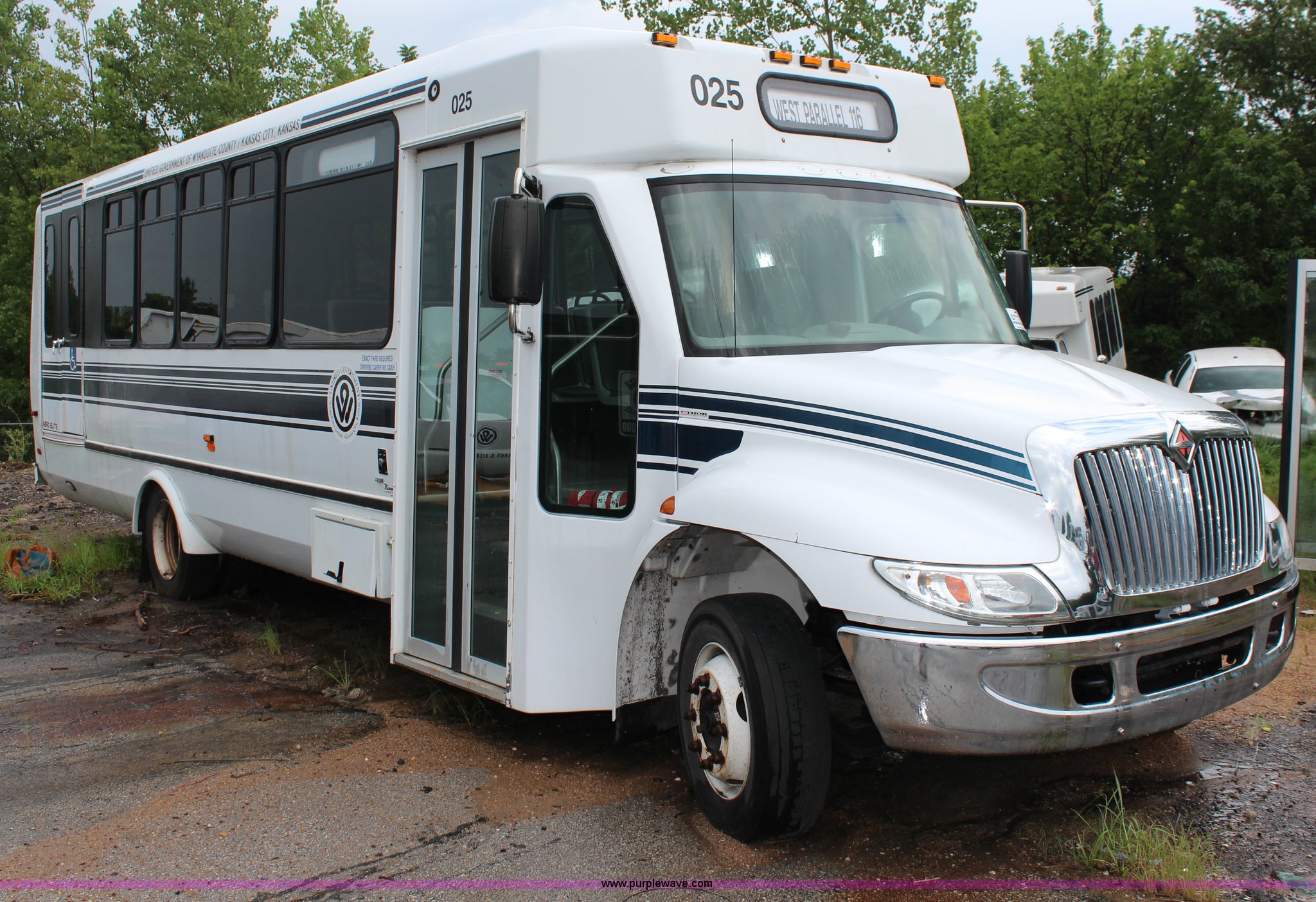 Purple Wave is selling a used Bus in Kansas. This item is a 2007 International 3200 bus with the following: 68,719 miles on odometer, International 6.0L V8 diesel engine, Automatic transmission, AC and heat, Tilt, Cruise, Manual windows and locks, Vinyl interior, 28 passenger capacity, Wheelchair ramp, Air brakes, 245/70R19.5 tires, Batteries are unhooked, Fuel cap missing, Belt on engine broken, Unknown operating condition