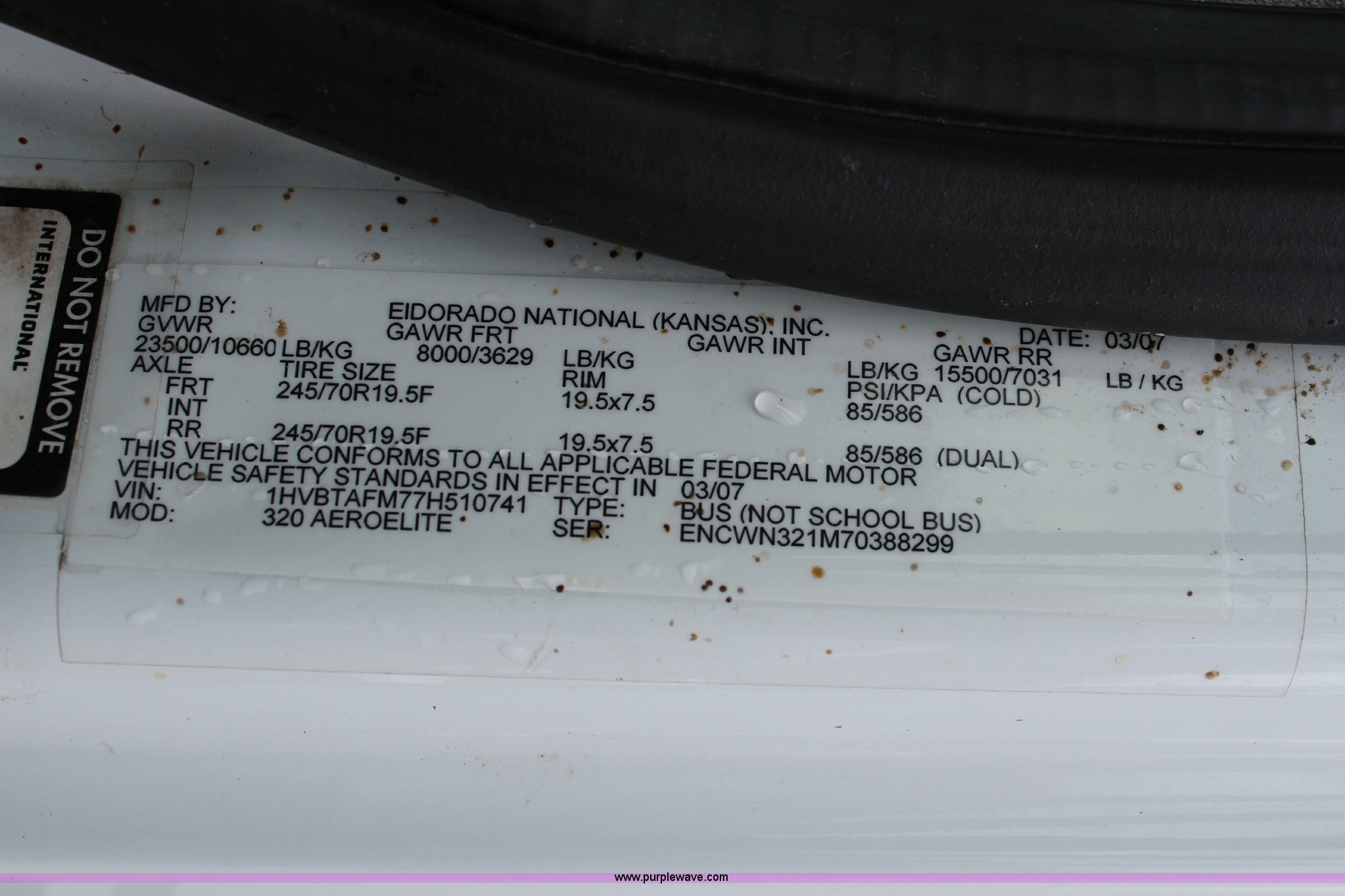 2007 International 3200 bus. 68,719 miles on odometer, International 6.0L V8 diesel engine, Automatic transmission, AC and heat, Tilt, Cruise, Manual windows and locks, Vinyl interior, 28 passenger capacity, Wheelchair ramp, Air brakes, 245/70R19.5 tires, Batteries are unhooked, Fuel cap missing, Belt on engine broken, Unknown operating condition. 1HVBTAFM77H510741. Unified Government of Wyandotte County. 5033 State Avenue. Kansas City, KS 66102