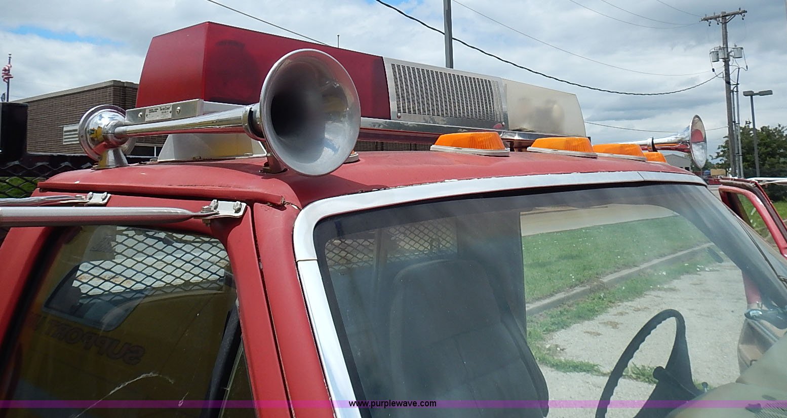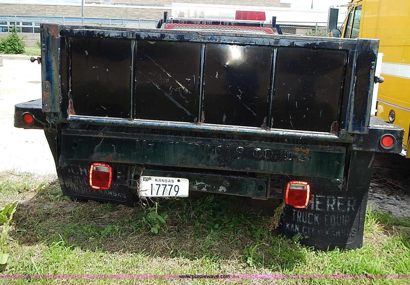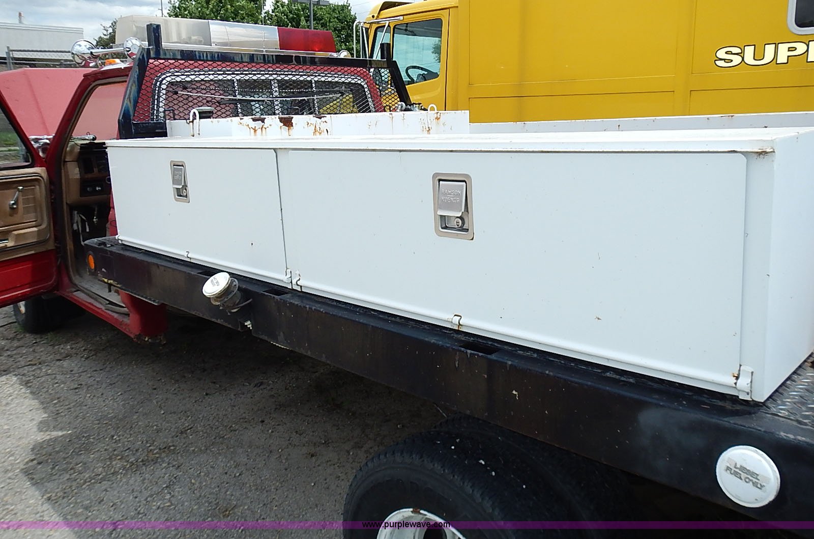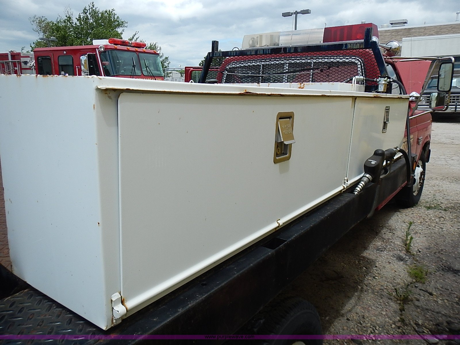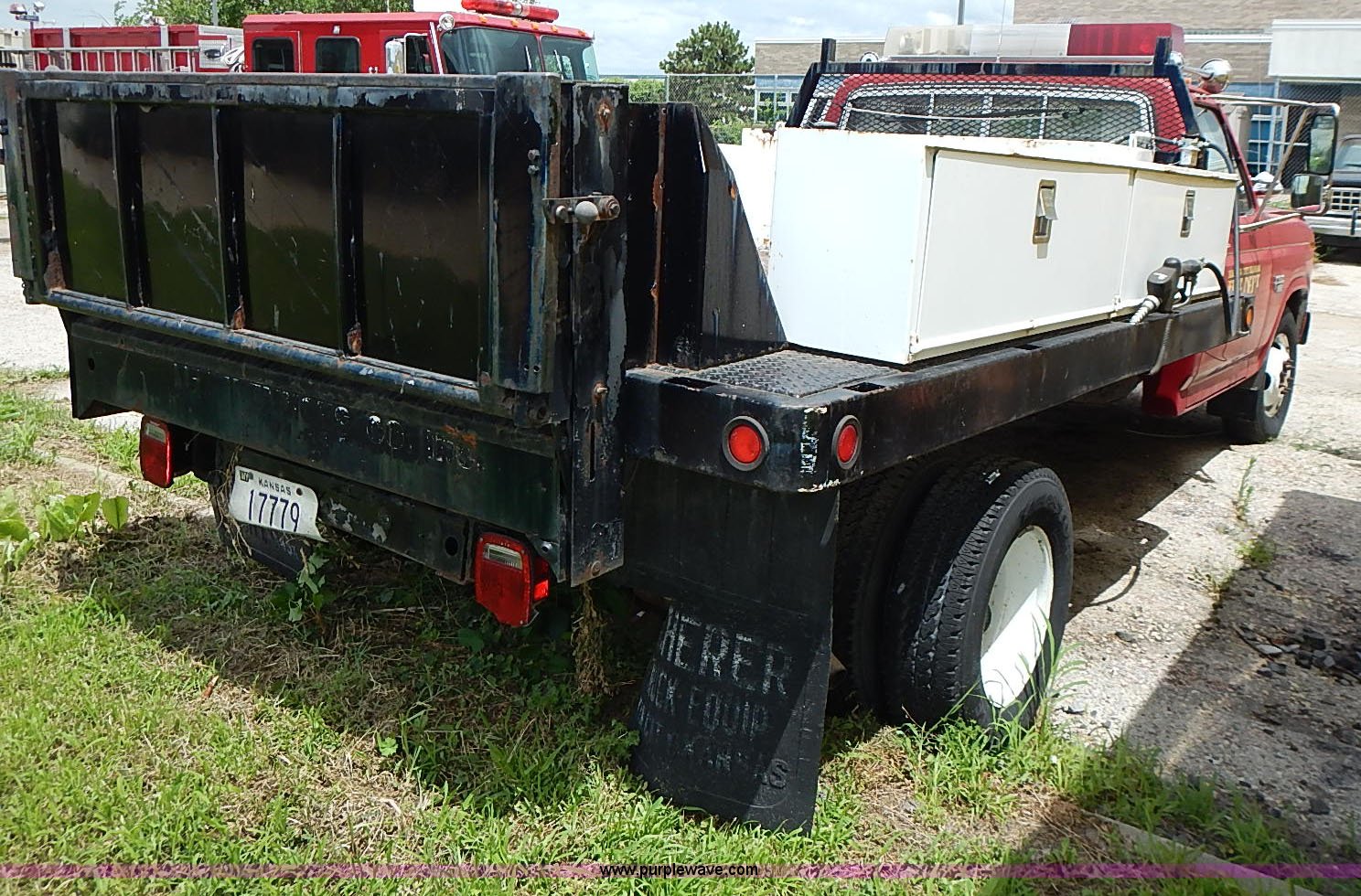 1984 Ford F350 flatbed truck. 47,257 miles on odometer, 7.3L V8 diesel engine, Automatic transmission, AC and heat, AM, Manual windows and locks, Cloth interior, Spotlight, Light bar, 10'5"L x 93"W flatbed Lift gate, (2) toolboxes 8'L, 100 gallon fuel tank, 215/85R16 tires, Vehicle will not start, Batteries dead, Rust. 1FDKF3718EKA17305. Unified Government of Wyandotte County. 444 Kindleberger Road. Kansas City, KS 66115