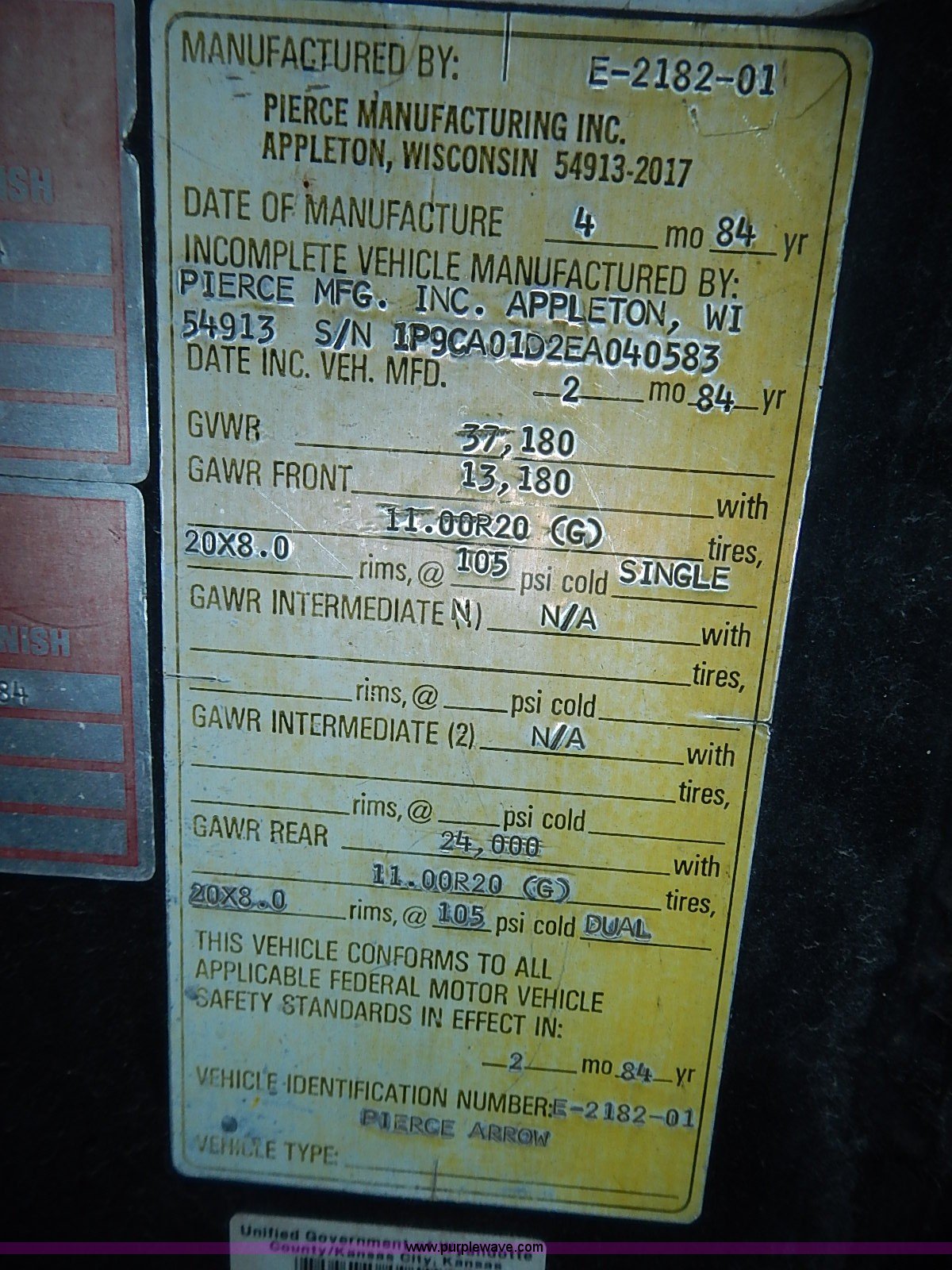 1984 Pierce fire truck. 109,295 miles on odometer, Detroit Diesel V8 diesel engine, Automatic transmission, (2) hose reels, 1,250 gallon per minute pump, 12R22.5 tires, 37,180 GVWR , FAWR 13,180 lbs, RAWR 24,000 lbs, Unknown operating condition. 1P9CA01D2EA040583. Unified Government of Wyandotte County. 5033 State Avenue. Kansas City, KS 66102