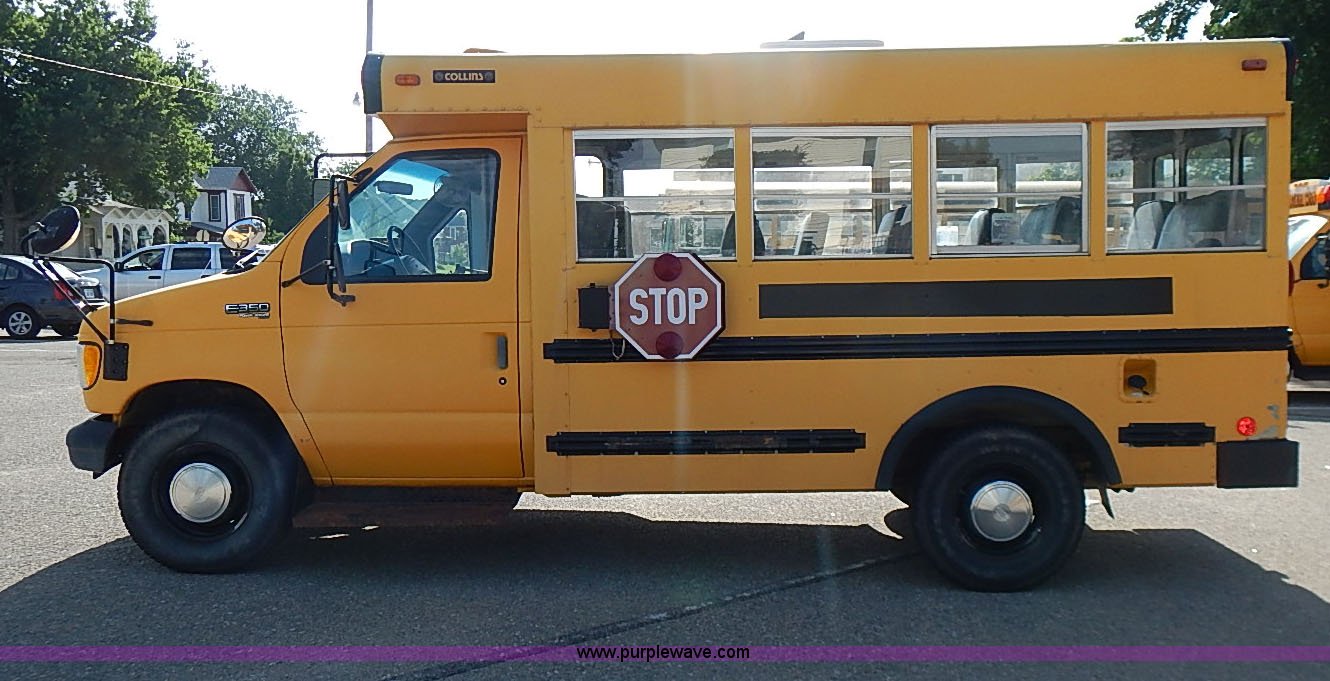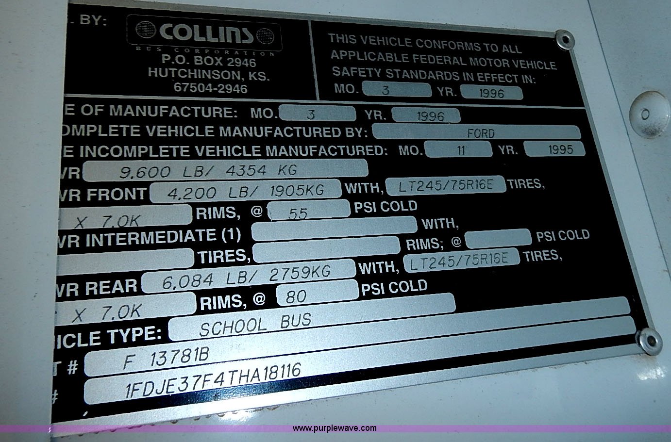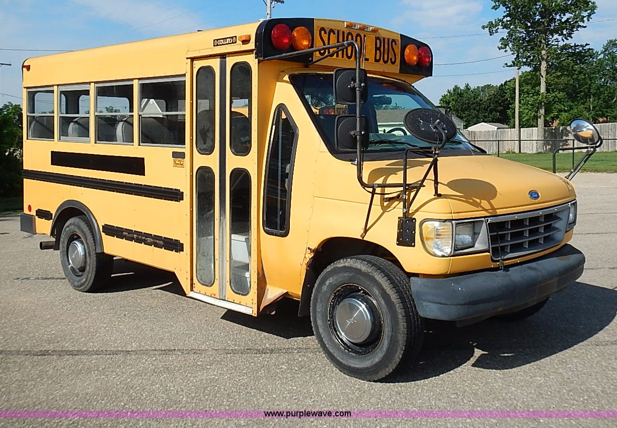 Purple Wave is selling a used Bus in Kansas. This item is a 1996 Ford E350 Collins school bus with the following: 139,758 miles on odometer, 7.3L V8 OHV 16V turbo diesel engine, Automatic transmission, Heat, AM/FM, AM/FM, Manual windows, Vinyl interior, Heated mirrors, 18 passenger capacity, Seatbelts, Block heater, 245/75R16 tires, GVWR 9,600 lbs, Dents and scratches, Rust, Paint peeling, Unit# 19