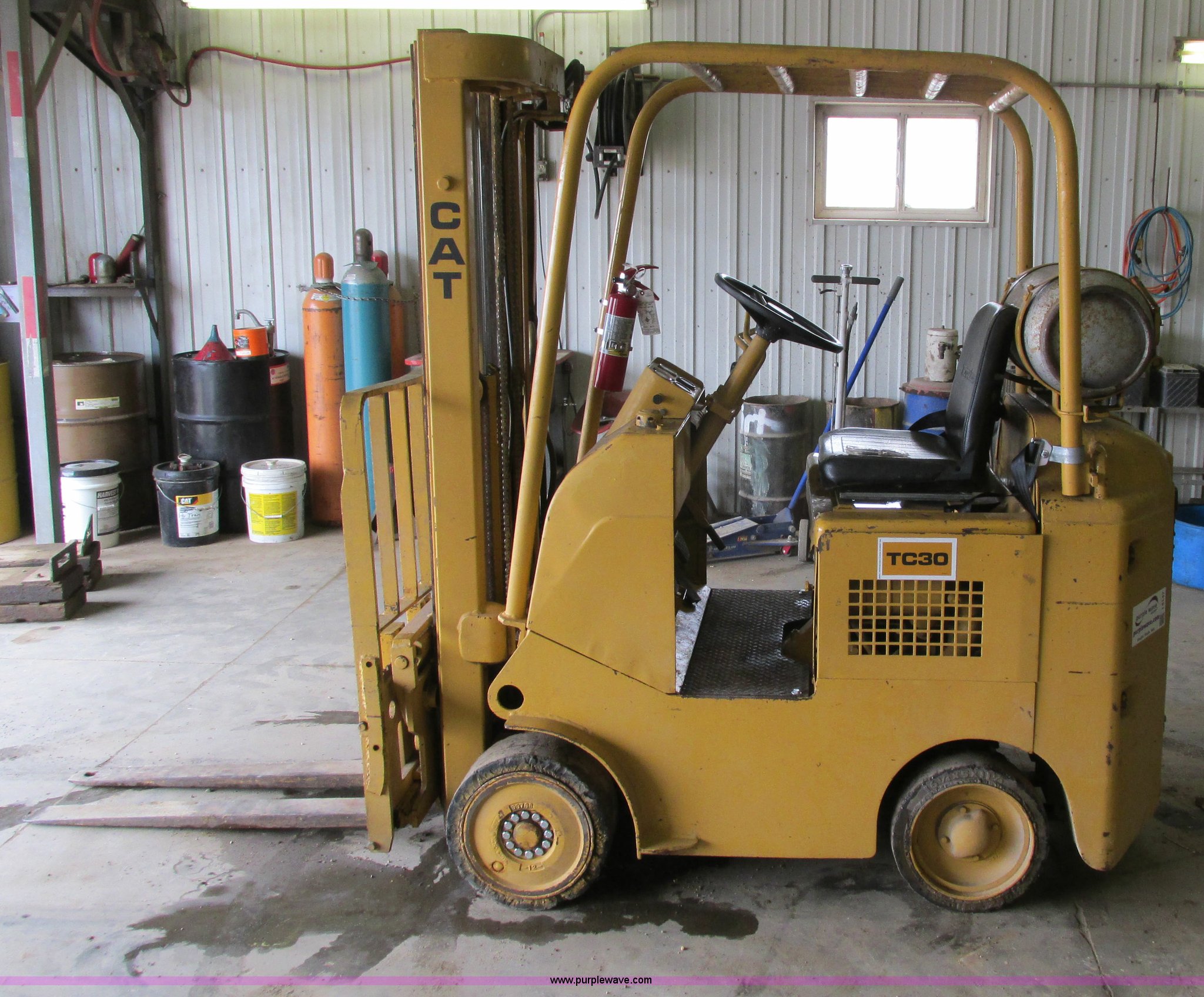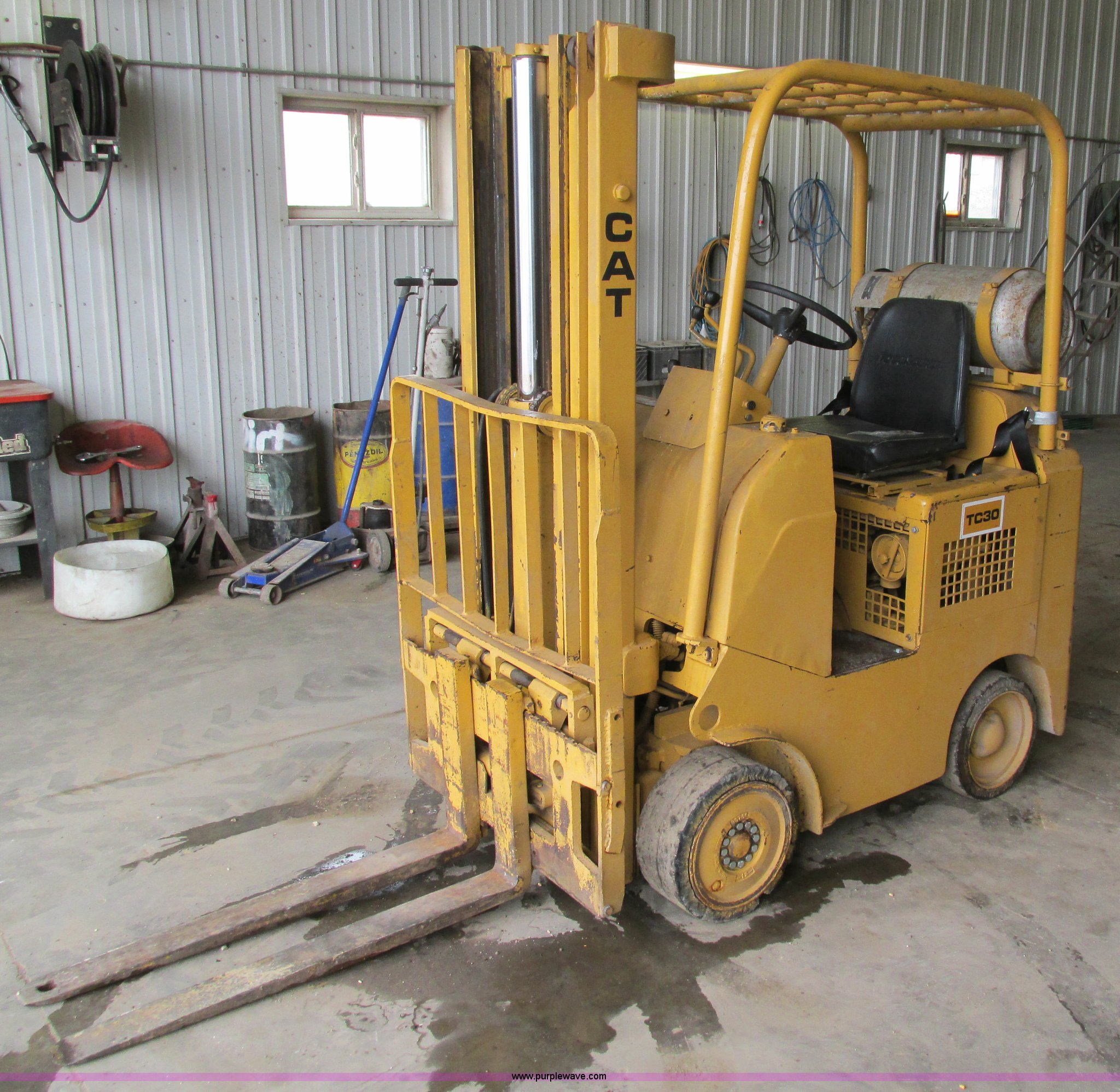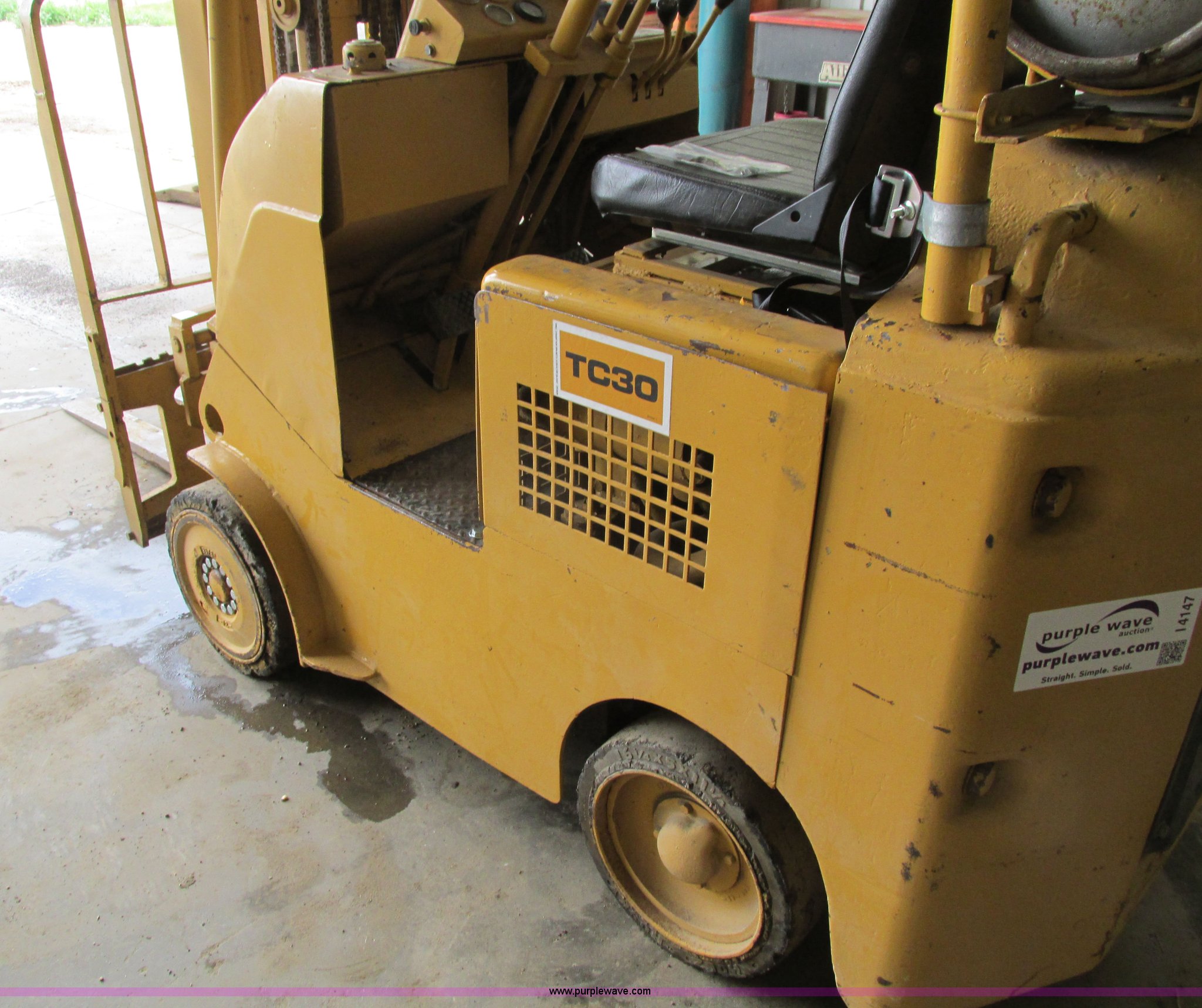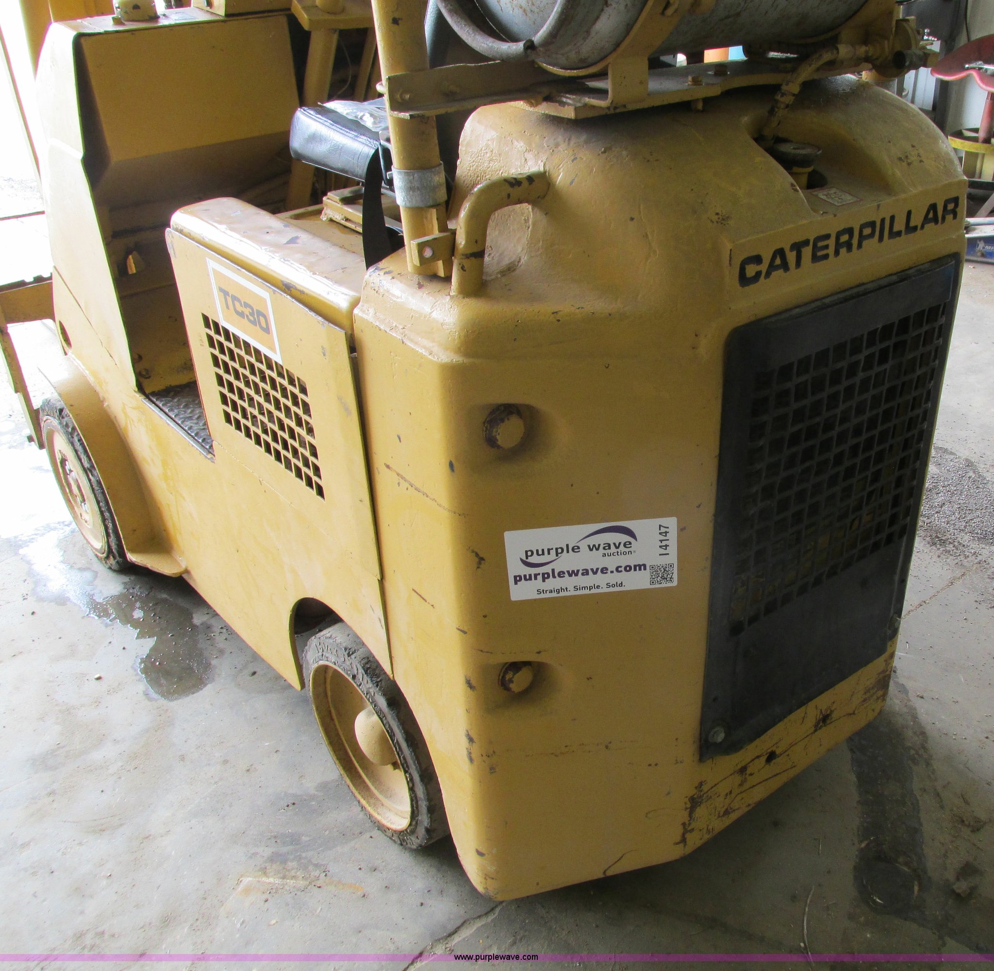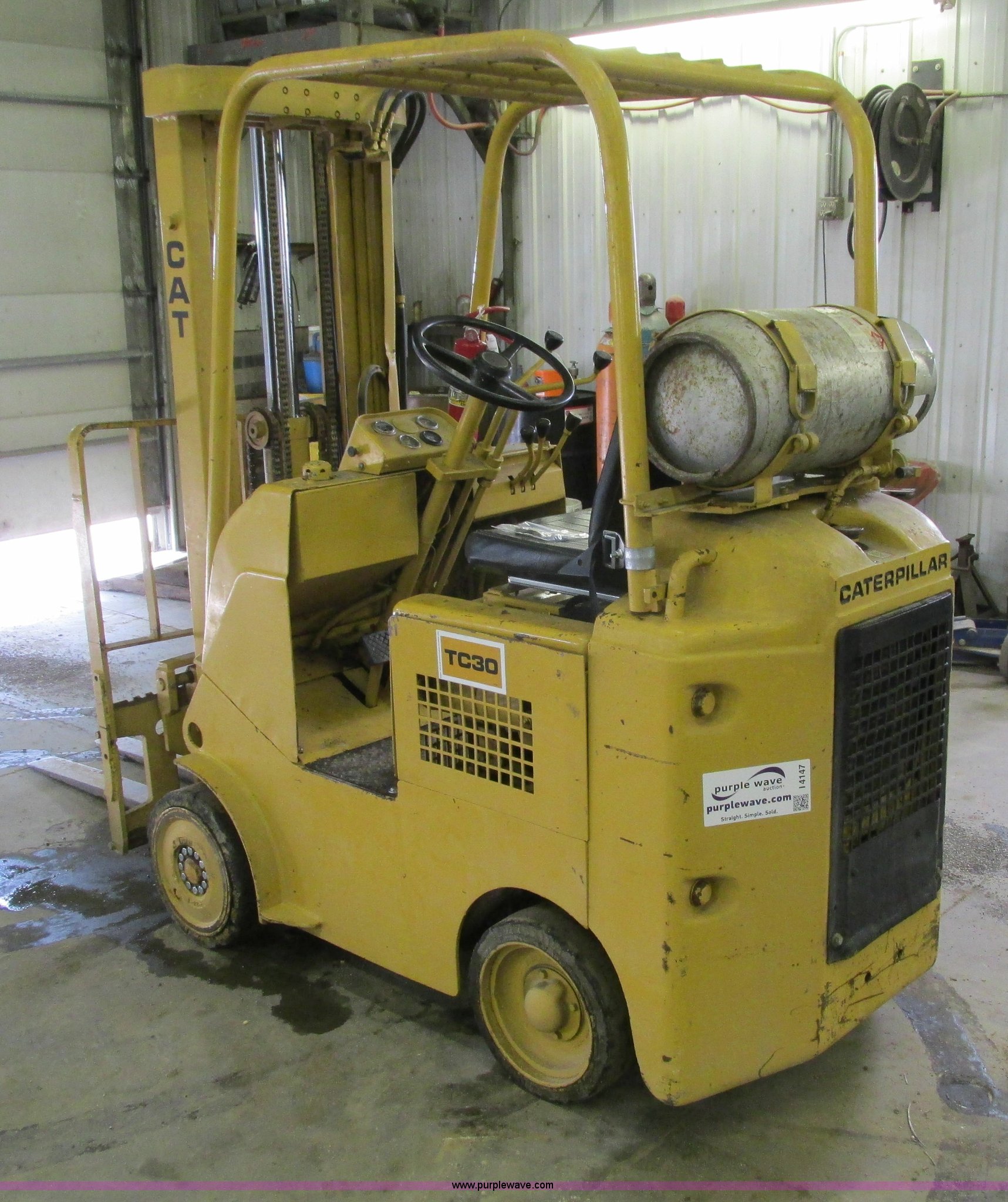 Purple Wave is selling a used Cushion Tire or Pneumatic Forklift in Iowa. This item is a Caterpillar TC30 forklift with the following: 6,432 hours on meter, Four cylinder LP engine, Two speed transmission, Block heater, 42"L forks, Three stage mast, Tilt, Side shift, 3,000 lbs capacity, LP tank included, Parking brake inoperable, Parts to be fixed included, Serial 12X1400