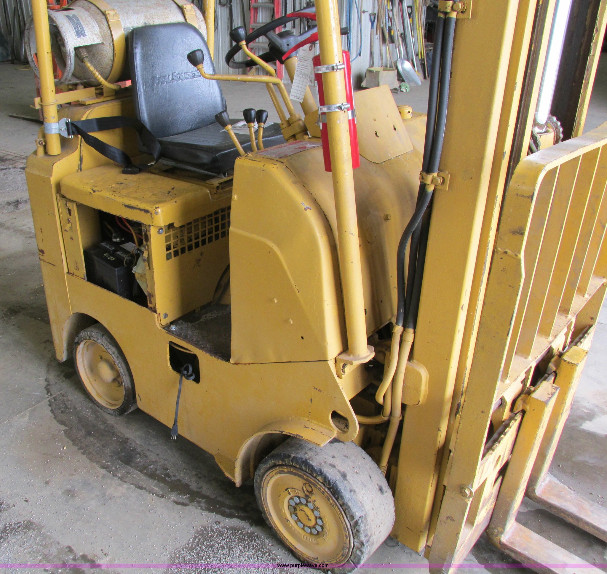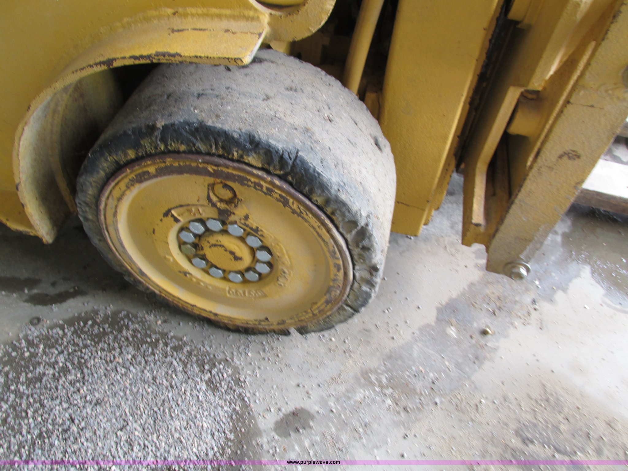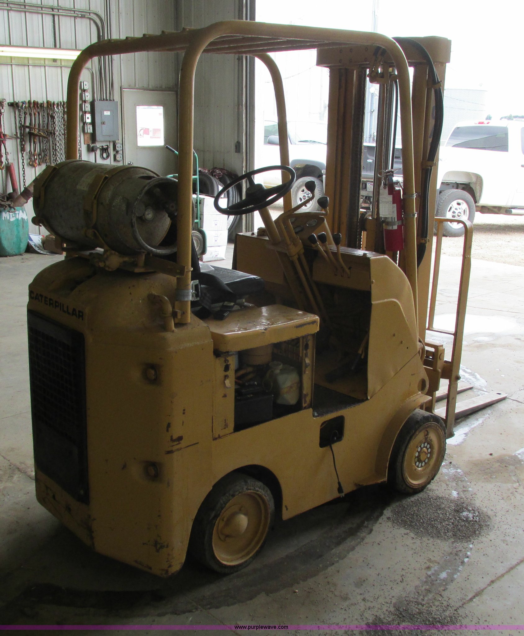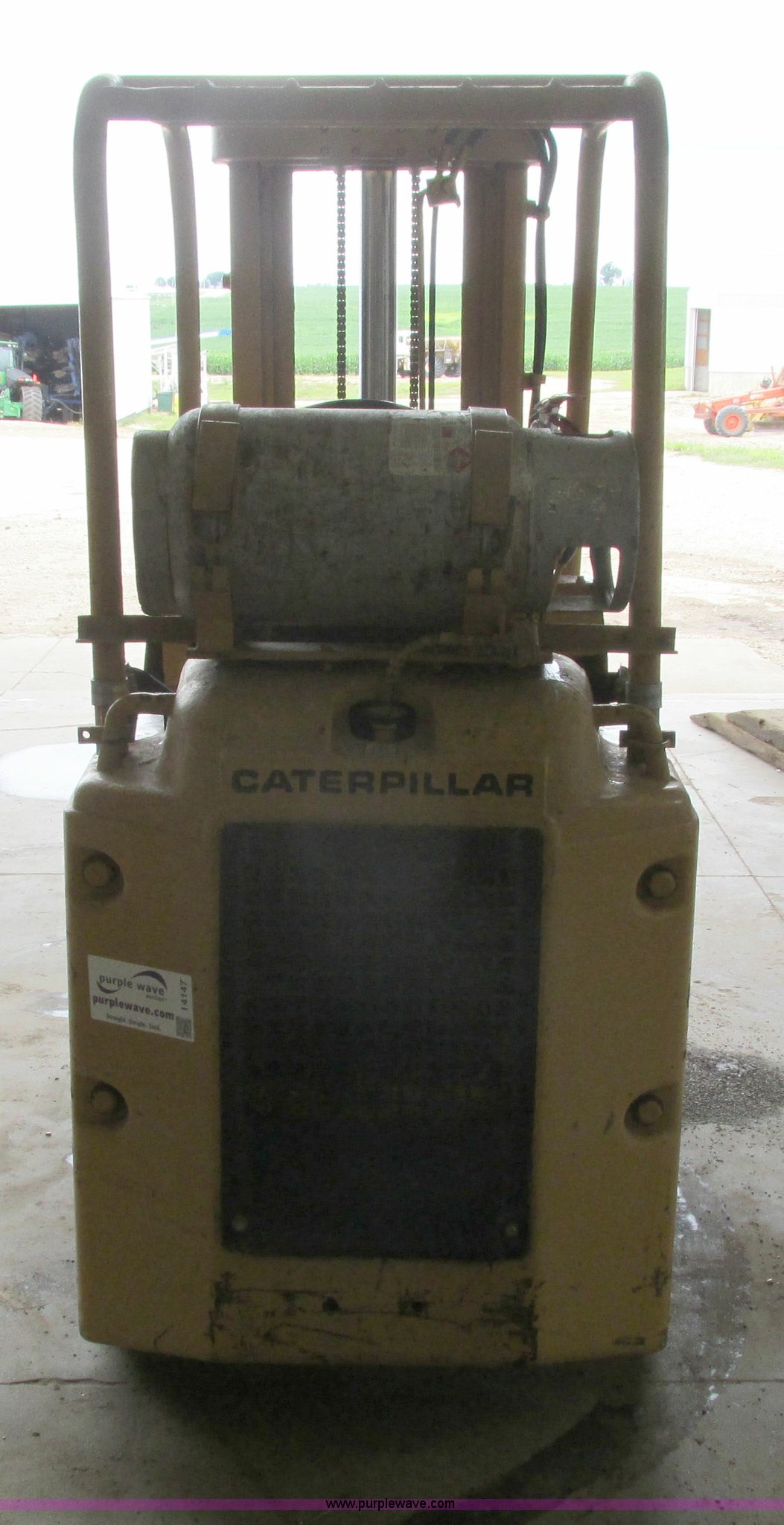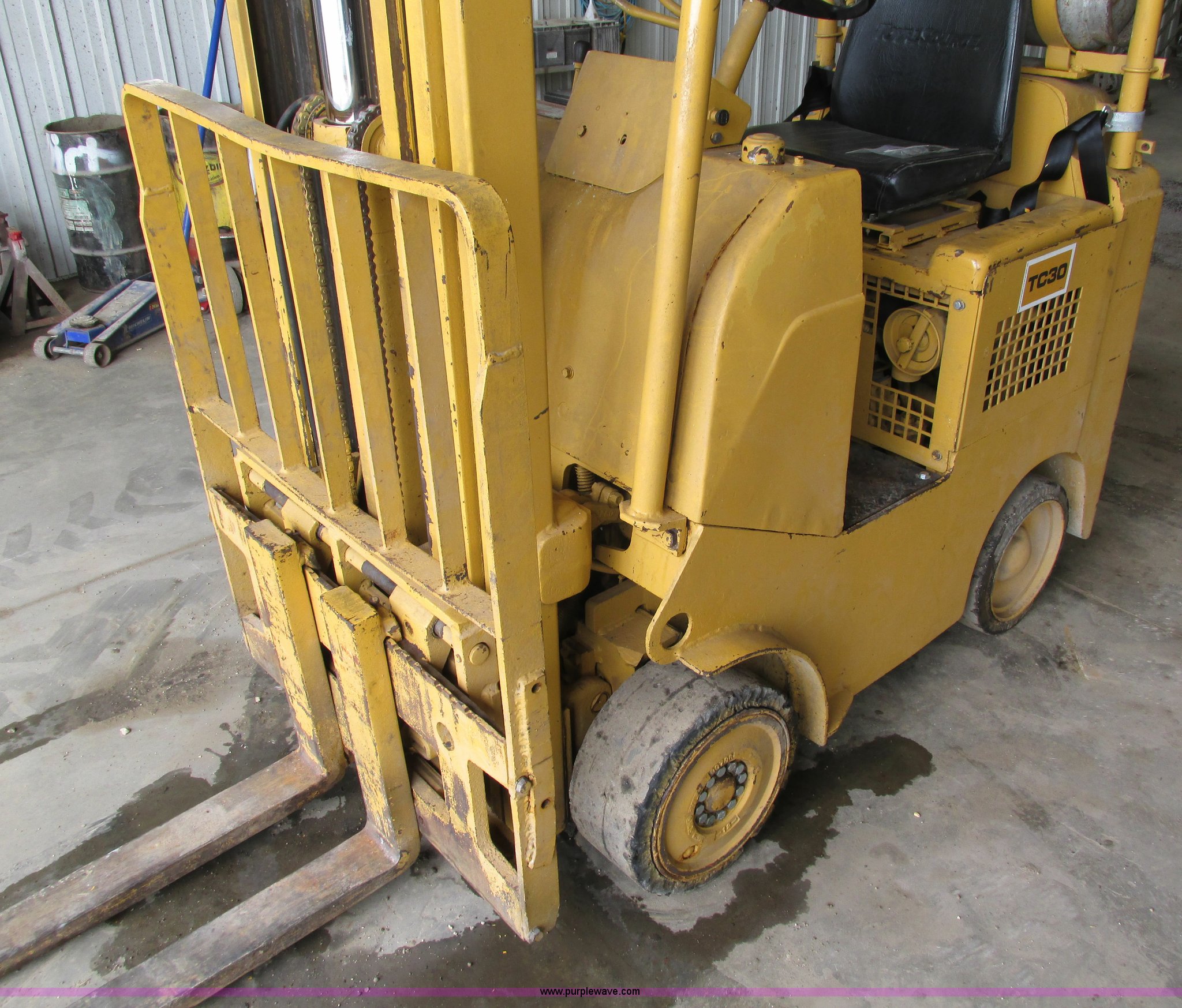 Purple Wave is selling a used Cushion Tire or Pneumatic Forklift in Iowa. This item is a Caterpillar TC30 forklift with the following: 6,432 hours on meter, Four cylinder LP engine, Two speed transmission, Block heater, 42"L forks, Three stage mast, Tilt, Side shift, 3,000 lbs capacity, LP tank included, Parking brake inoperable, Parts to be fixed included, Serial 12X1400