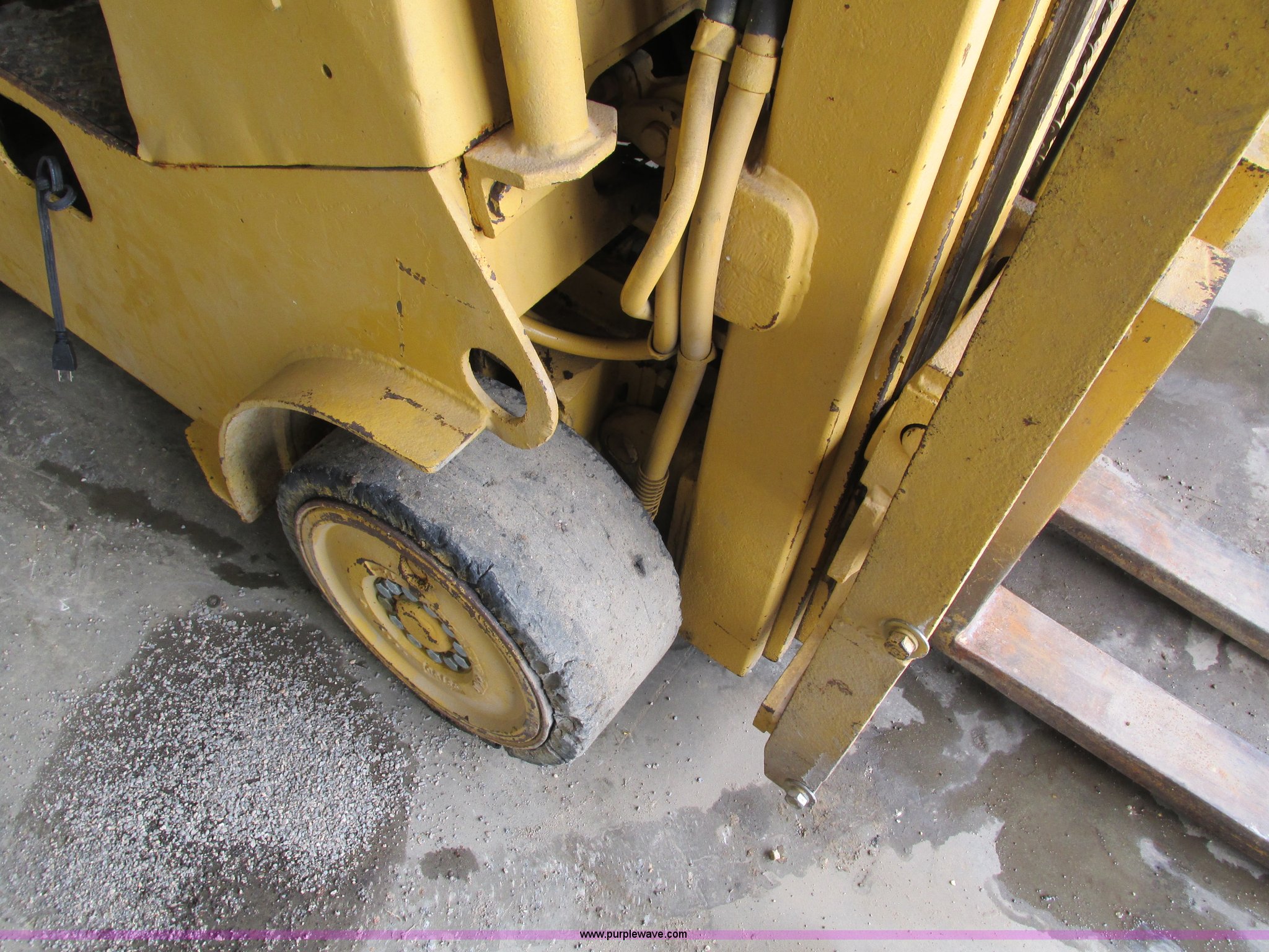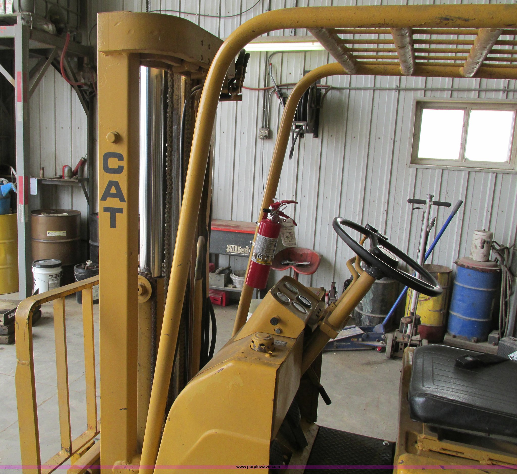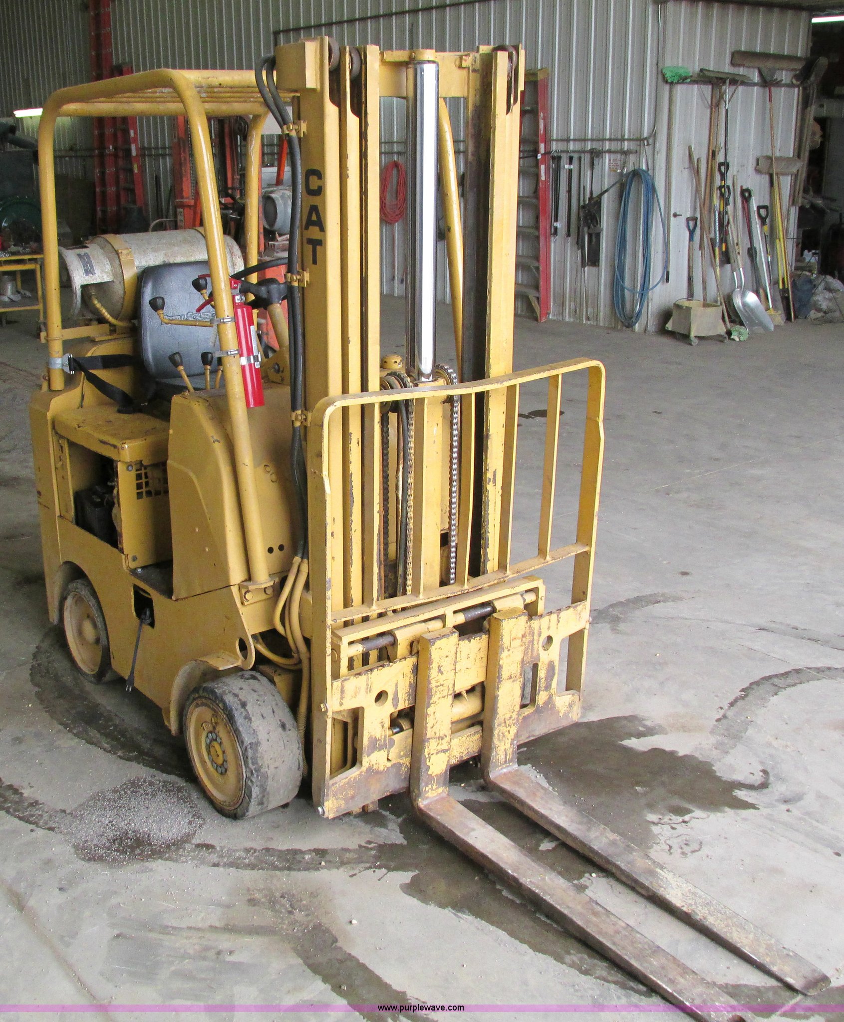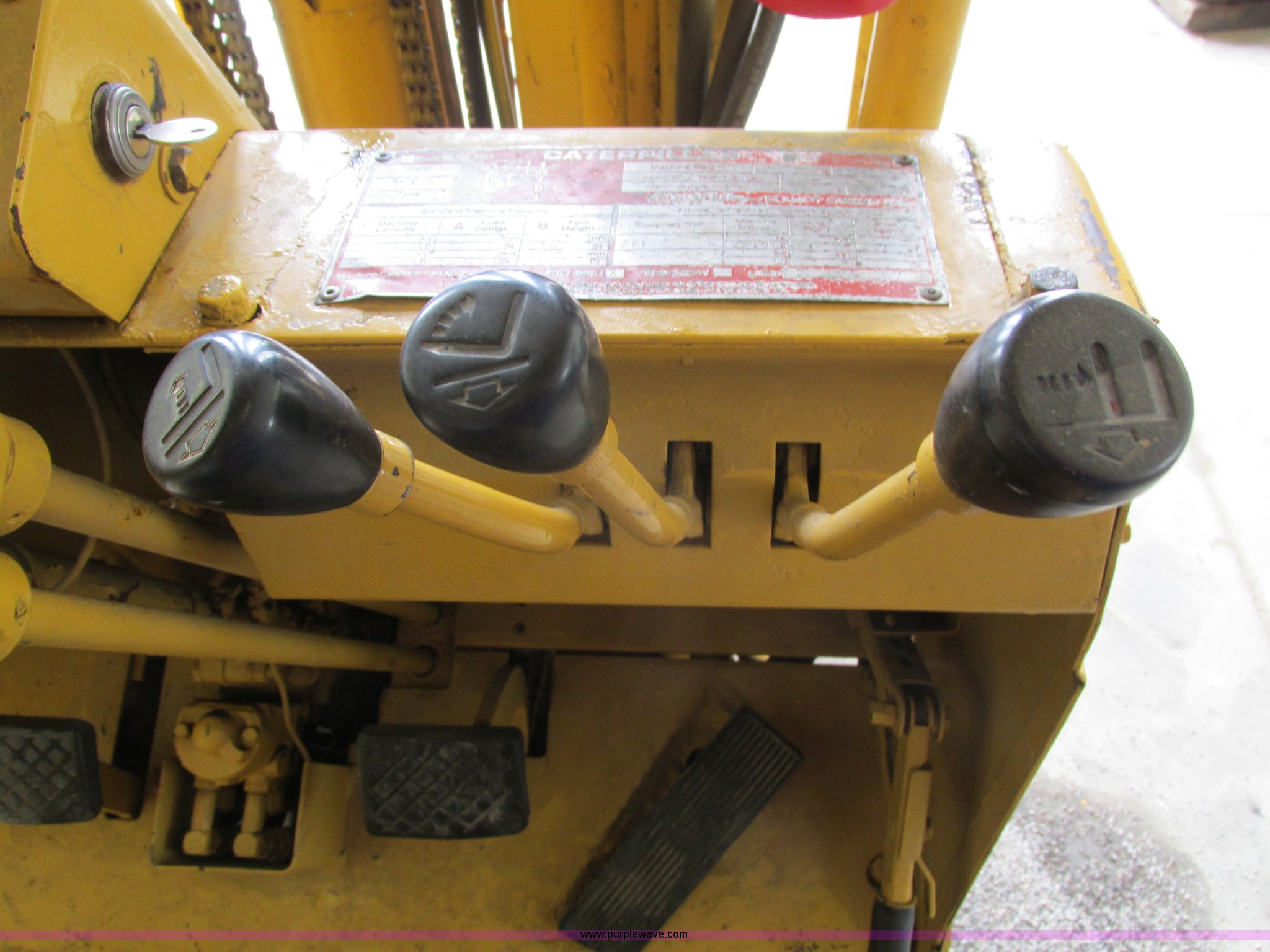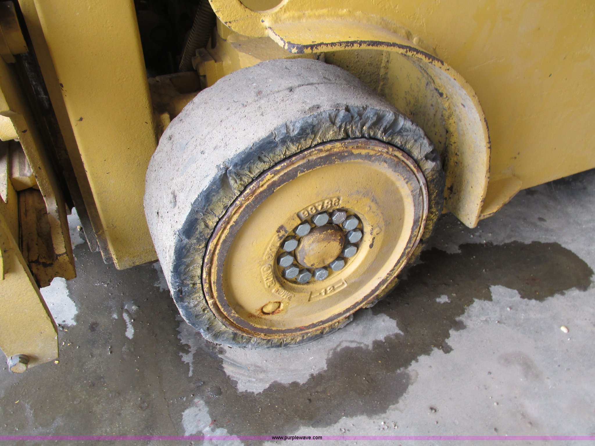 Purple Wave is selling a used Cushion Tire or Pneumatic Forklift in Iowa. This item is a Caterpillar TC30 forklift with the following: 6,432 hours on meter, Four cylinder LP engine, Two speed transmission, Block heater, 42"L forks, Three stage mast, Tilt, Side shift, 3,000 lbs capacity, LP tank included, Parking brake inoperable, Parts to be fixed included, Serial 12X1400