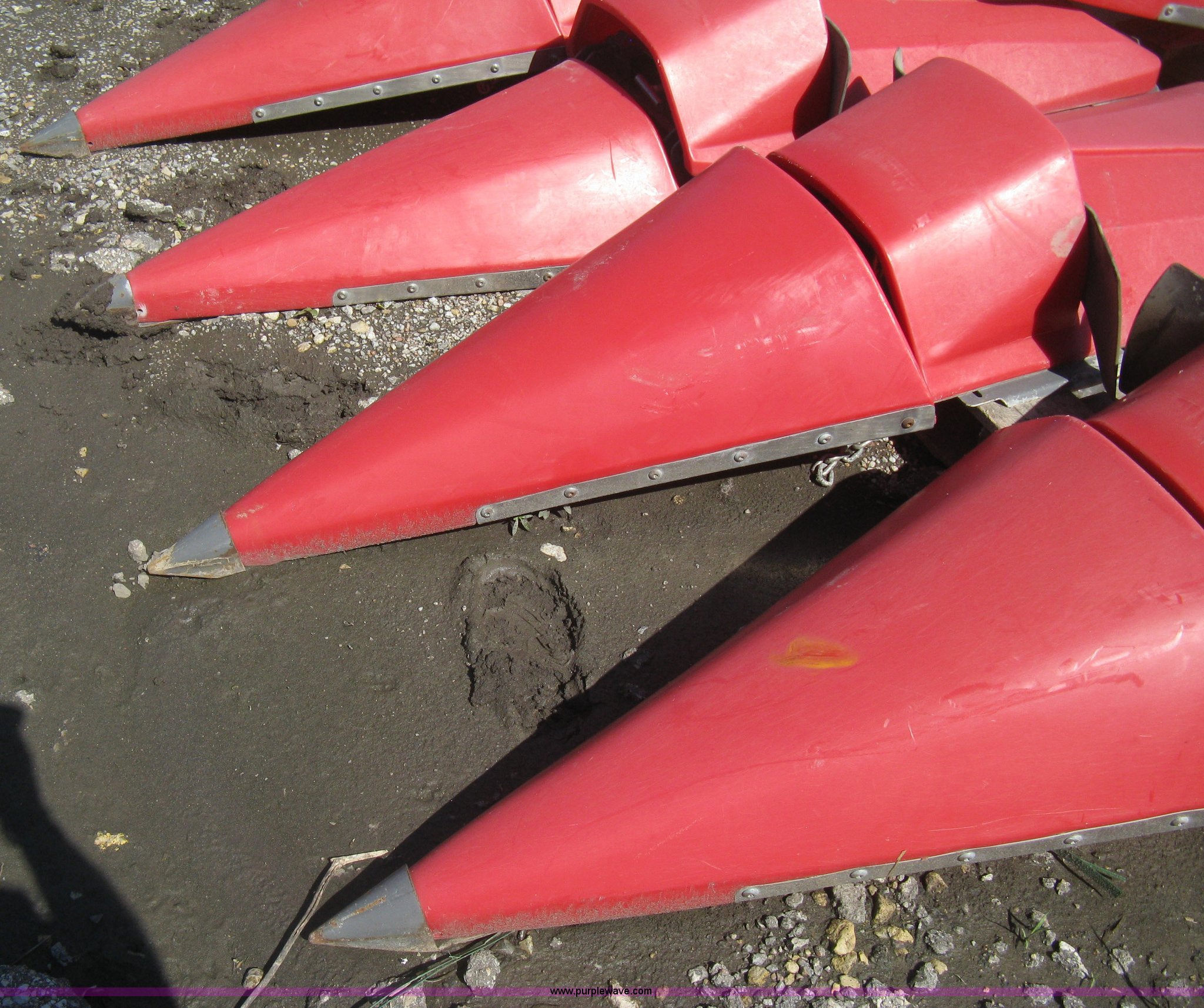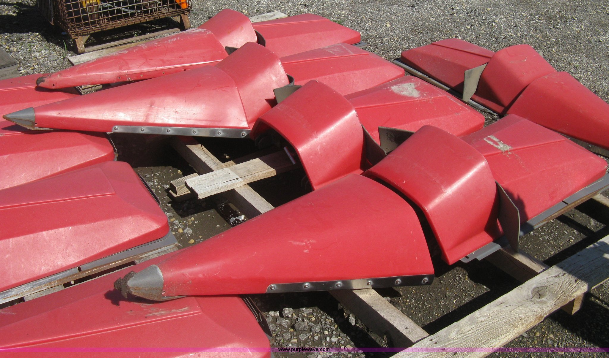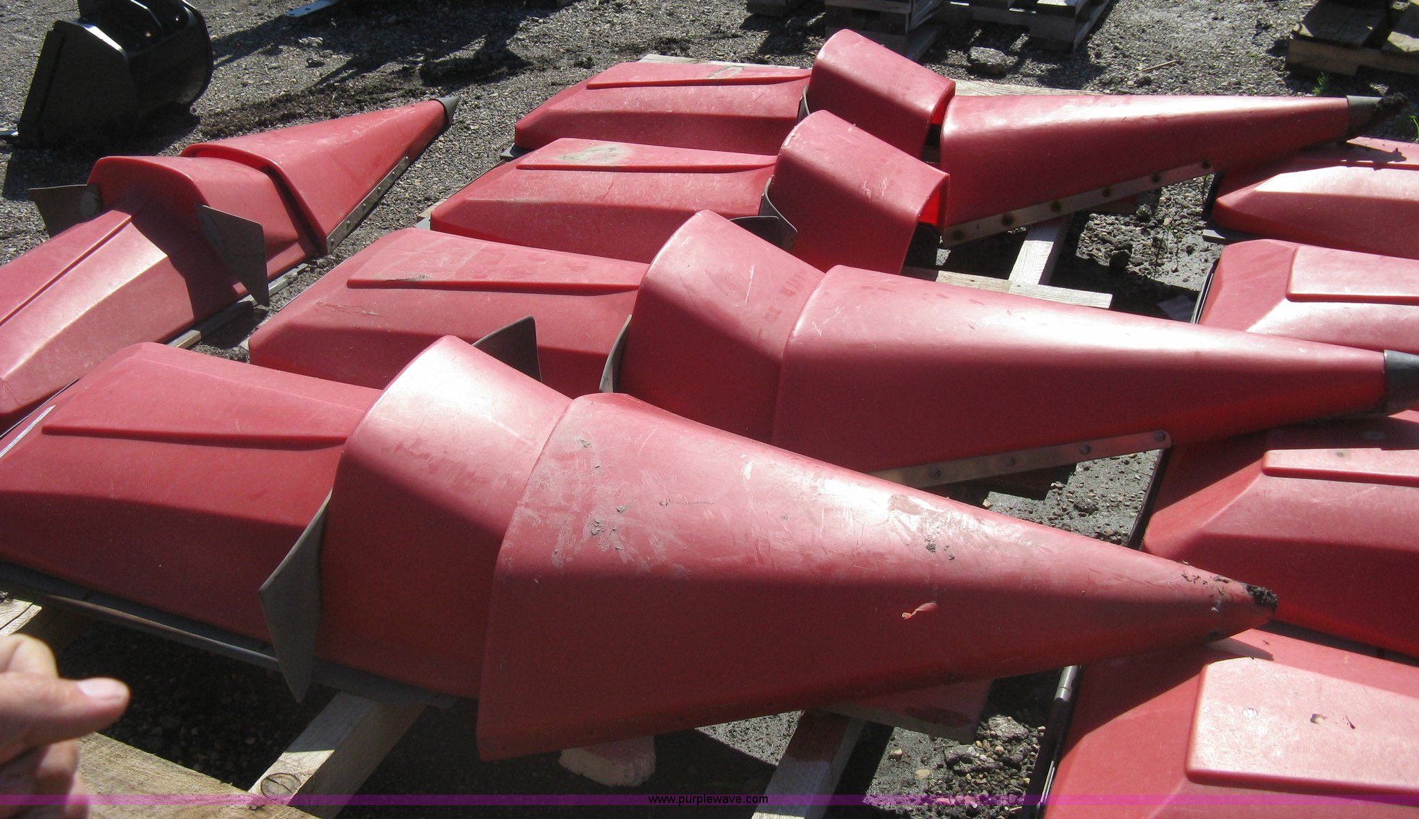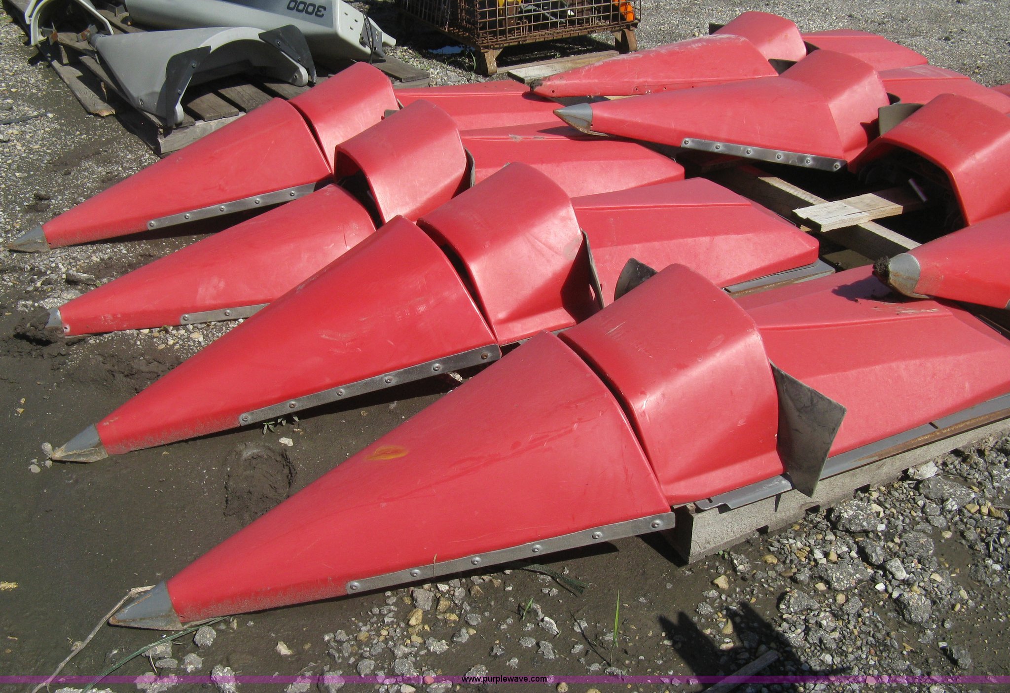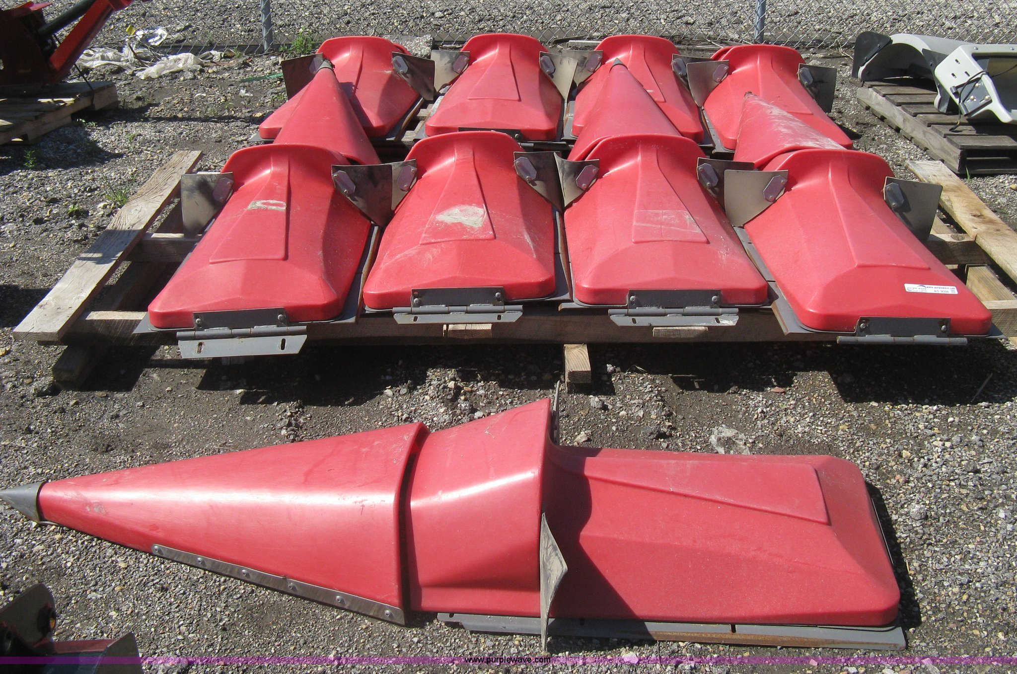Purple Wave is selling a used Harvester Attach. in Kansas. This item is a (9) Massey-Ferguson corn head poly snouts with the following: Some snouts detached, Missing one snout end, Missing one metal snout point, Used on 2011 Massey-Ferguson corn head