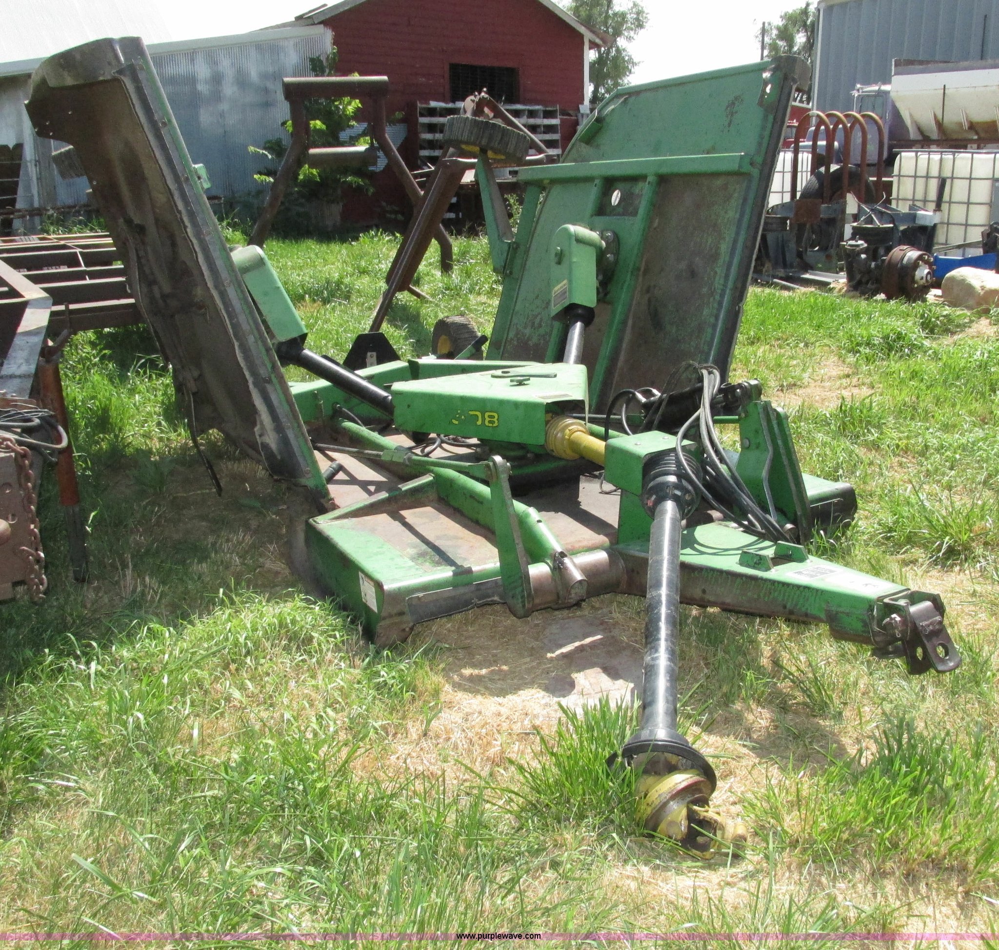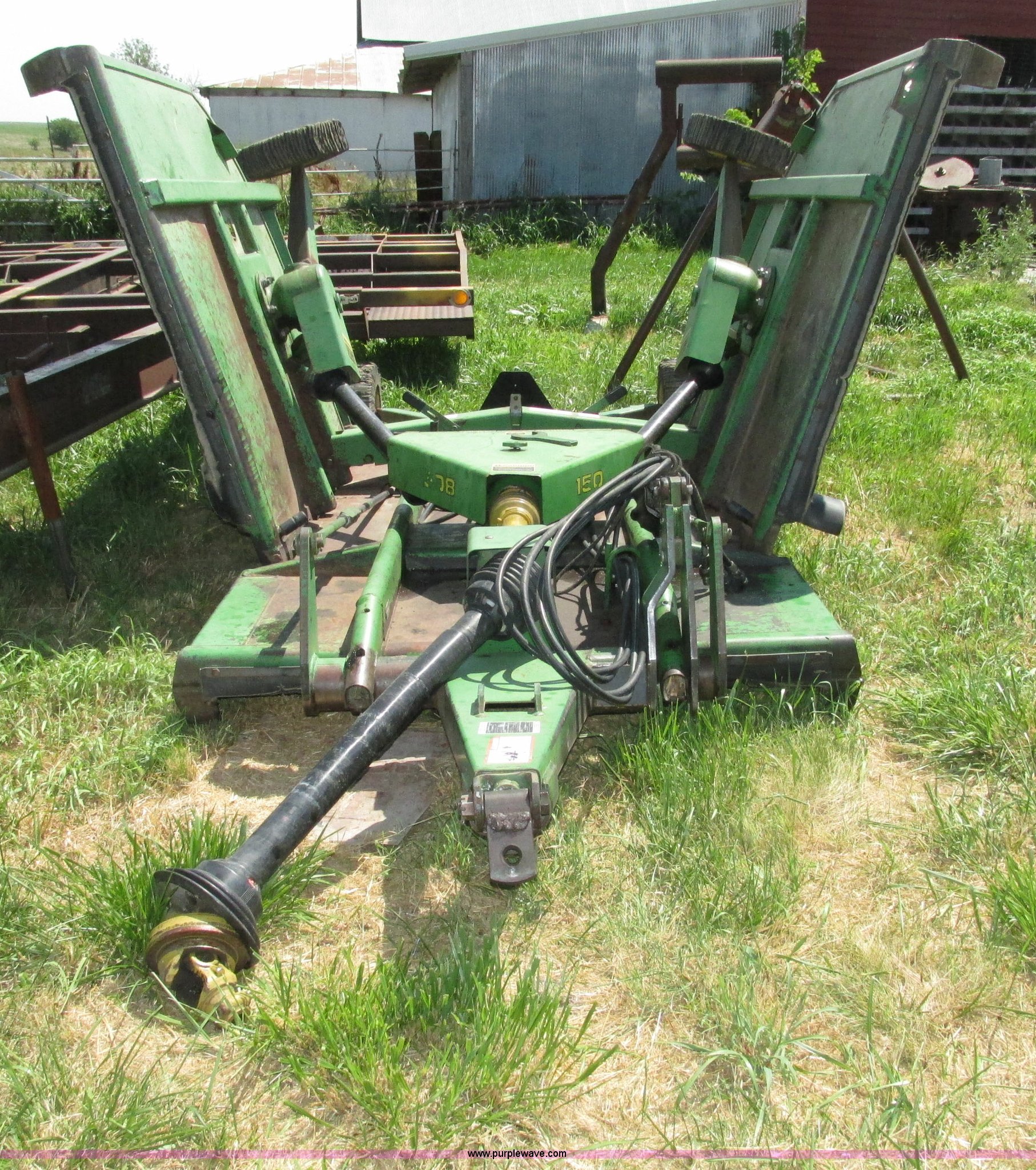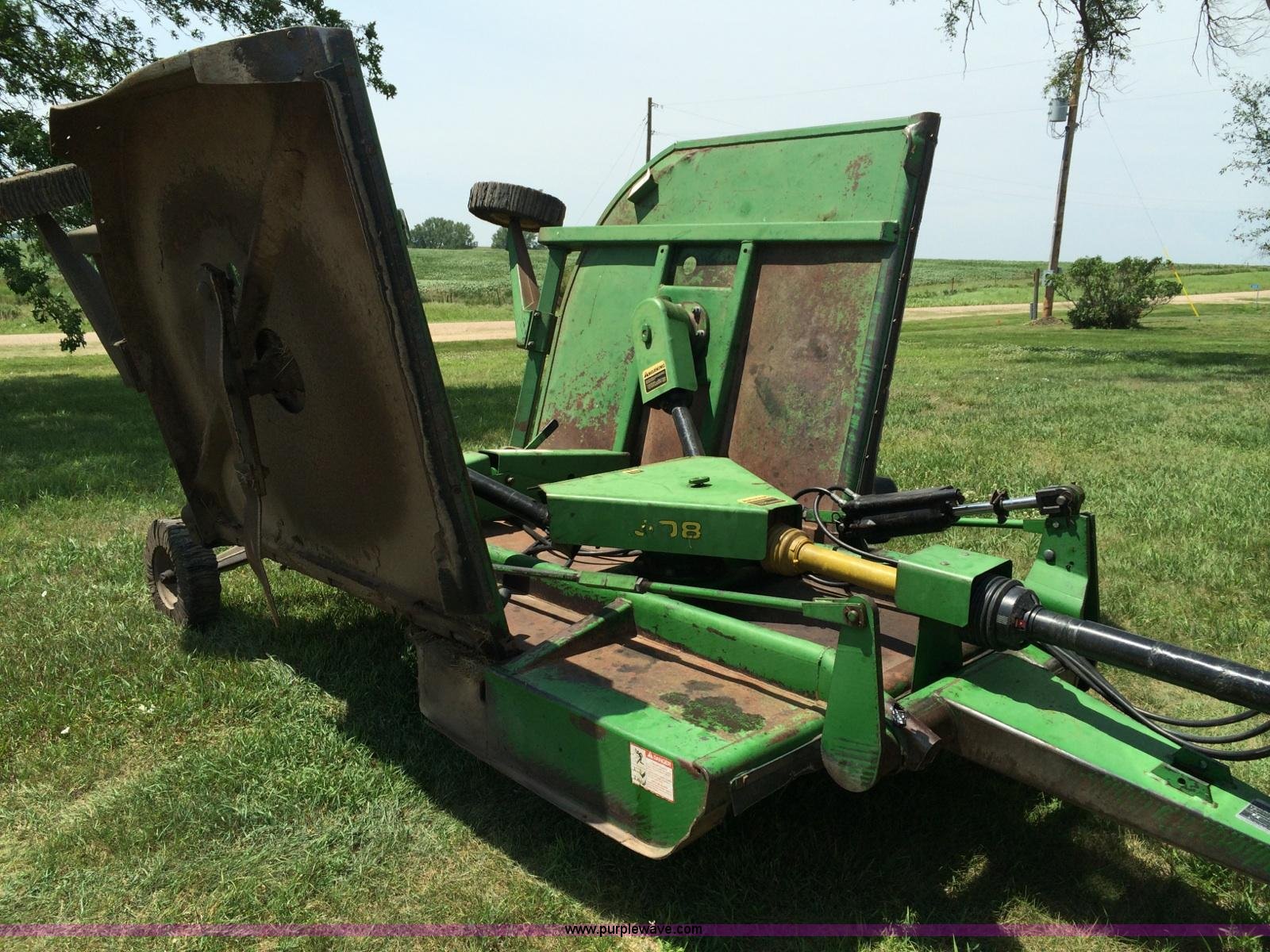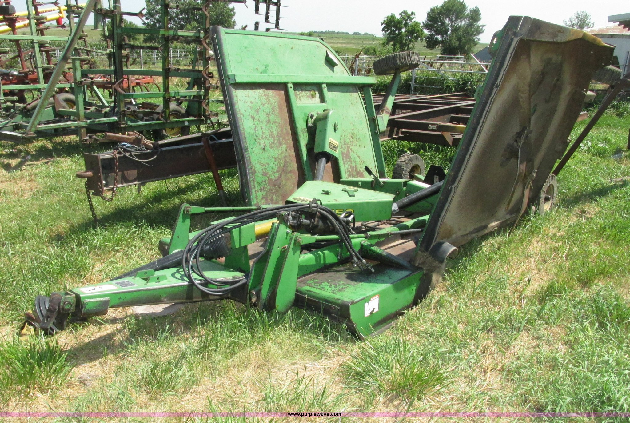 Purple Wave is selling a used Mower, Cutter, Shredder in Nebraska. This item is a John Deere 1508 batwing rotary mower with the following: 15'W, Three 5'W sections, 1000 PTO, Pioneer fittings on four hydraluic hoses, Hydraulic fold, Laminated solid rubber tires, Pin hitch, Blades replaced one year ago, Single owner, Serial W10508F0253