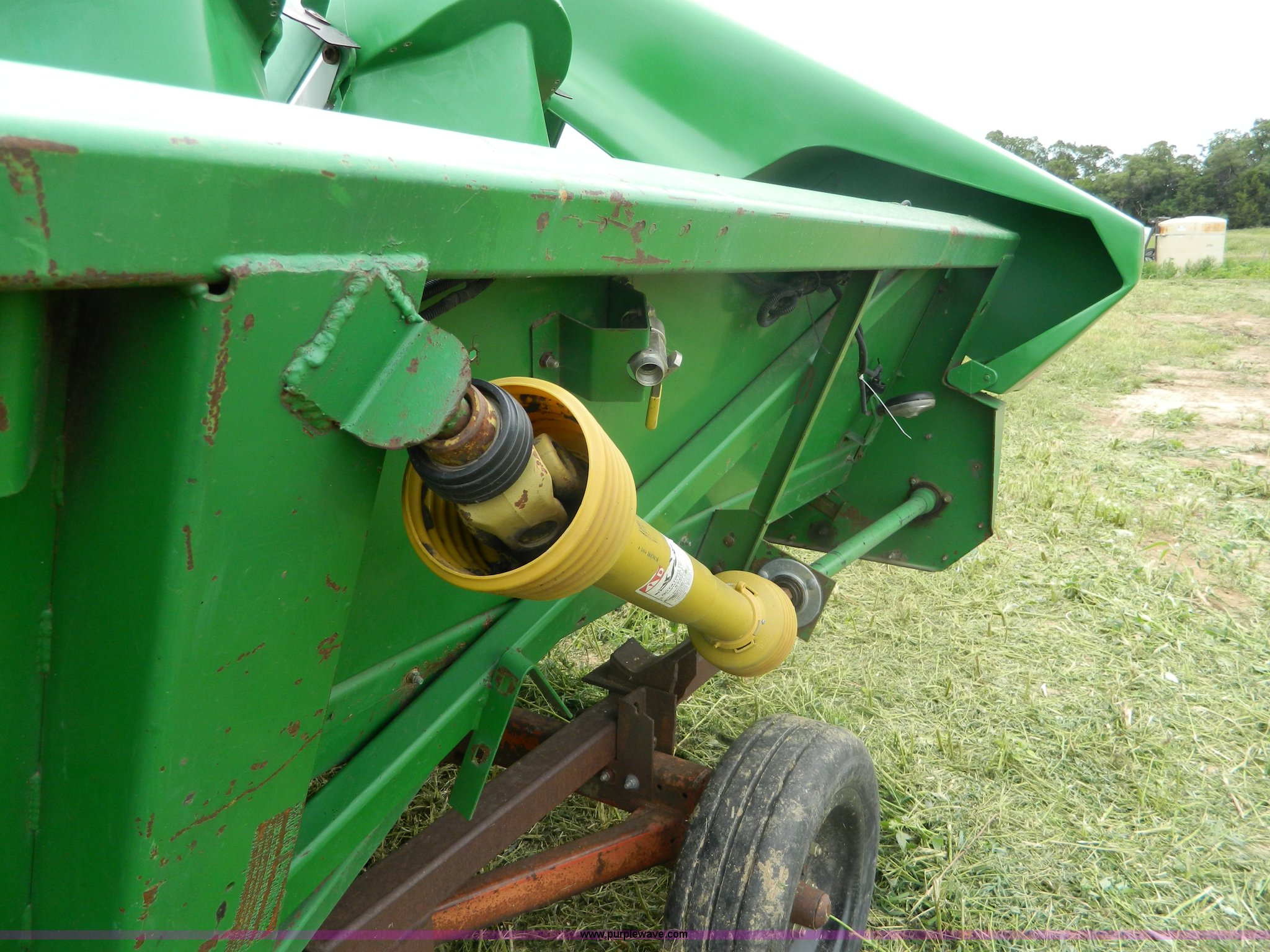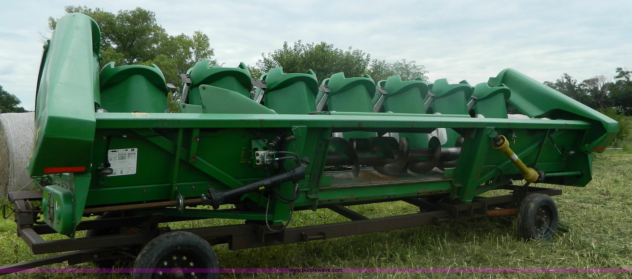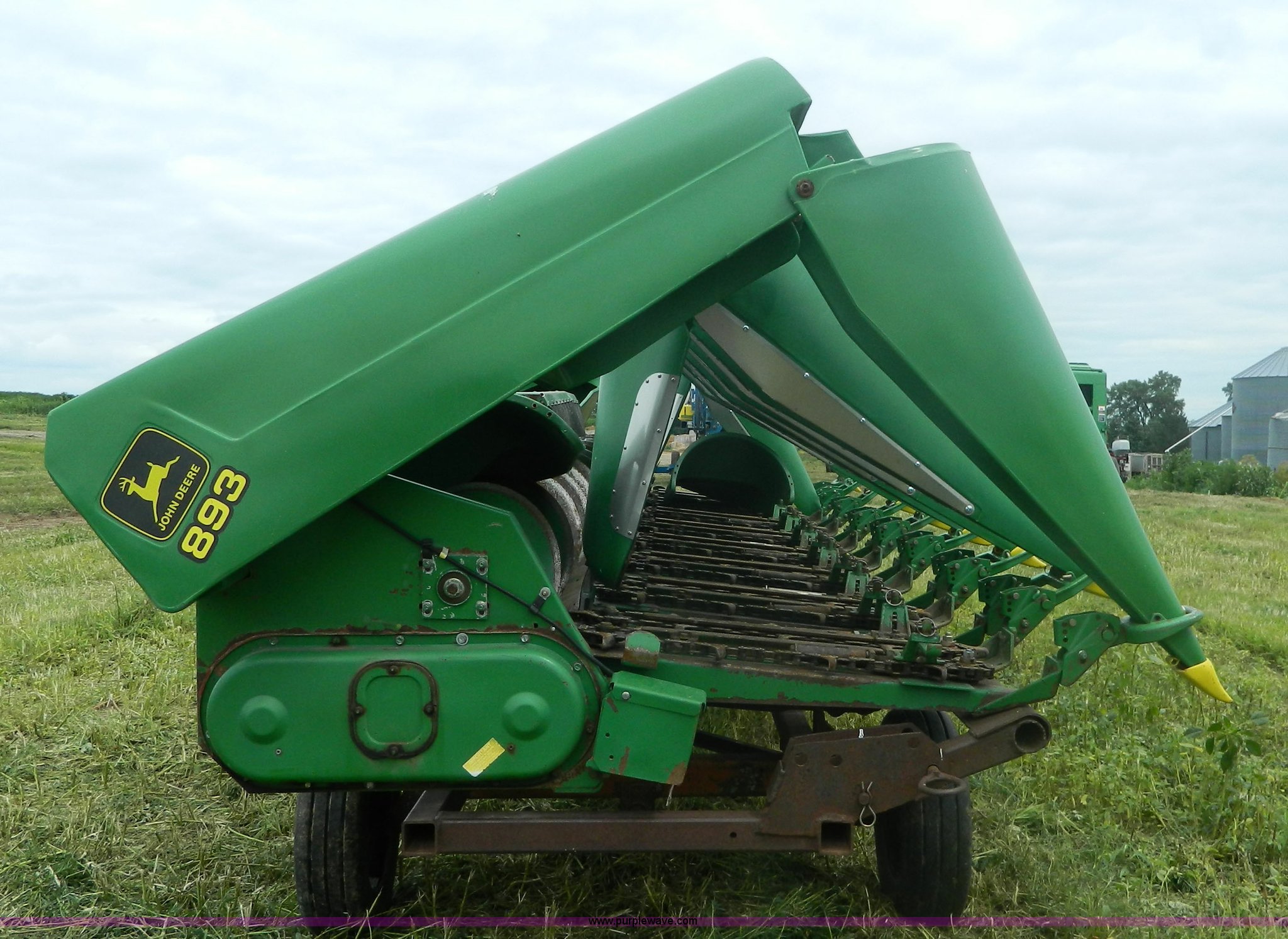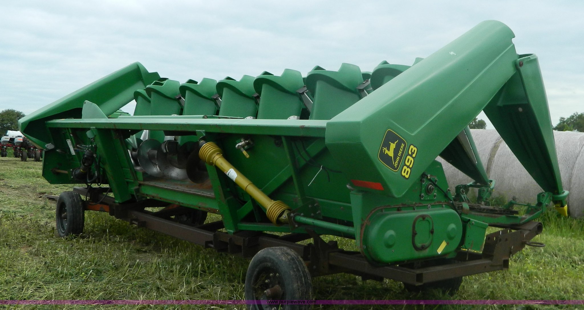 Purple Wave is selling a used Corn or Row Head in Kansas. This item is a 1996 John Deere 893 corn head with the following: Eight row, 30" spacing, Poly snouts, Telescoping shafts, Single point hookup, Trailer is not included, Serial H00893X666472