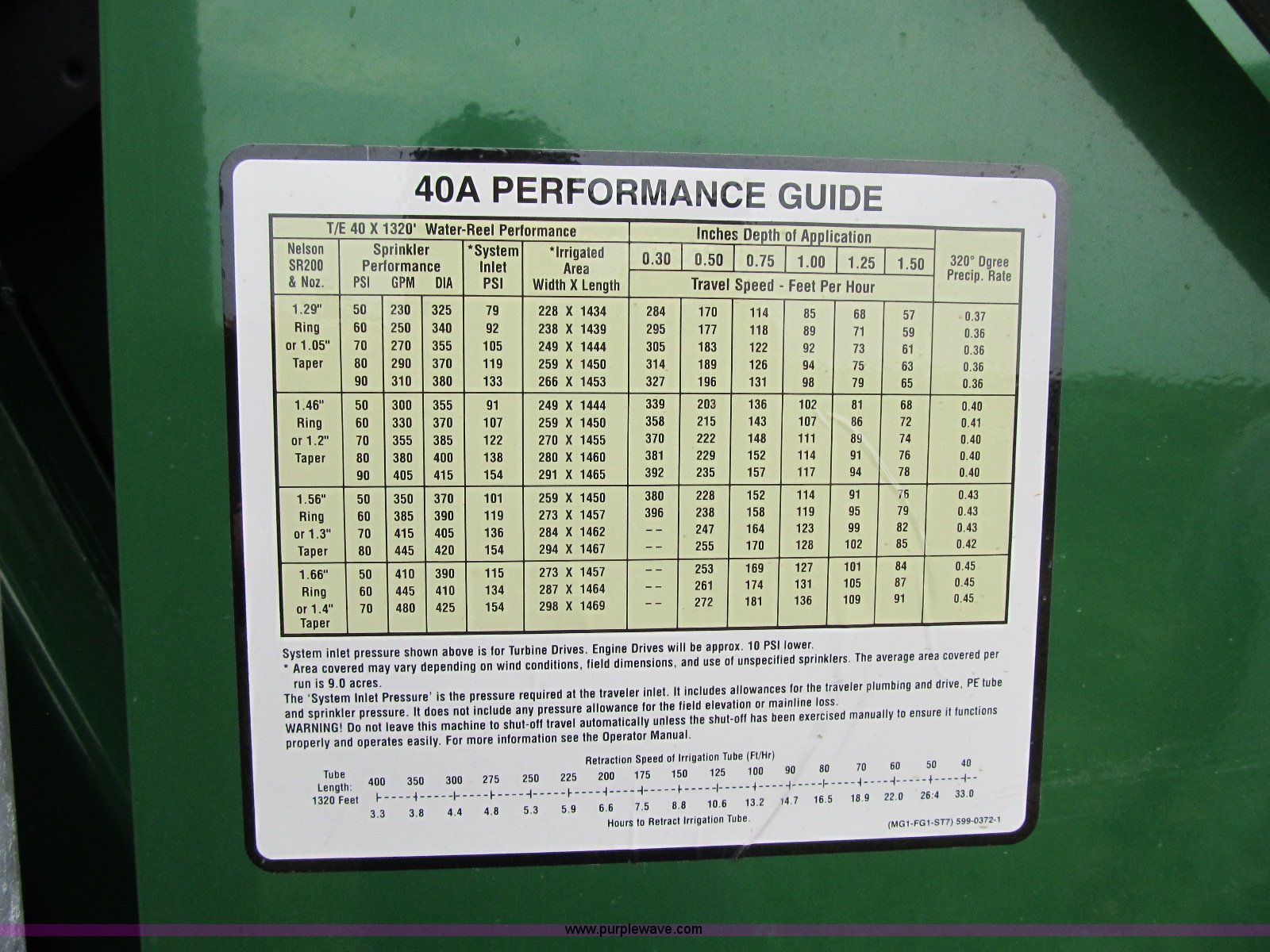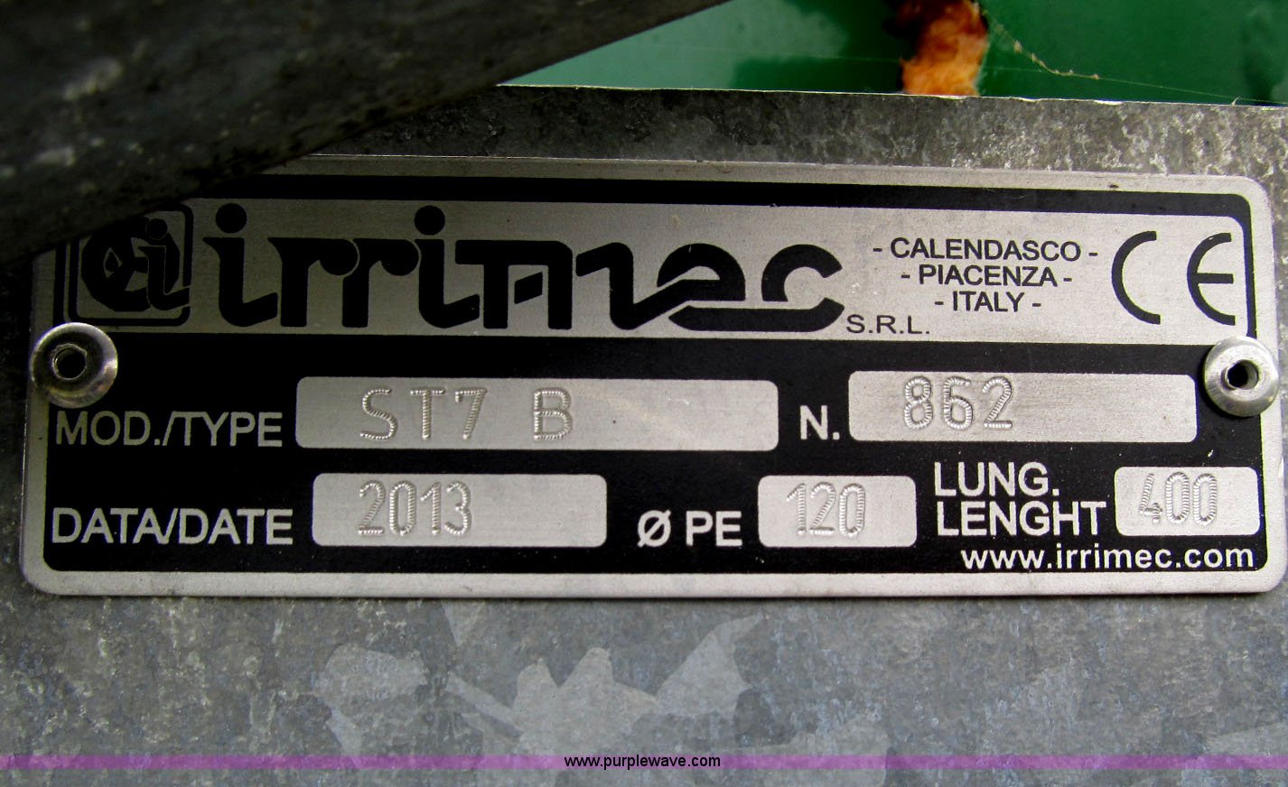 Purple Wave is selling a used Hose Reel in Missouri. This item is a 2013 Kifco Ag Rain water reel with the following: Model ST7B T40X1320, 1,320' of hose, 4" tube diameter, Irrigation with 228' to 298', 5 to 10 acres irrigation area per run, Turbine drive water pressure operated, 205 to 415 gpm range, 78 to 150 inlet psi range, 4.4 to 44 hours per full run, Pin hitch, Tongue jack, Nelson Big Gen SR200 sprinkler, Assorted nozzle sizes, Three wheel gun cart, 166-80R13 tires, 20' x 4" inlet hose, 10.0-75-15 tires, Serial 862