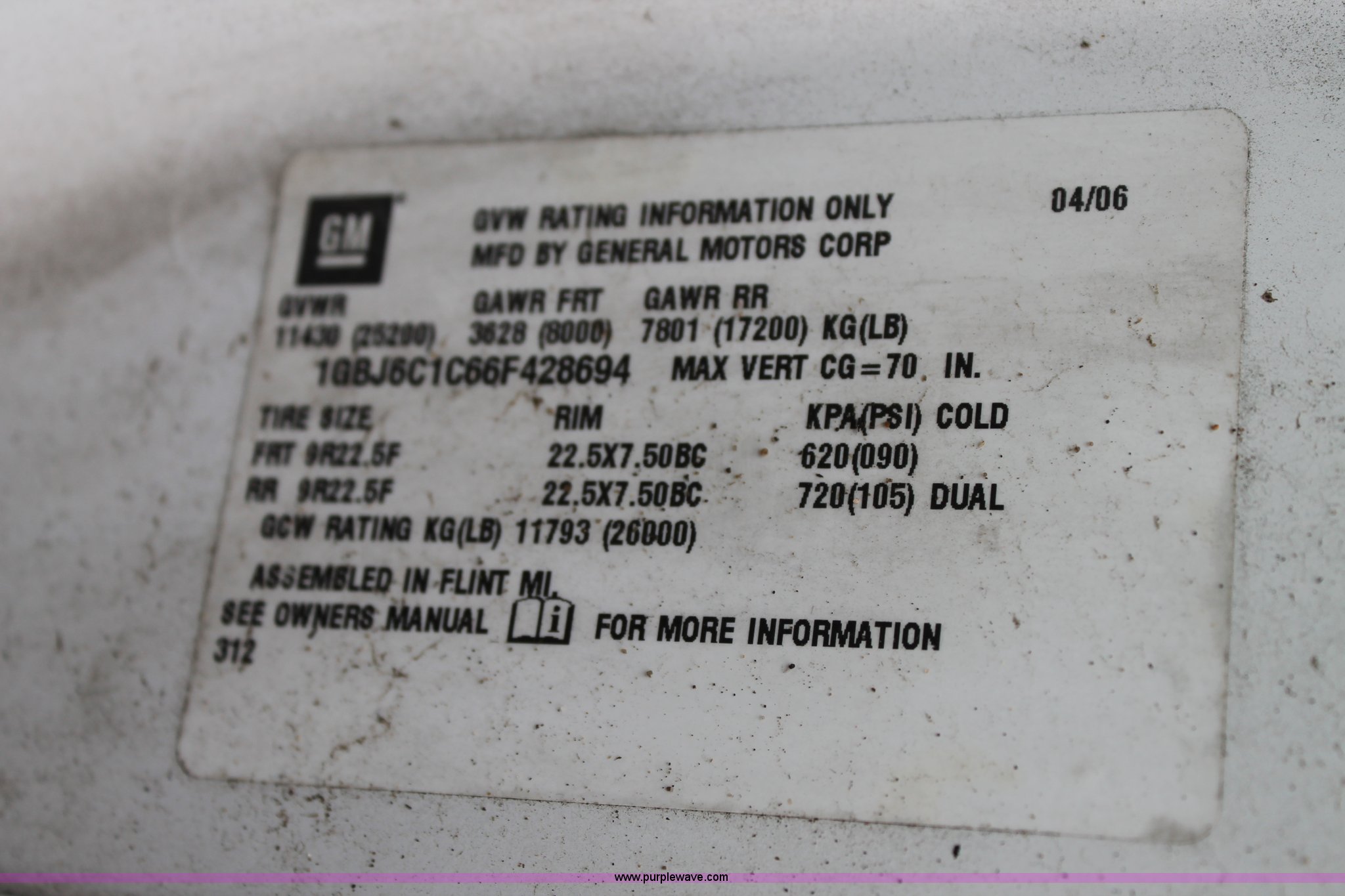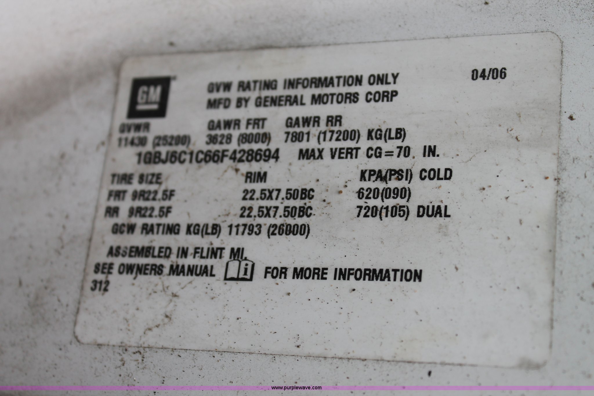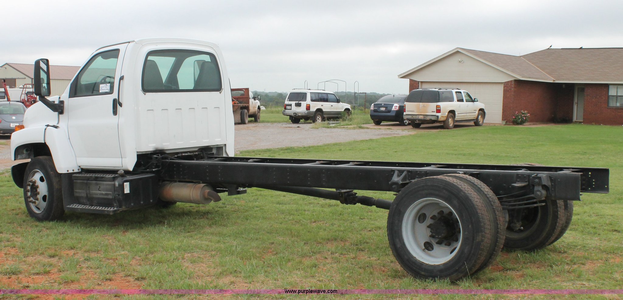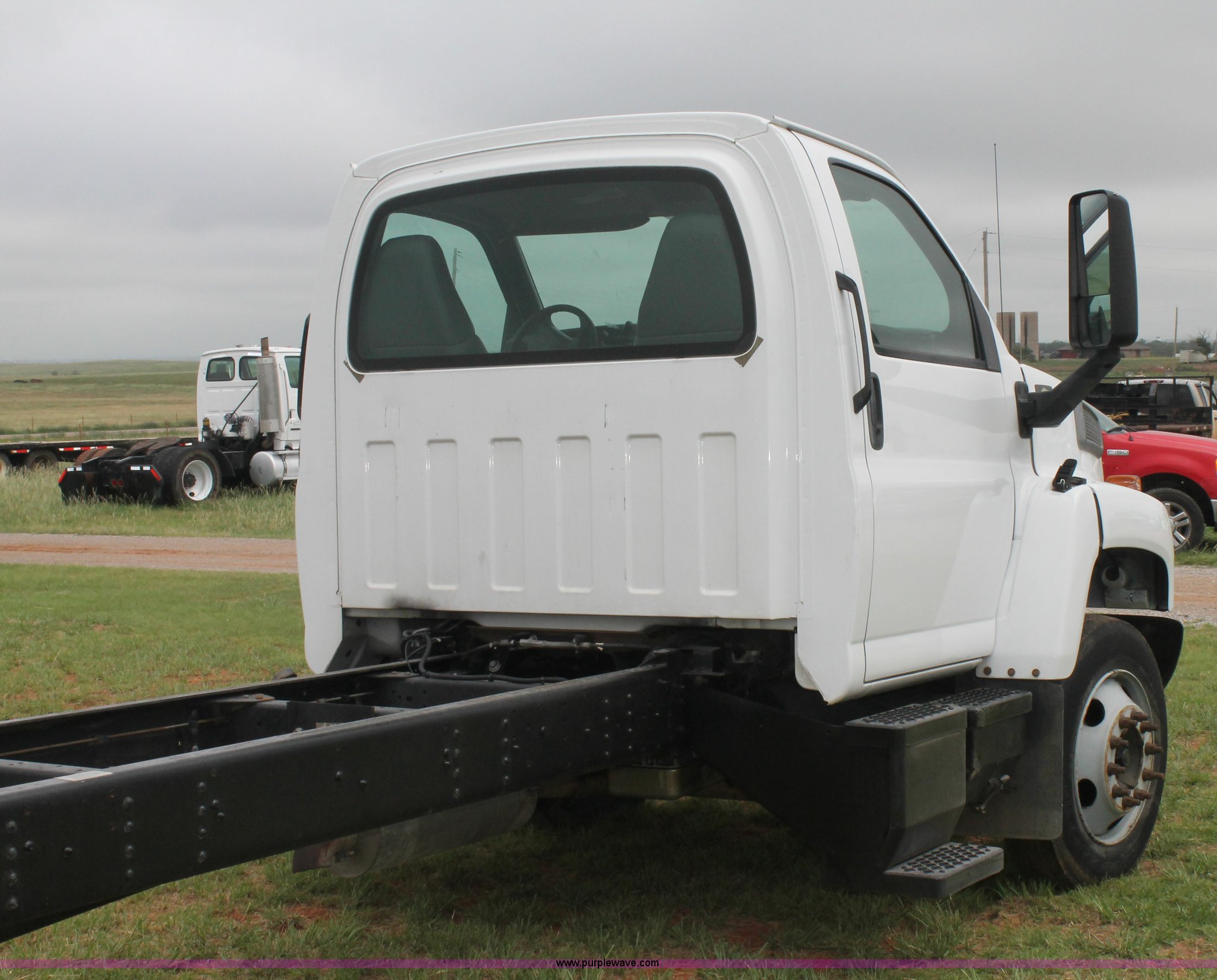 Purple Wave is selling a used Truck Chassis in Oklahoma. This item is a 2006 Chevrolet C6500 cab and chassis with the following: 223,861 actual miles, Caterpillar C7 7.2L six cylinder turbo diesel engine, 190 HP, Serial WAX33763, Automatic transmission, AC and heat, Tilt, AM/FM, Single fuel tank, Spring suspension, Hydraulic brakes, Wheel nut covers, 9R22.5 tires, GVWR 25,200 lbs, FAWR 8,000 lbs, RAWR 17,200 lbs