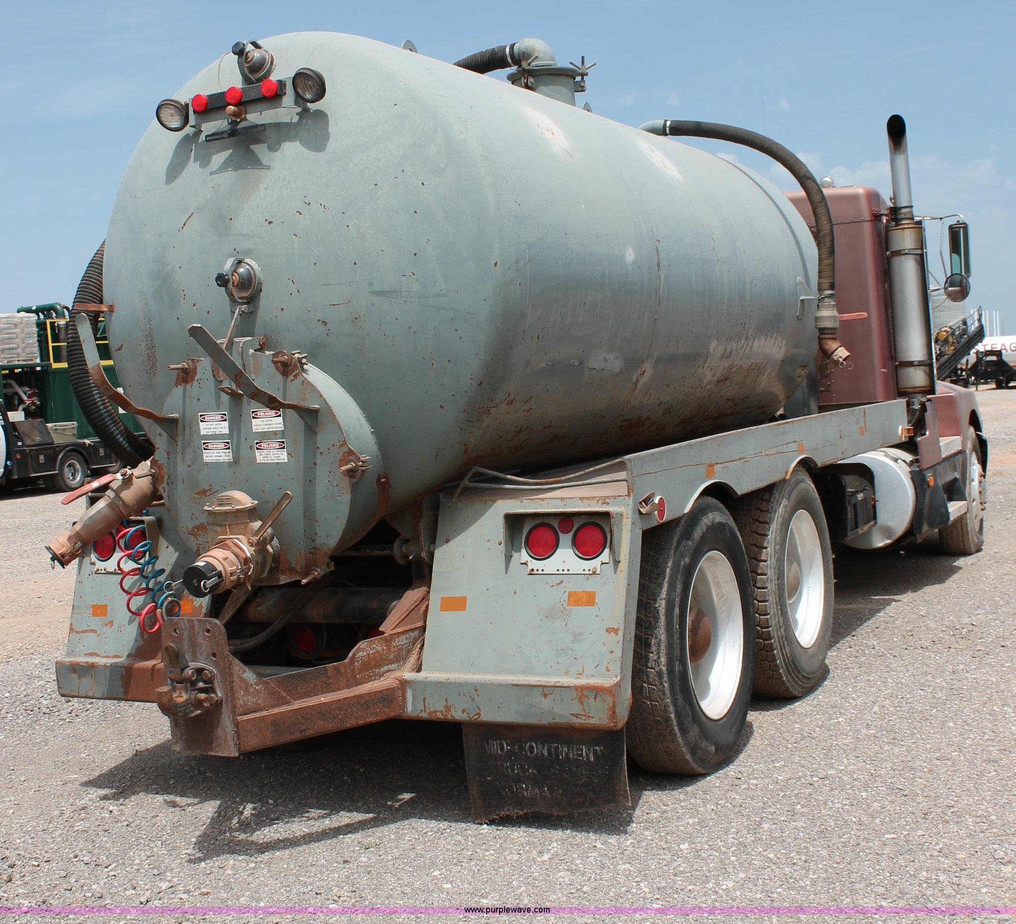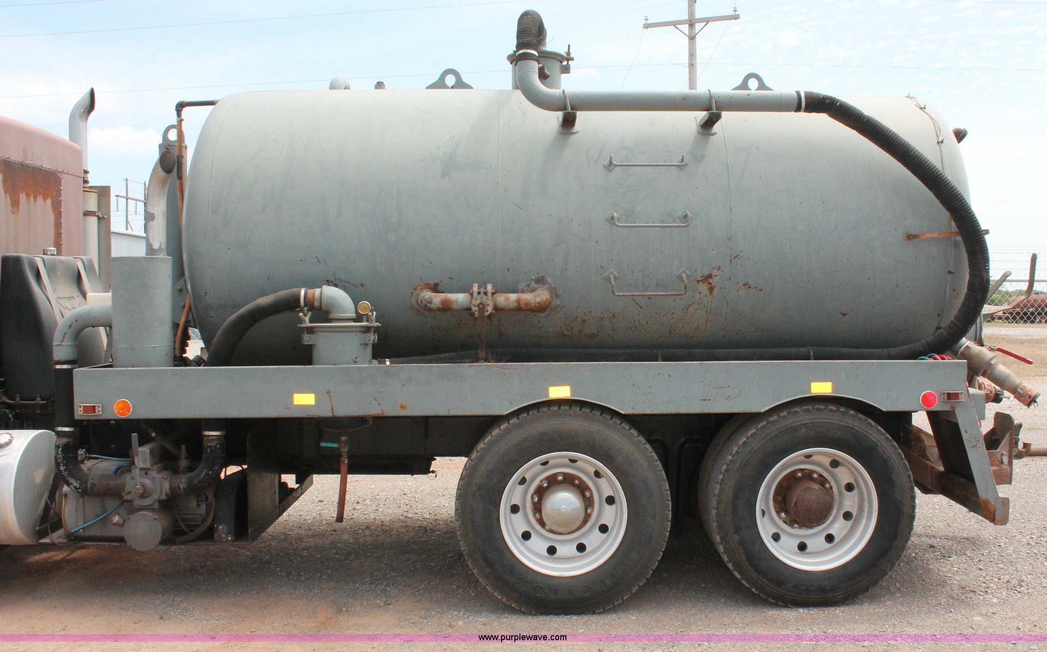 Purple Wave is selling a used Vacuum Truck in Oklahoma. This item is a 1988 Kenworth T600 vacuum truck with the following: 248,480 miles on odometer, Caterpillar 3406 14.6L L6 diesel engine, Eaton Fuller nine speed manual transmission, Locking differential, AC and heat, AM/FM/cassette, Heated mirrors, Air suspension seat, Tekonsha Voyager trailer brake controller, Throttle lock, 2,500 gallon vacuum tank, 16'L x 96"W, Wallenstein 1054 vacuum pump, Single ram three stage hoist, Hydraulic dump, Rear man way, Side discharge, (2) rear discharge valves, Work lights, Access ladder, Assorted plumbing, Locking fifth wheel plate, Exterior visor, Dual 120 gallon fuel tanks, Dual rear exhaust stacks, PTO, Wet kit, Spring suspension, Air brakes, Jake brake, 3:70 gear ratio, Alloa forged wheels, 234" wheelbase, 11R24.5 tires, GVWR 52,000 lbs, FAWR 12,000 lbs, IAWR 20,000 lbs, RAWR 20,000 lbs, Engine knocks