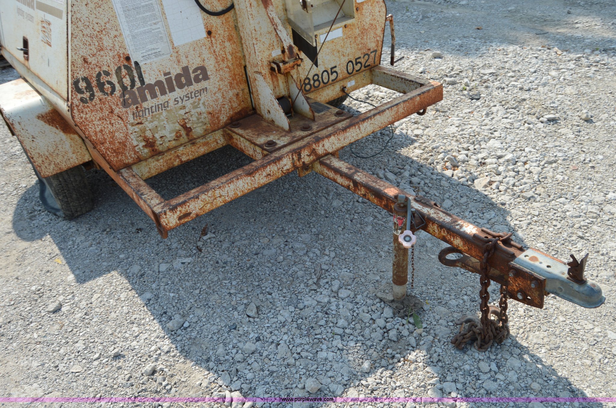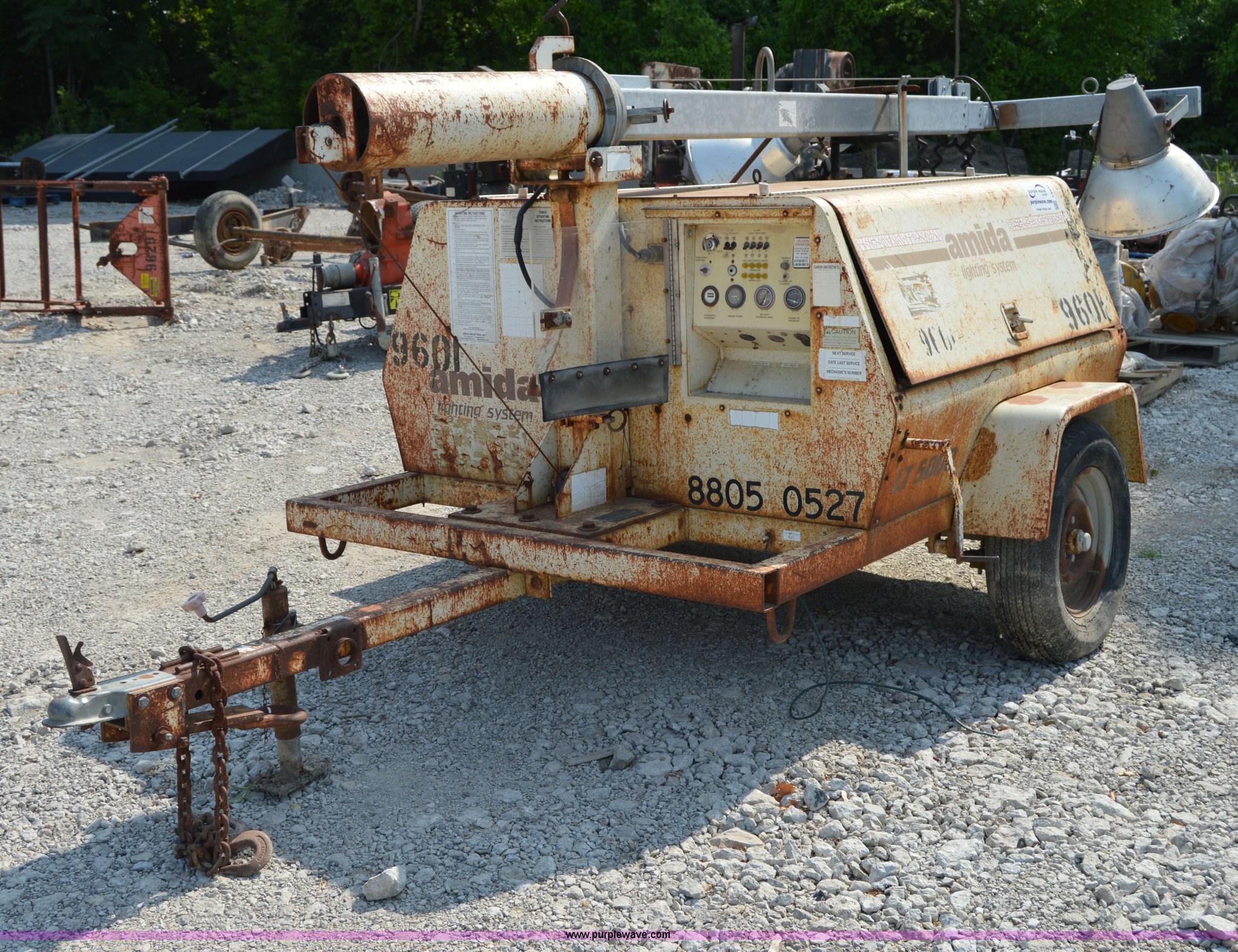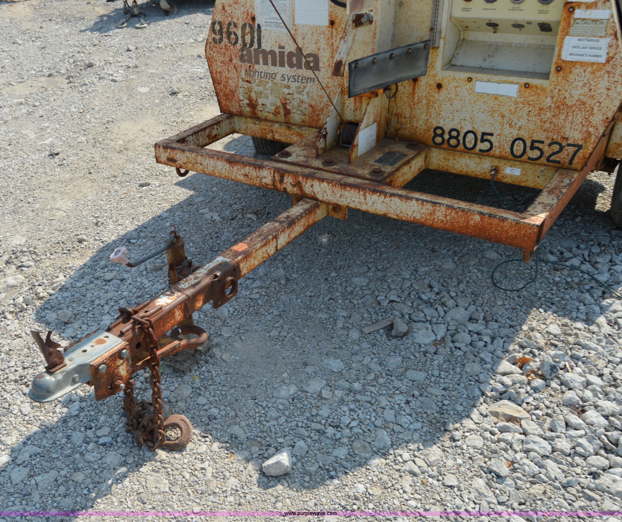 Amida LT500 air compressor. 9,101 hours on meter, Manual jack, 2" ball hitch, (2) lights missing, Connections on mast need repair, Serial 8805B0527, Unit# 9601. Clarkson Construction Company. 4133 Gardner. Kansas City, MO 64120