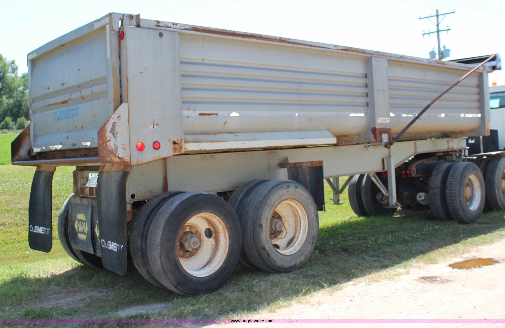 Purple Wave is selling a used End Dump Rock Trailer in Kansas. This item is a 1994 Clement end dump trailer with the following: 26'L, Single ram five stage hoist, Pneumatic tailgate latch, Electric roll-over tarp, 11R24.5 tires, Rust