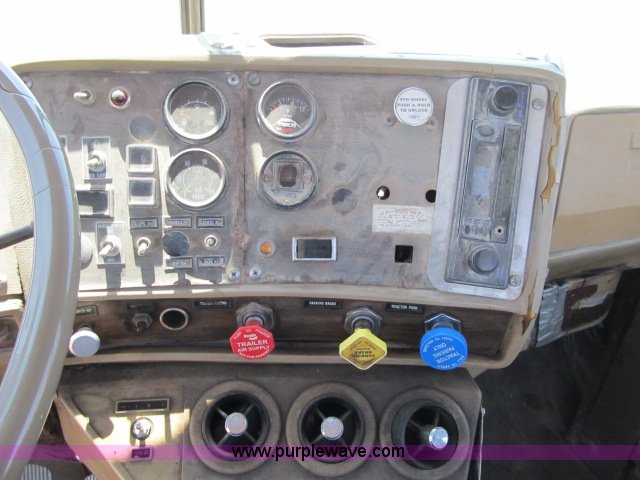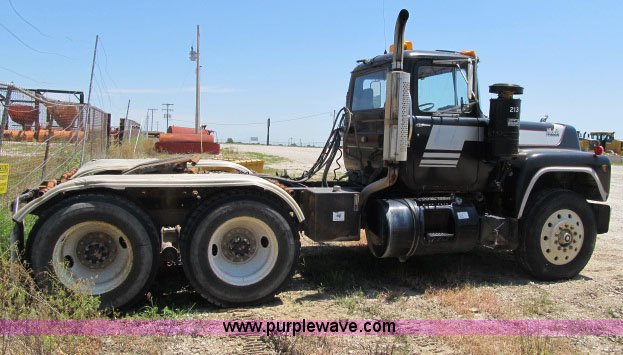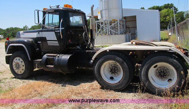 Purple Wave is selling a used Truck Tractor in Missouri. This item is a 1984 Mack R686ST semi truck with the following: 417,474 miles on odometer, Mack diesel engine, 350 HP, Mack RT11-609 nine speed manual transmission, Twin screw, AC and heat, AC inoperable, AM/FM/cassette, Telescoping steering wheel, Air suspension seat, Block heater, Air slide fifth wheel, Dual 75 gallon fuel tanks, Single rear exhaust stack, Aluminum full fenders, PTO, Wet kit, Aluminum front wheels, Hendrickson spring suspension, Air brakes, 11R24.5 tires, GVWR 46,000 lbs, FAWR 12,000 lbs, IAWR 17,000 lbs, RAWR 17,000 lbs