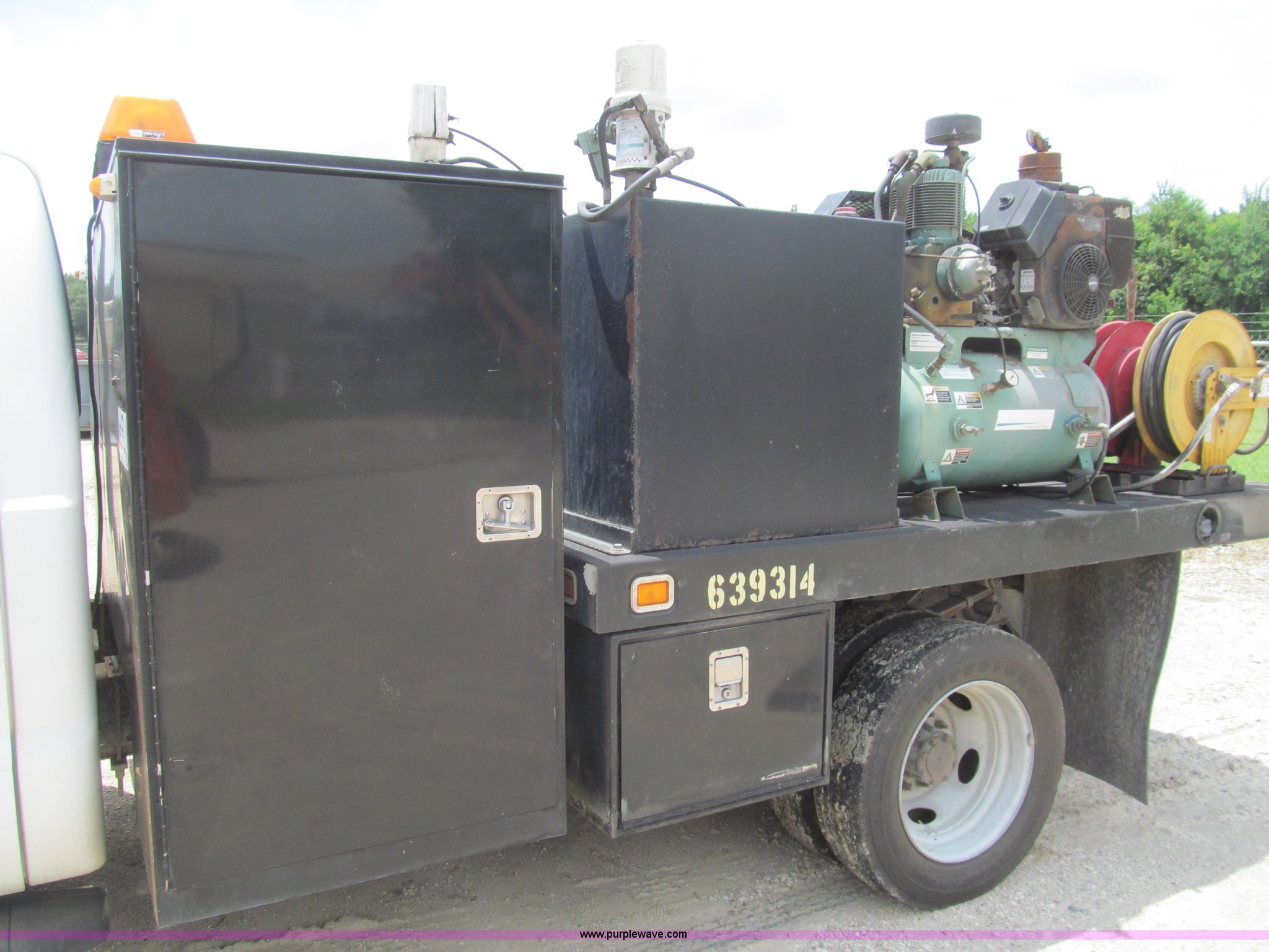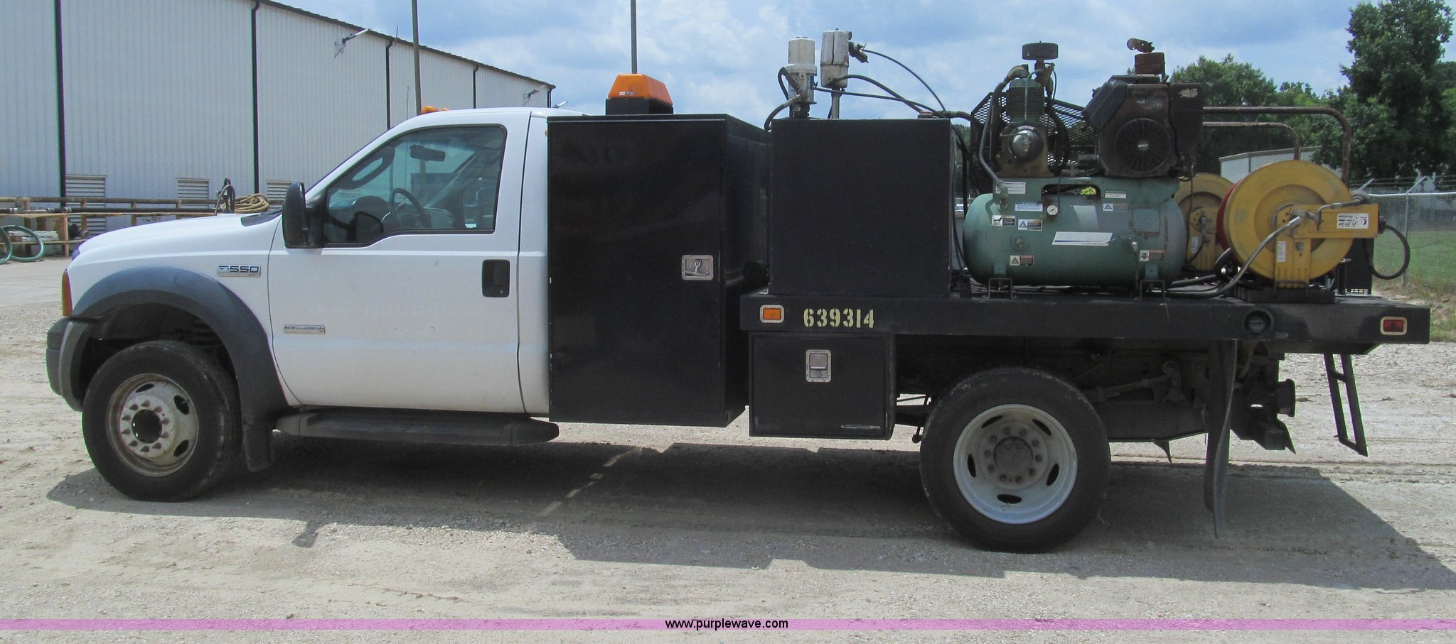 Purple Wave is selling a used Service Truck in Texas. This item is a 2006 Ford F550 Super Duty XL service truck with the following: 169,566 actual miles, 6.0L V8 OHV 32V turbo diesel engine, Automatic transmission, AC and heat, Tilt, Cruise, AM/FM/CD, Manual windows and locks, Vinyl interior, Auxiliary switches, Knapheide 9'4"L utility bed, (4) storage bins, Three piece 112 gallon lube tanks, Graco Fireball 300 pump, Champion air compressor, Kohler 12.5 HP gas engine, 30 gallon tank, Hose and reel,, Front tow hooks, Front auxiliary power outlet, Running boards, Strobe light, Receiver hitch, Trailer wiring, 225/70R19.5 tires, EIN 639314RA