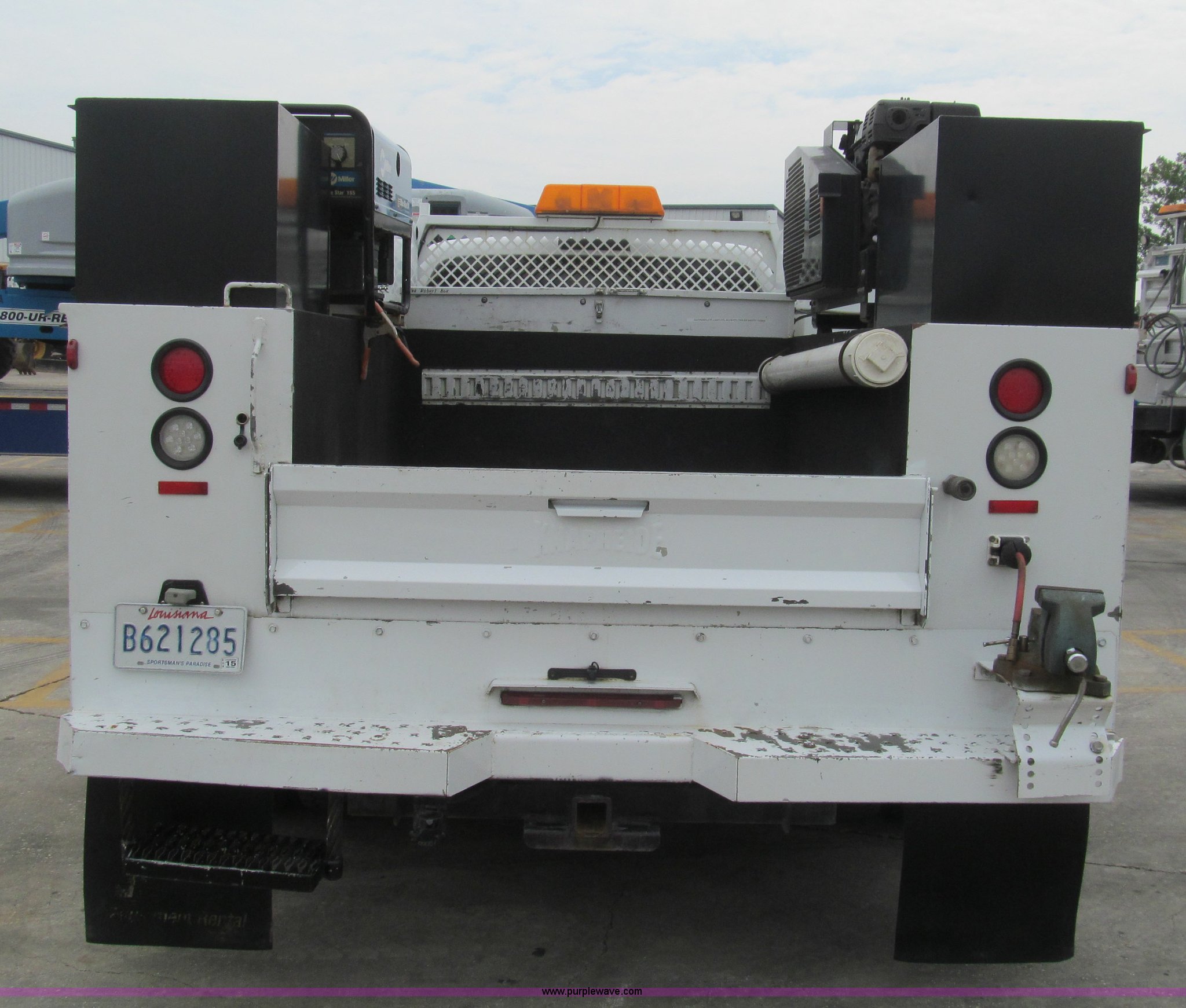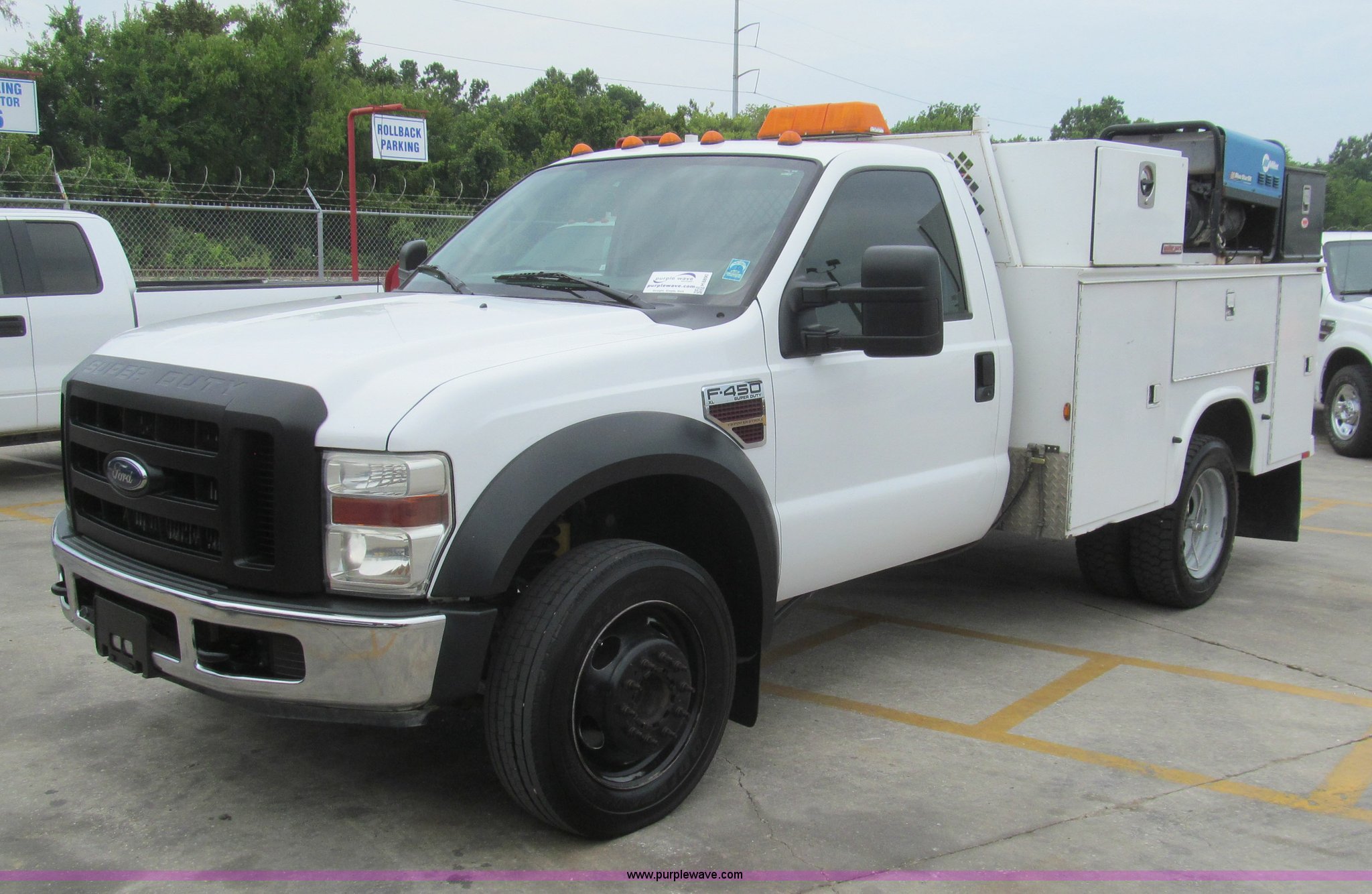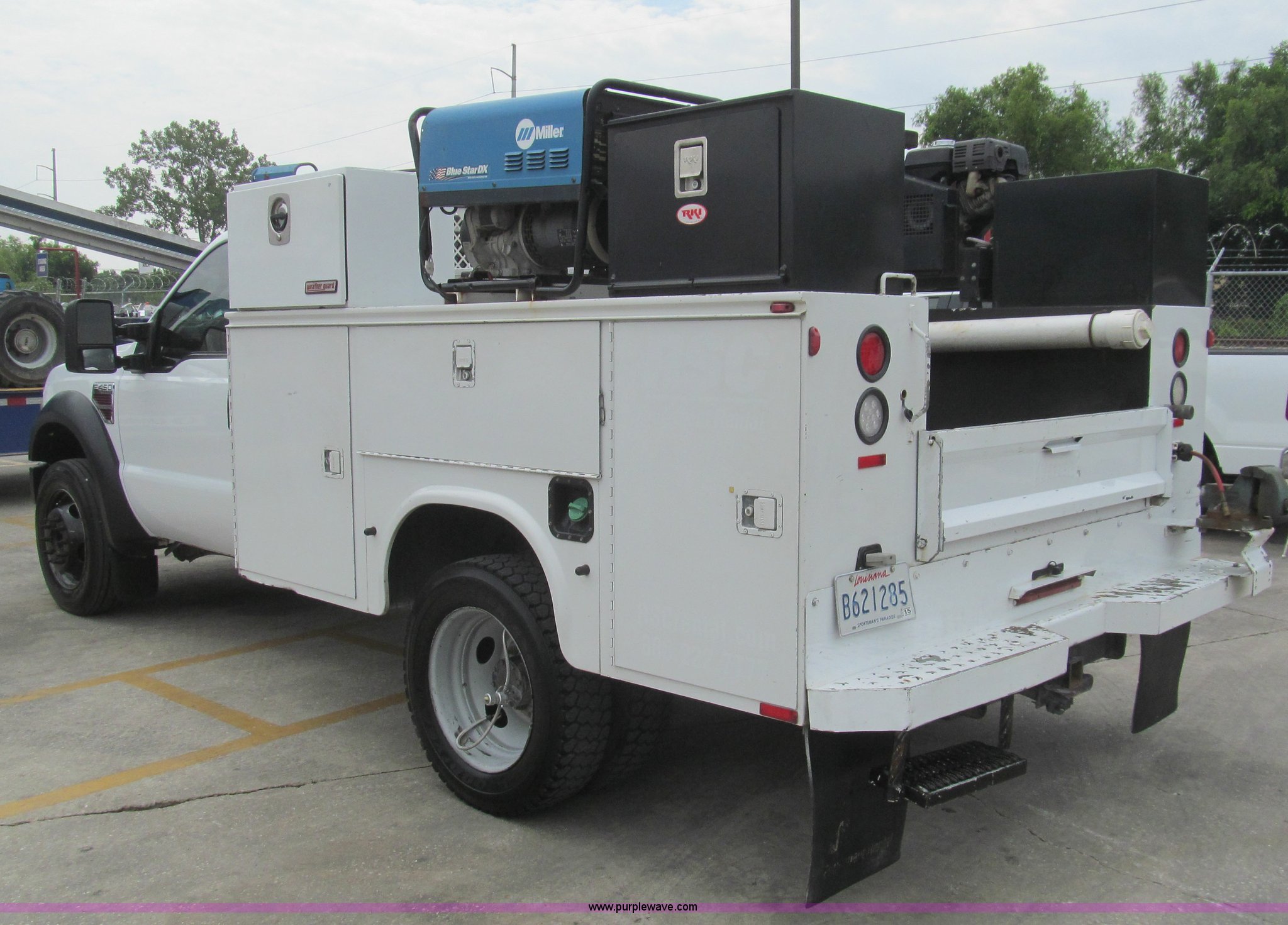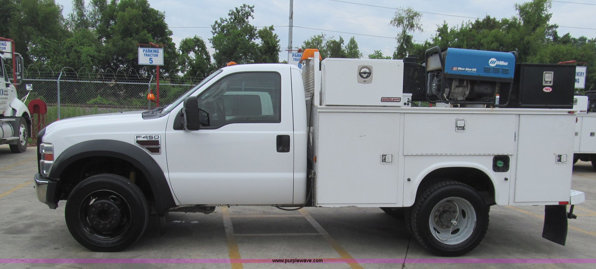 Purple Wave is selling a used Service Truck in Louisiana. This item is a 2008 Ford F450 Super Duty XL service truck with the following: 116,067 actual miles, 6.4L V8 OHV 32V turbo diesel engine, Automatic transmission, AC and heat, Tilt, Cruise, Pioneer AM/FM/CD, Touch screen, Manual windows and locks, Vinyl interior, Auxiliary control switches, Front tow hooks, Front auxiliary power outlet, Knapheide utility bed, (6) storage compartments, Toolboxes, 5" vise, Miller BlueStar 185 welder/generator, 22 hours on meter, Kohler 12.75 HP gas engine, CC/DC, 6,000 watt, Champion air compressor, Honda gas engine, Hose, reel, and nozzle assembly, Graco oil system, Motor oil, hydraulic oil, and grease recovery systems, Mini Fireball pumps, Hose, reel, and nozzle assemblies, Receiver hitch, Trailer wiring, 225/70R19.5 tires, Windshield cracked, EIN 720683RA