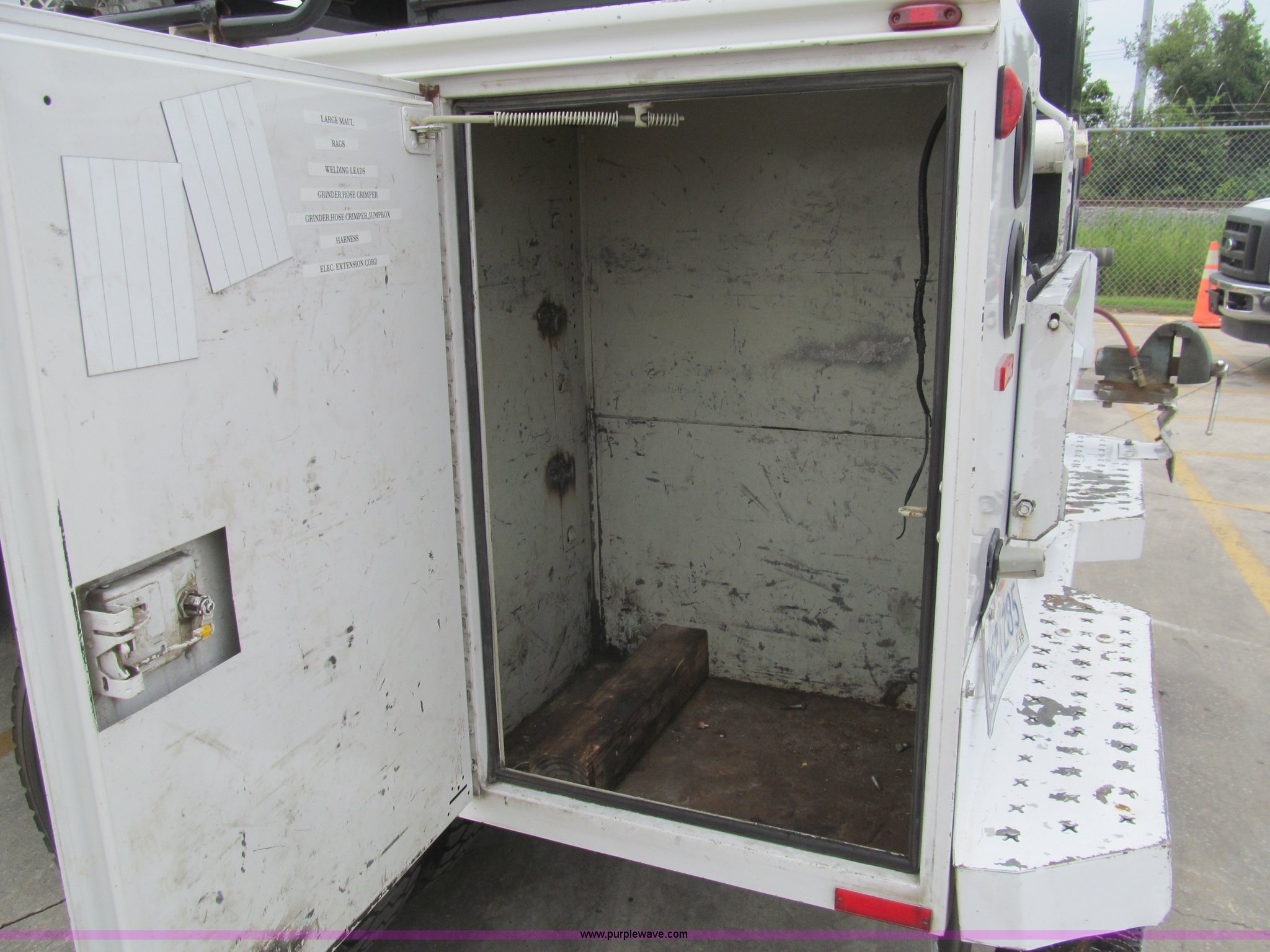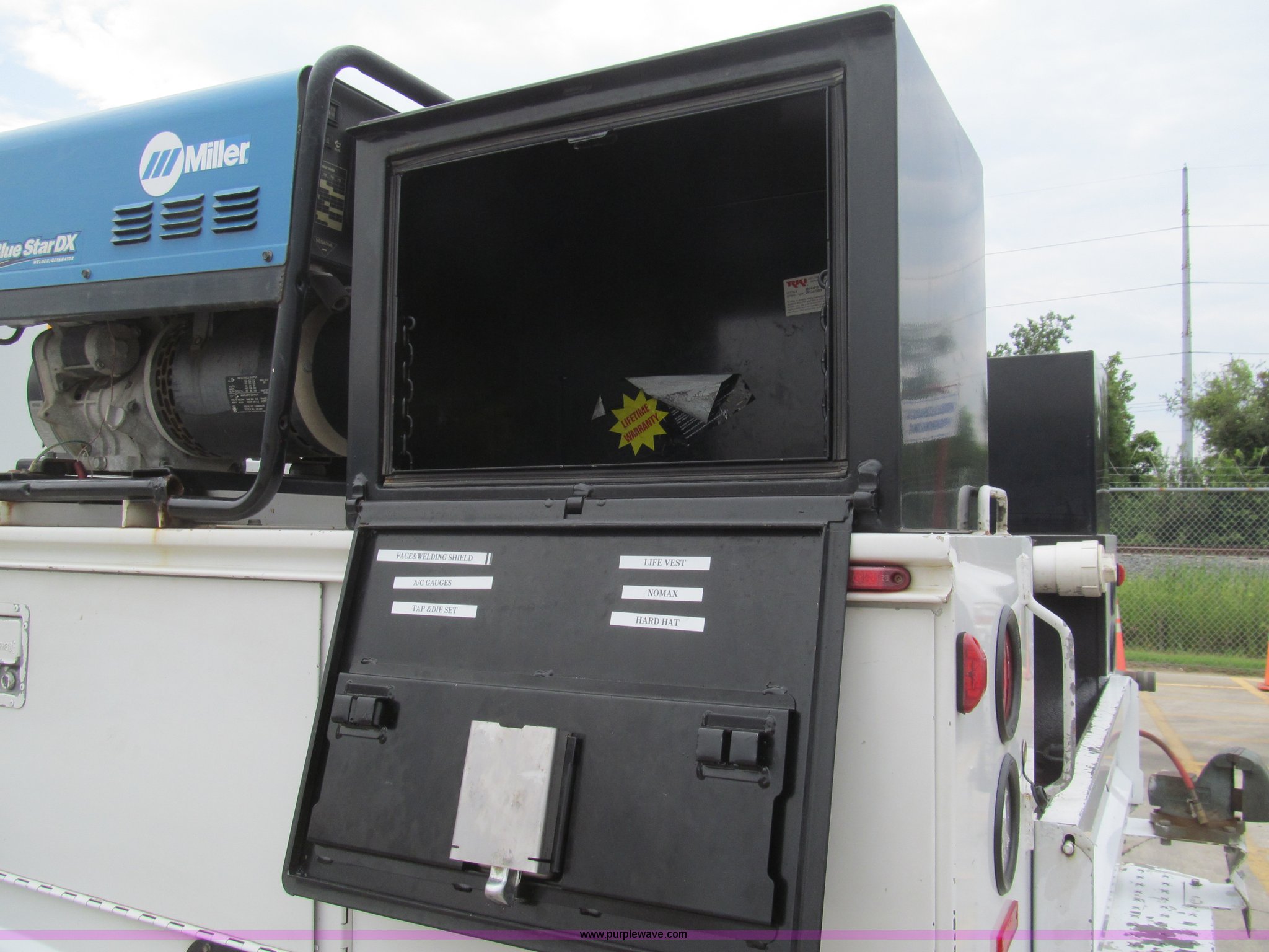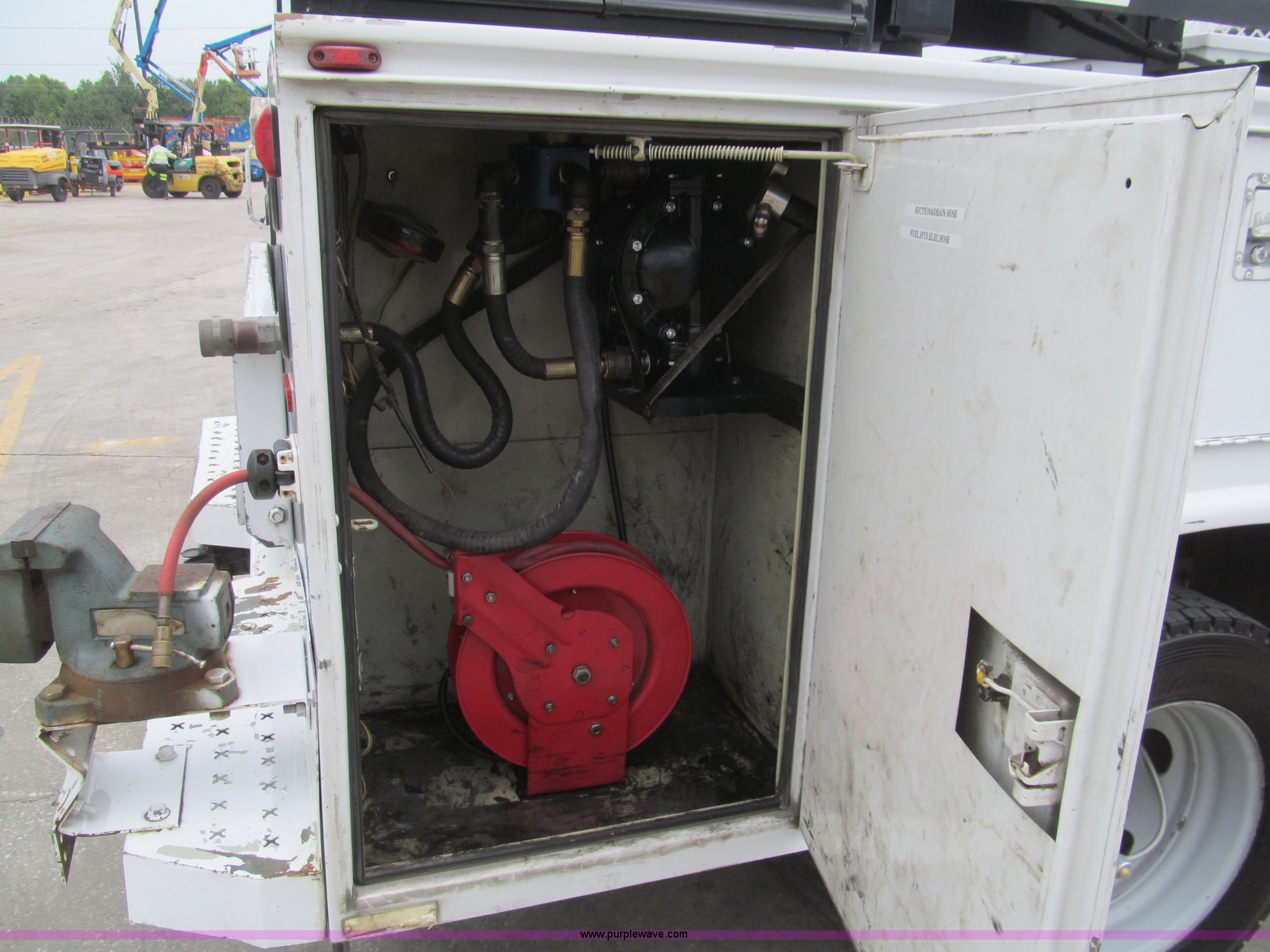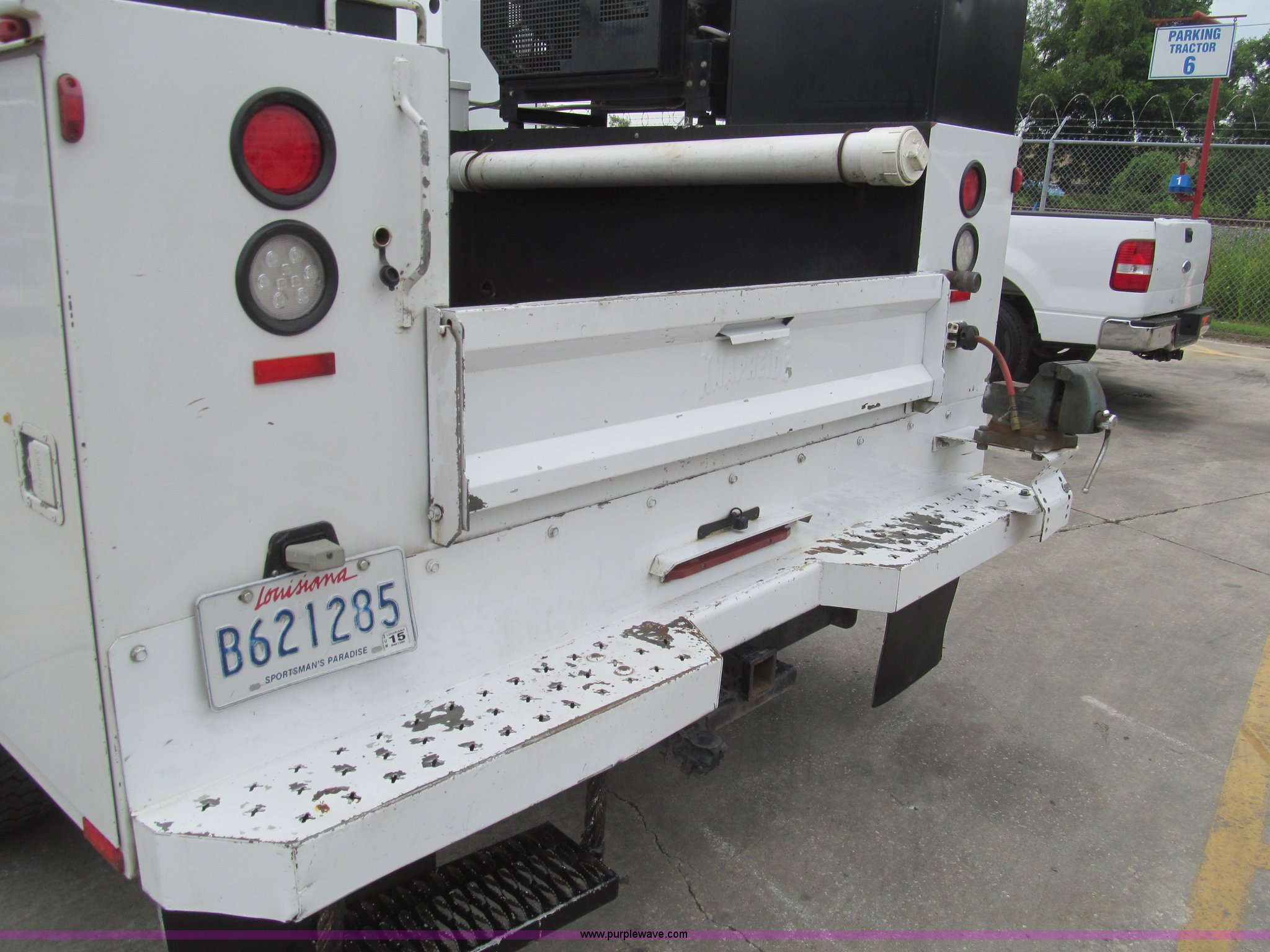 Purple Wave is selling a used Service Truck in Louisiana. This item is a 2008 Ford F450 Super Duty XL service truck with the following: 116,067 actual miles, 6.4L V8 OHV 32V turbo diesel engine, Automatic transmission, AC and heat, Tilt, Cruise, Pioneer AM/FM/CD, Touch screen, Manual windows and locks, Vinyl interior, Auxiliary control switches, Front tow hooks, Front auxiliary power outlet, Knapheide utility bed, (6) storage compartments, Toolboxes, 5" vise, Miller BlueStar 185 welder/generator, 22 hours on meter, Kohler 12.75 HP gas engine, CC/DC, 6,000 watt, Champion air compressor, Honda gas engine, Hose, reel, and nozzle assembly, Graco oil system, Motor oil, hydraulic oil, and grease recovery systems, Mini Fireball pumps, Hose, reel, and nozzle assemblies, Receiver hitch, Trailer wiring, 225/70R19.5 tires, Windshield cracked, EIN 720683RA