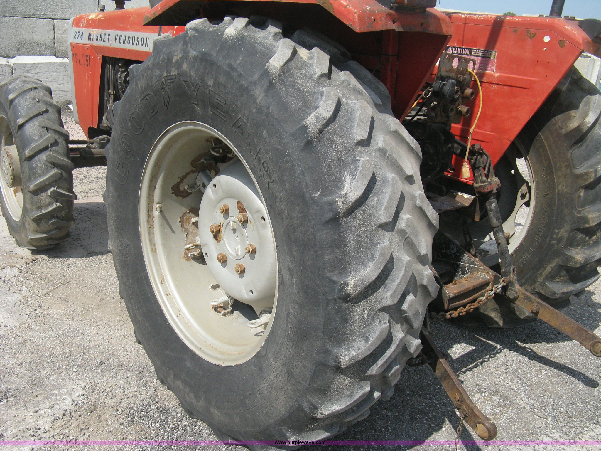Purple Wave is selling a used Tractor in Kansas. This item is a 1982 Massey Ferguson 274 MFWD tractor with the following: 2,666 hours on meter, Actual hours unknown, Four cylinder diesel engine, 12F-1R gears, Two speed travel, Two sets of rear hydraulic remotes, Auxiliary outlet, Three point, 540 PTO, PTO will not engage, 11.2-24 front tires, One tire recently replaced, 16.9-30 rear tires, One tire recently replaced, Seat damaged, Serial 22111362, Unit# 45.051