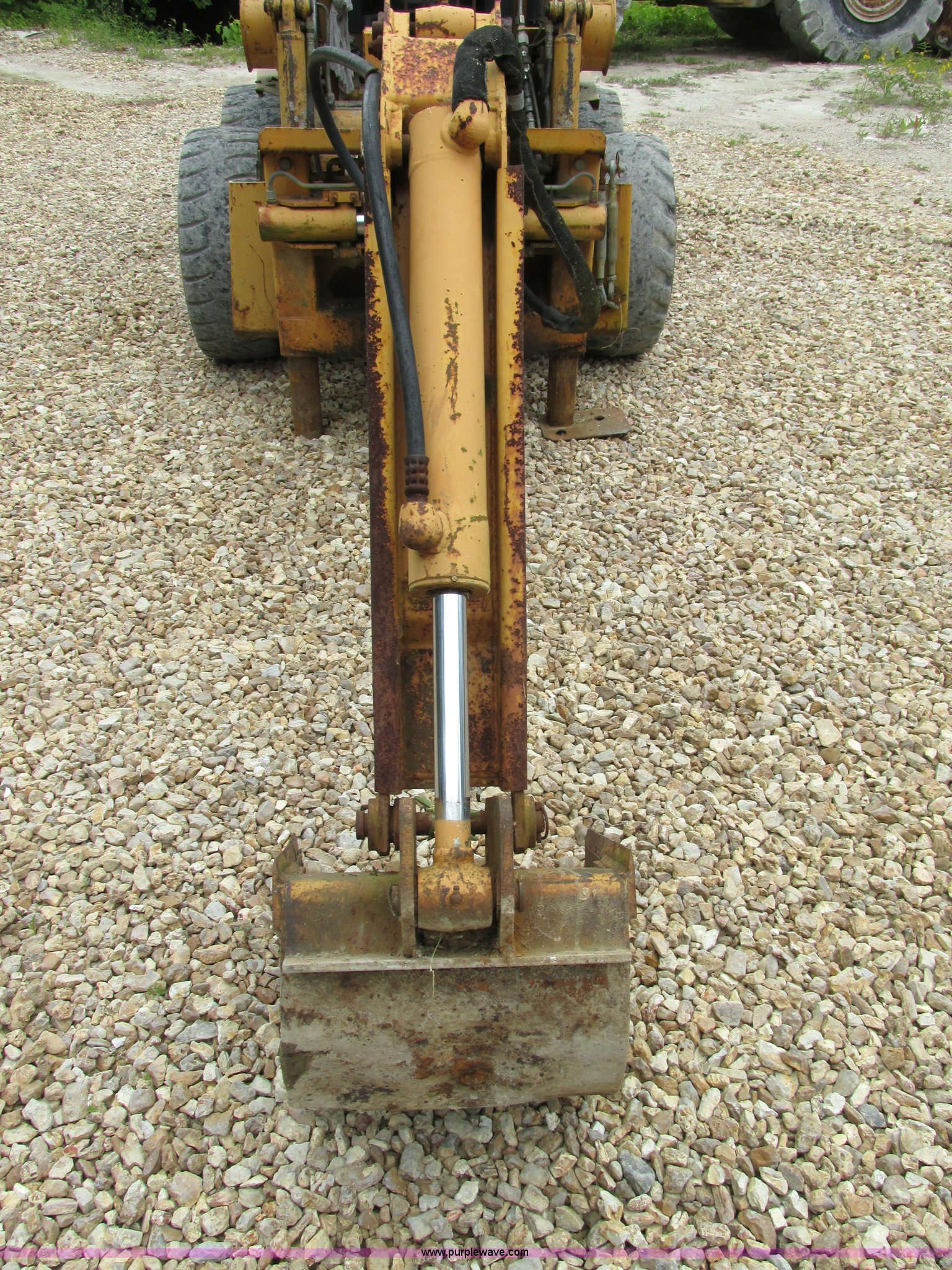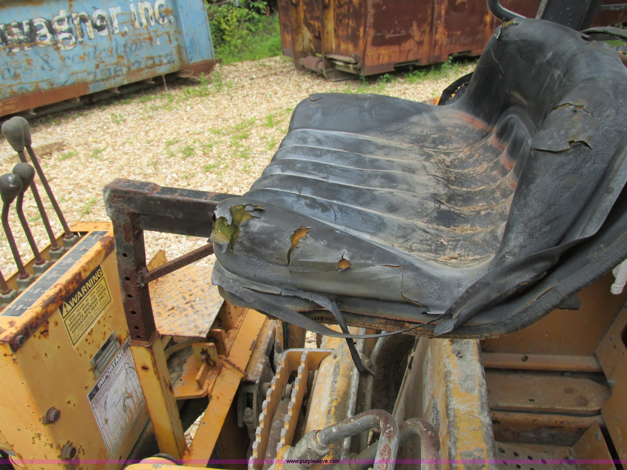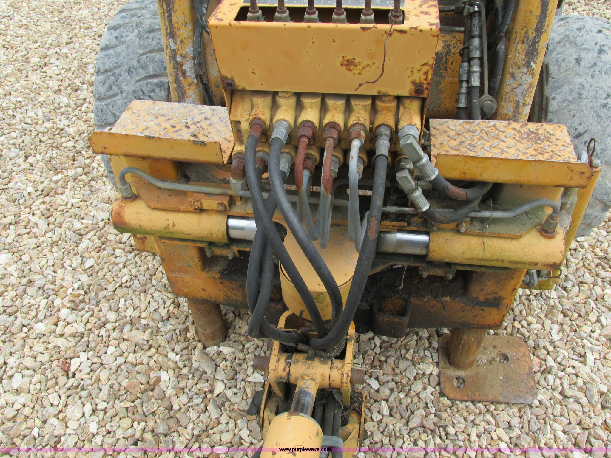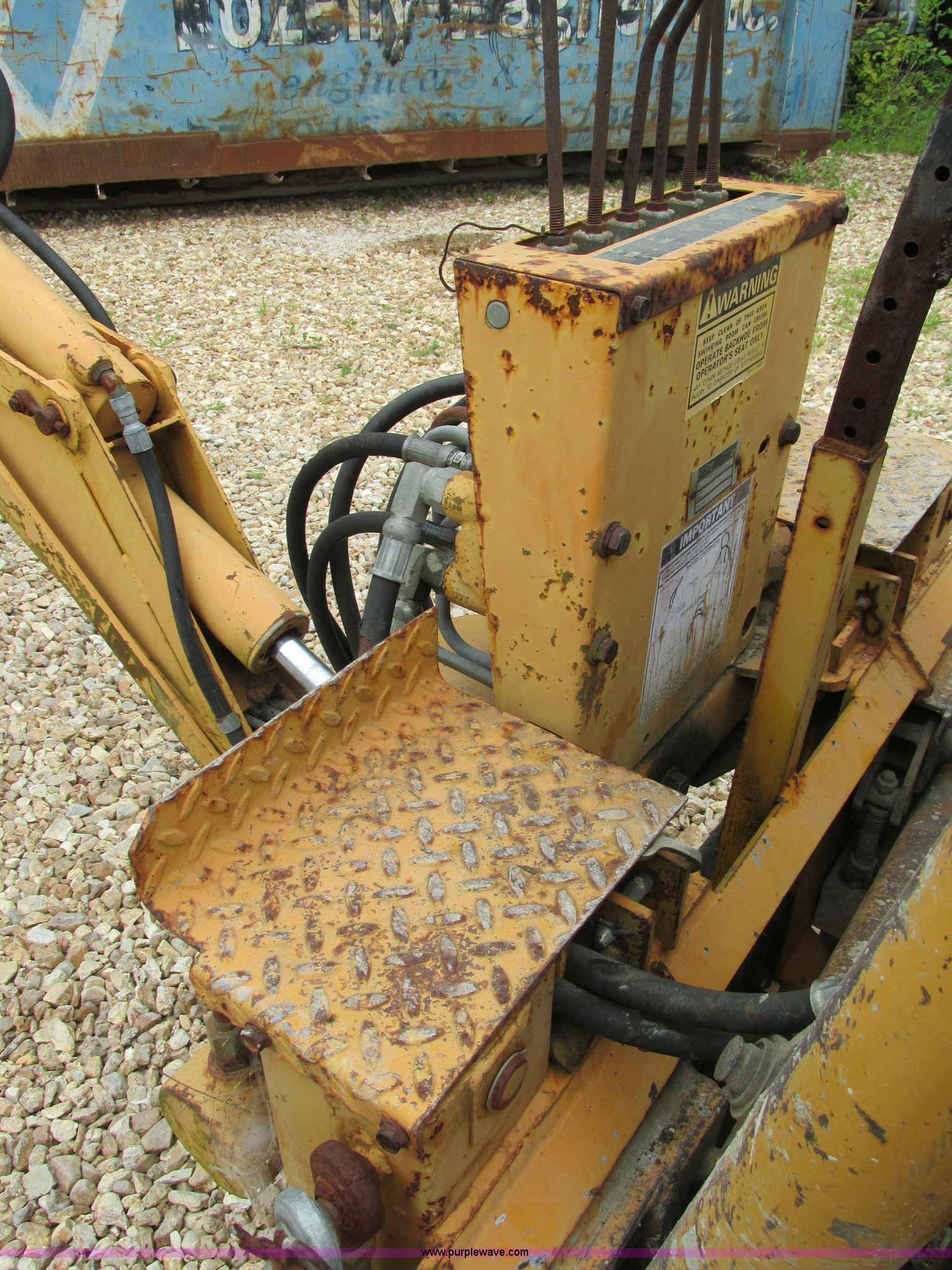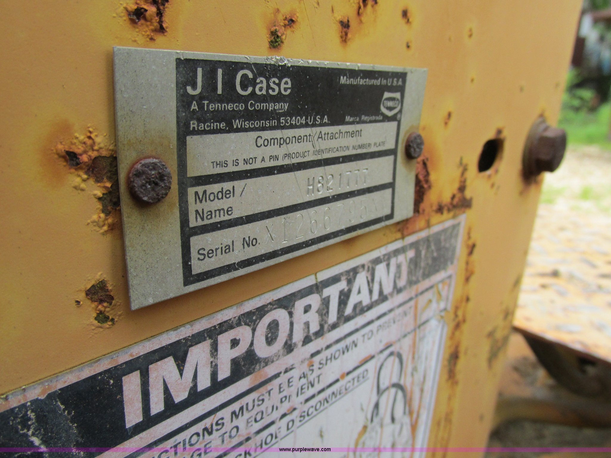 Purple Wave is selling a used Skid Steer Attach. in Missouri. This item is a Case D100 skid steer backhoe attachment with the following: Adjustable seat, Four stick controls, 33"L stick, 17.5"W four tooth bucket, Dual hydraulic outriggers, One pad foot missing, Upper stabilizers included, Seat torn, Serial X1266795