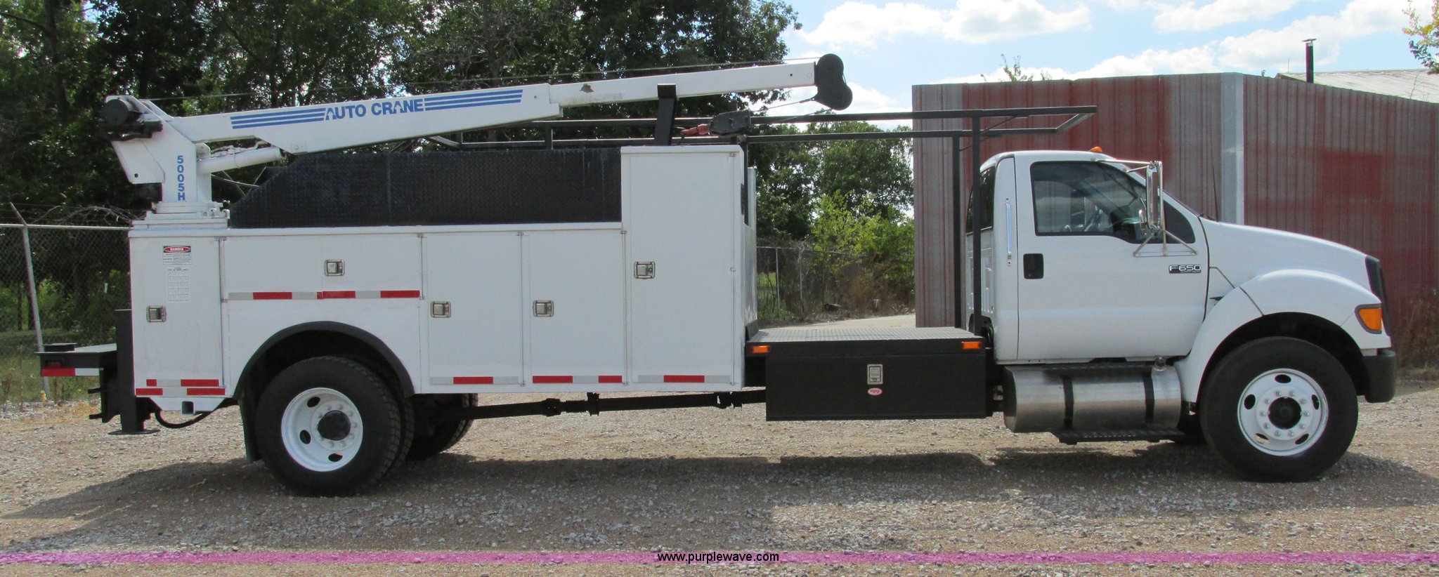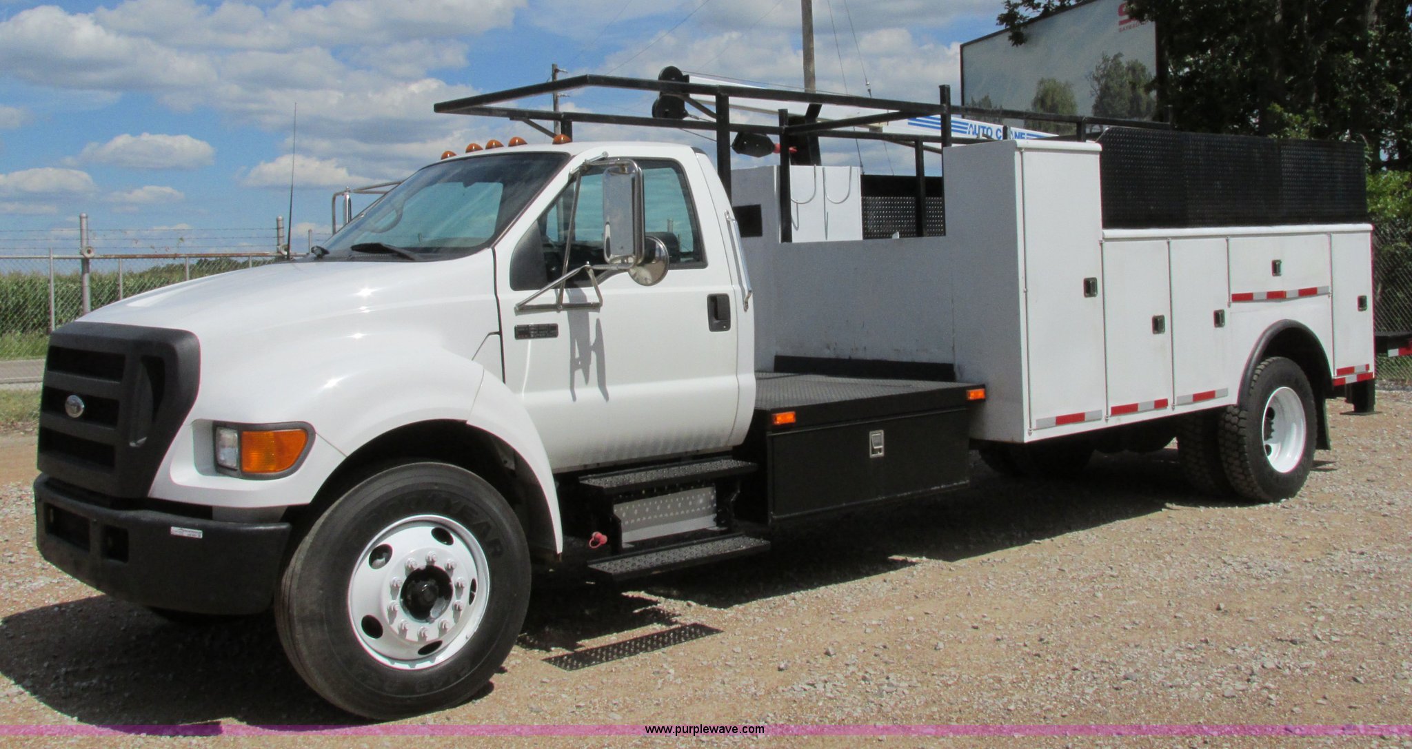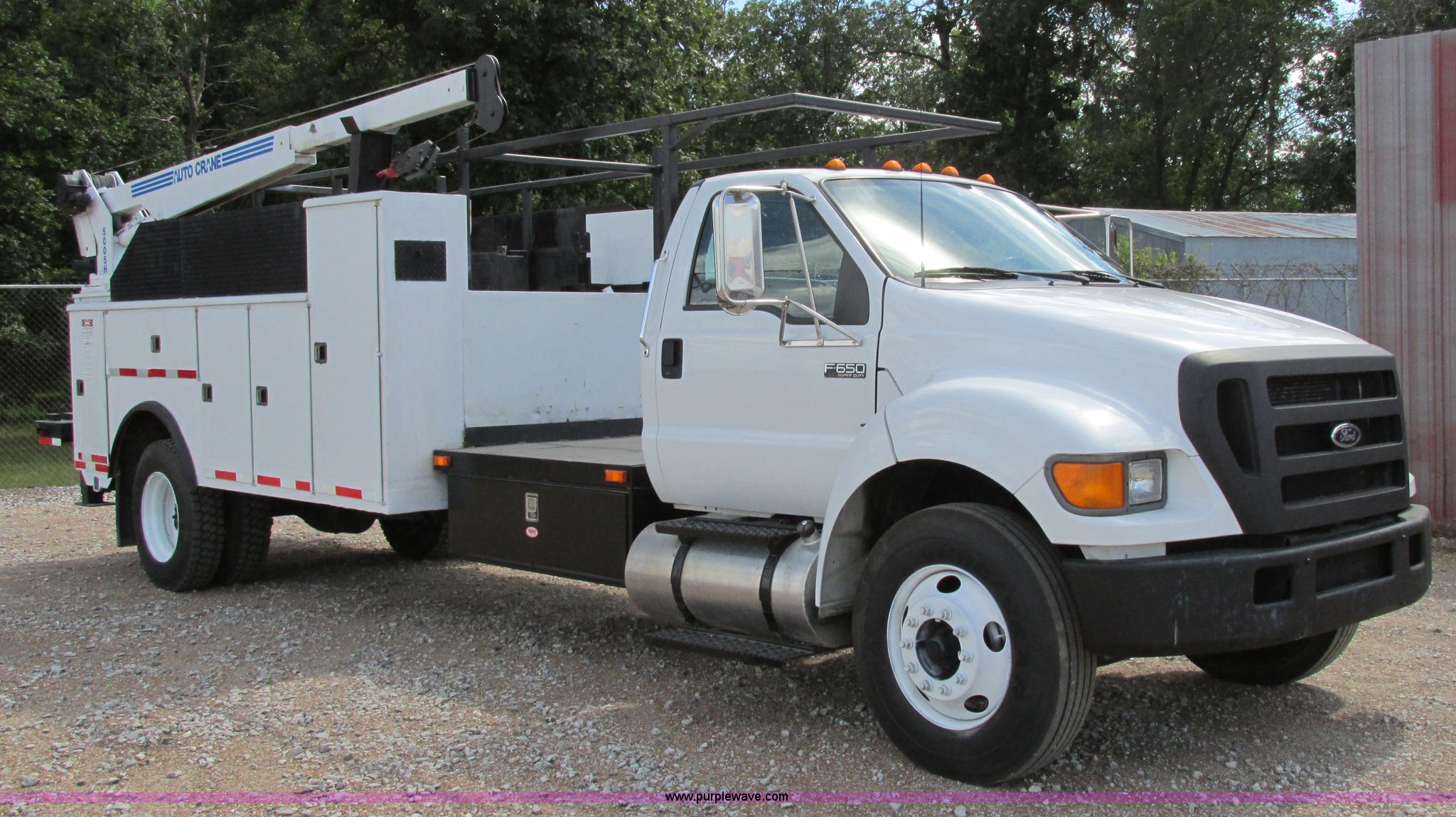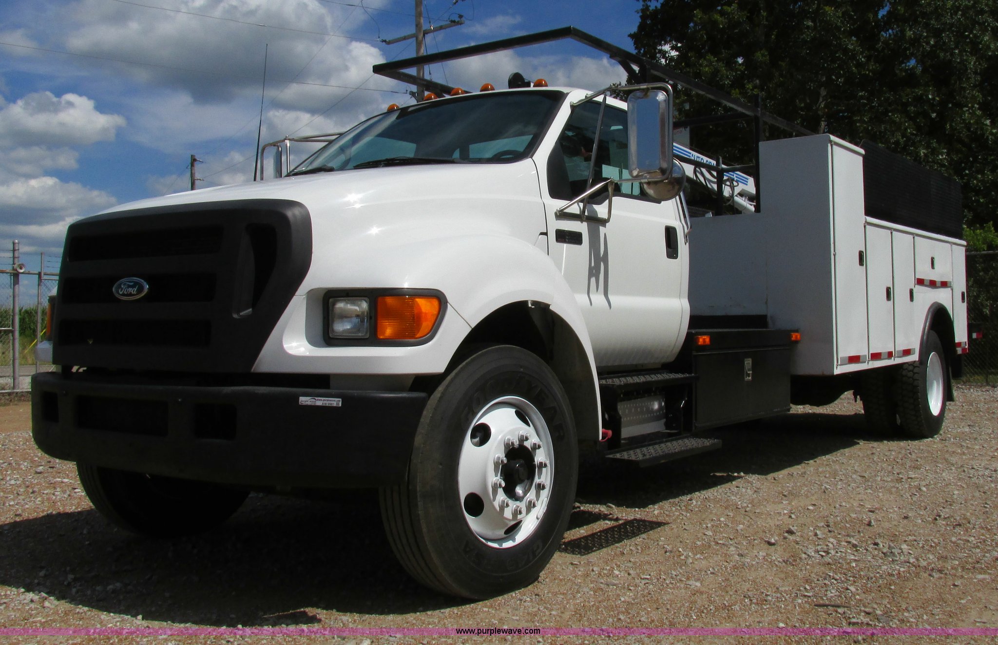 Purple Wave is selling a used Service Truck in Illinois. This item is a 2004 Ford F650 Super Duty XL service truck with crane with the following: 95,465 actual miles, International VT365 6.0L V8 turbo diesel engine, 230 HP, Six speed manual transmission, AC and heat, Tilt, Cruise, AM/FM, Manual windows and locks, Vinyl interior, PTO, Service body, (10) storage compartment, Top side saddle box, Open top, 16'4"L x 55.5"W overhead utility rack, (2) 60" x 17" x 17" under bed boxes, 77" x 66" platform, Steel floor,, Auto Crane 500SH crane, 360 degree rotation, 20'L tethered remote, Serial 44941056-1, Hydraulic outriggers, 98" x 28" rear work platform, Step bumper with vise, 54 gallon fuel tank, Mud flaps, Spring suspension, Hydraulic brakes, Goodyear 10R22.5 tires