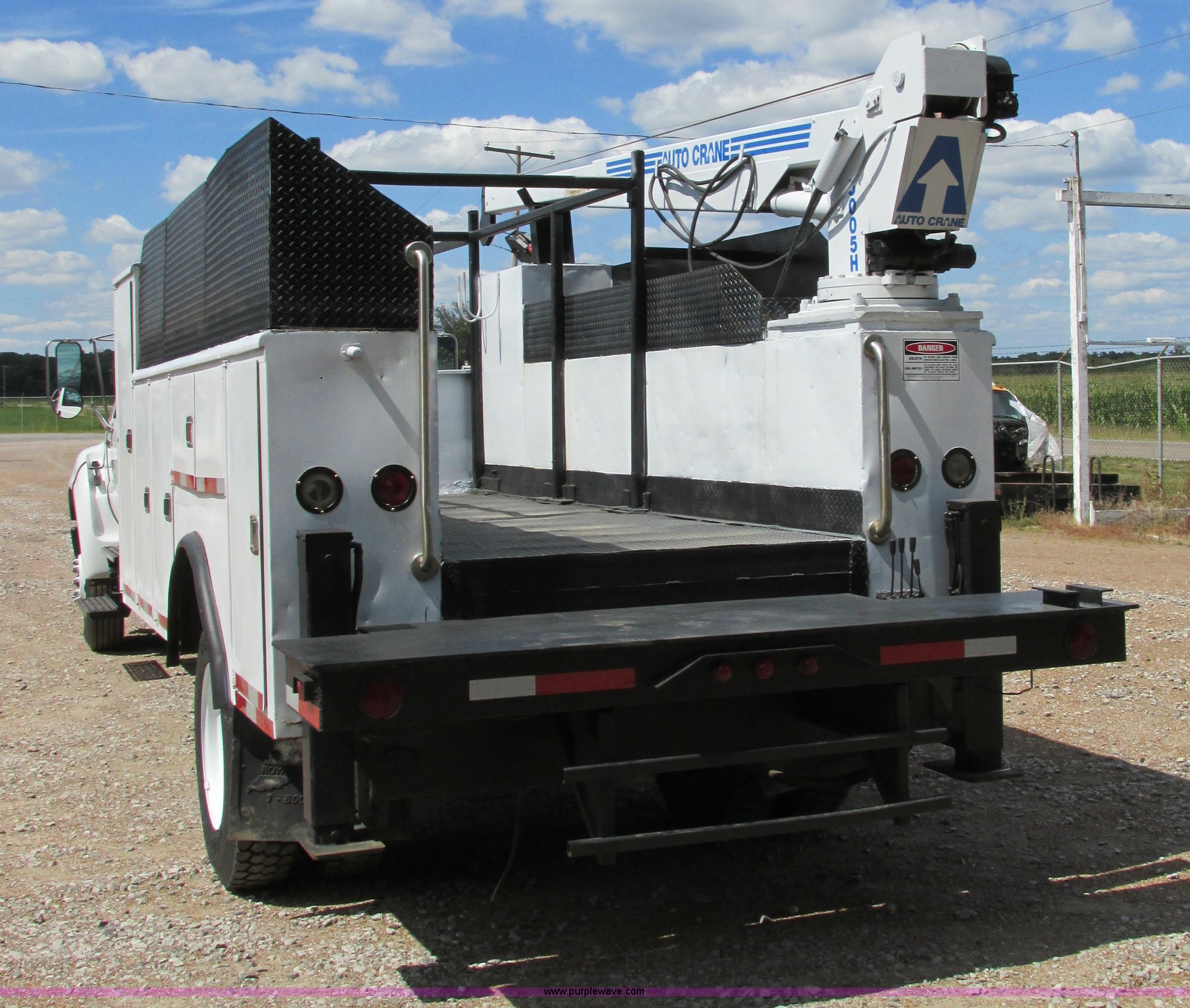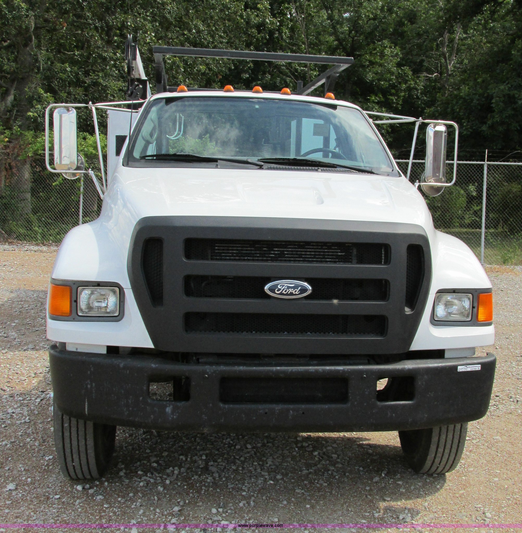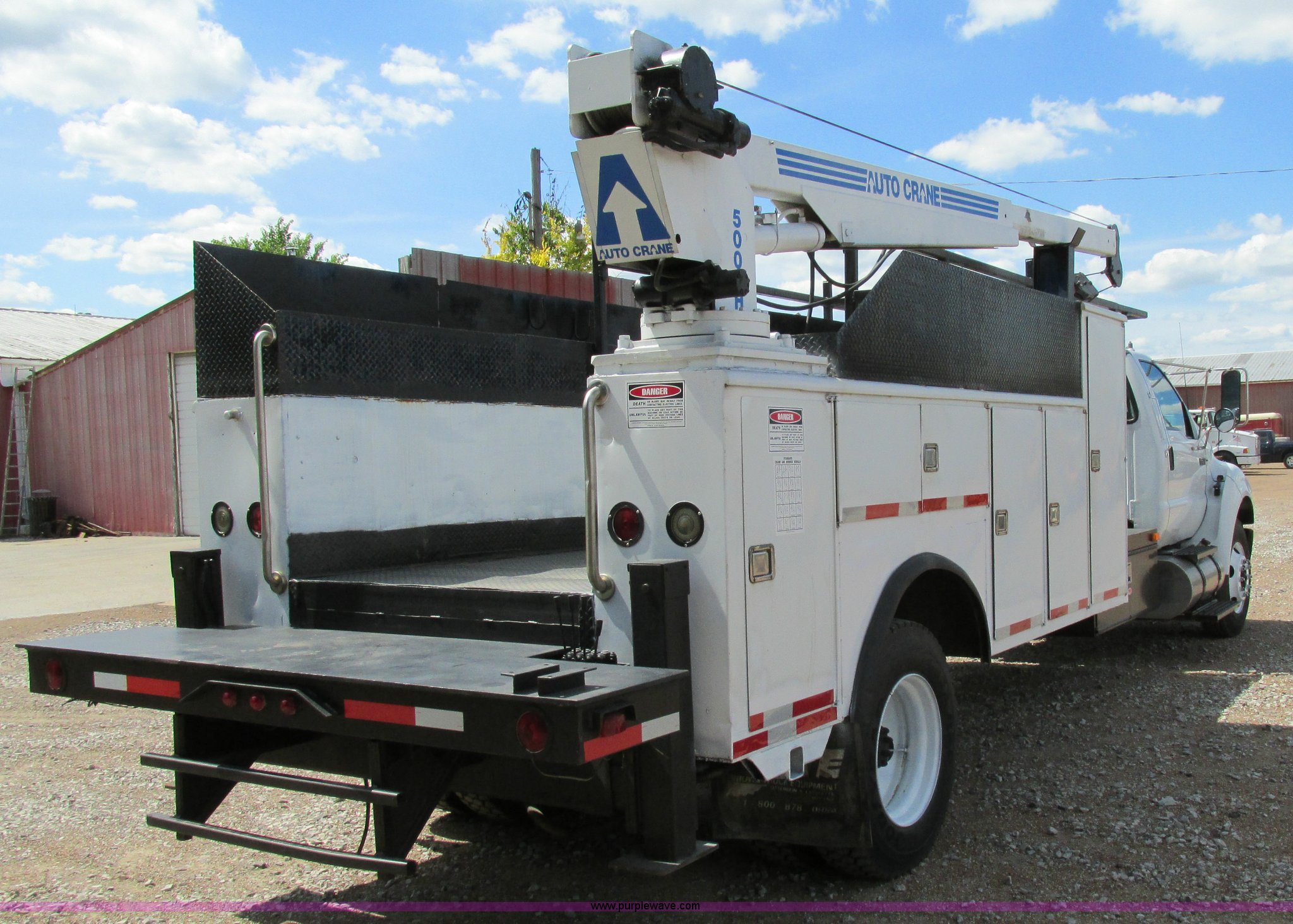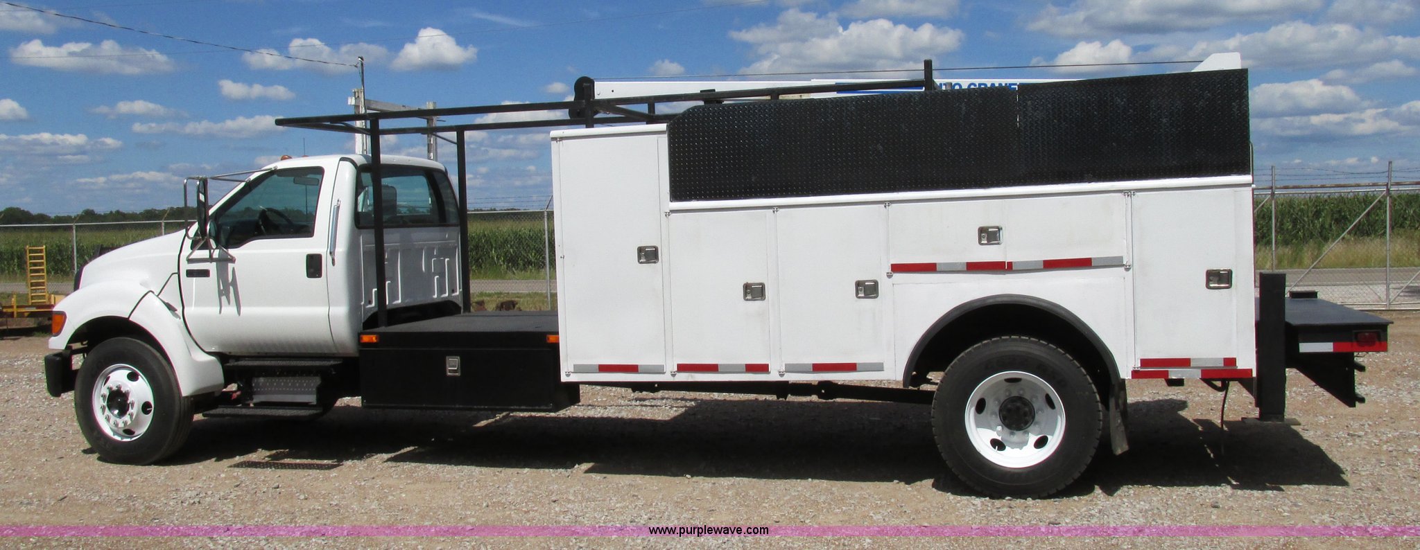 Purple Wave is selling a used Service Truck in Illinois. This item is a 2004 Ford F650 Super Duty XL service truck with crane with the following: 95,465 actual miles, International VT365 6.0L V8 turbo diesel engine, 230 HP, Six speed manual transmission, AC and heat, Tilt, Cruise, AM/FM, Manual windows and locks, Vinyl interior, PTO, Service body, (10) storage compartment, Top side saddle box, Open top, 16'4"L x 55.5"W overhead utility rack, (2) 60" x 17" x 17" under bed boxes, 77" x 66" platform, Steel floor,, Auto Crane 500SH crane, 360 degree rotation, 20'L tethered remote, Serial 44941056-1, Hydraulic outriggers, 98" x 28" rear work platform, Step bumper with vise, 54 gallon fuel tank, Mud flaps, Spring suspension, Hydraulic brakes, Goodyear 10R22.5 tires