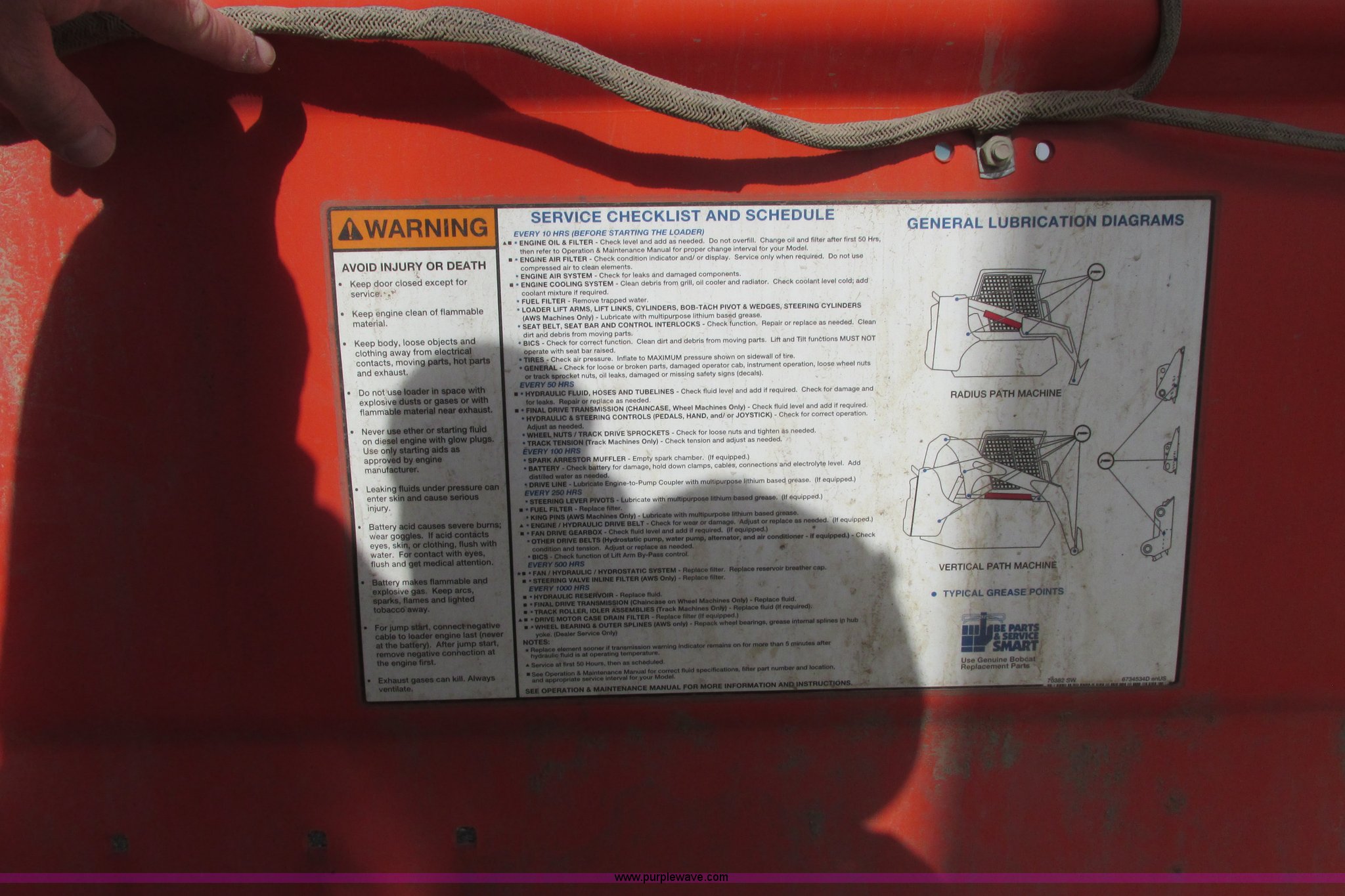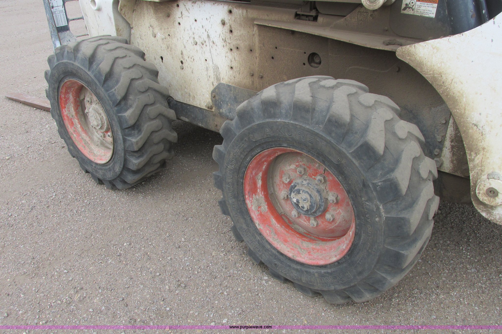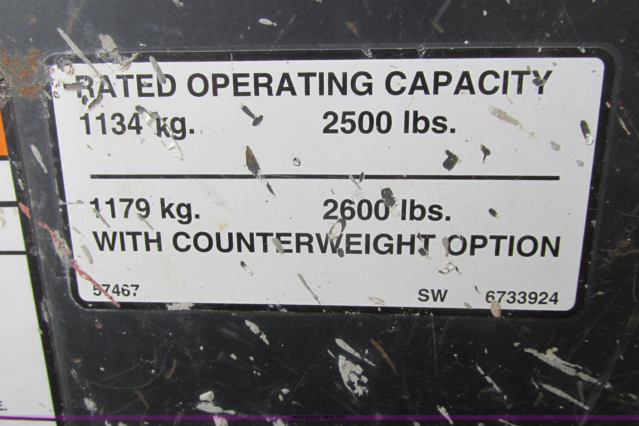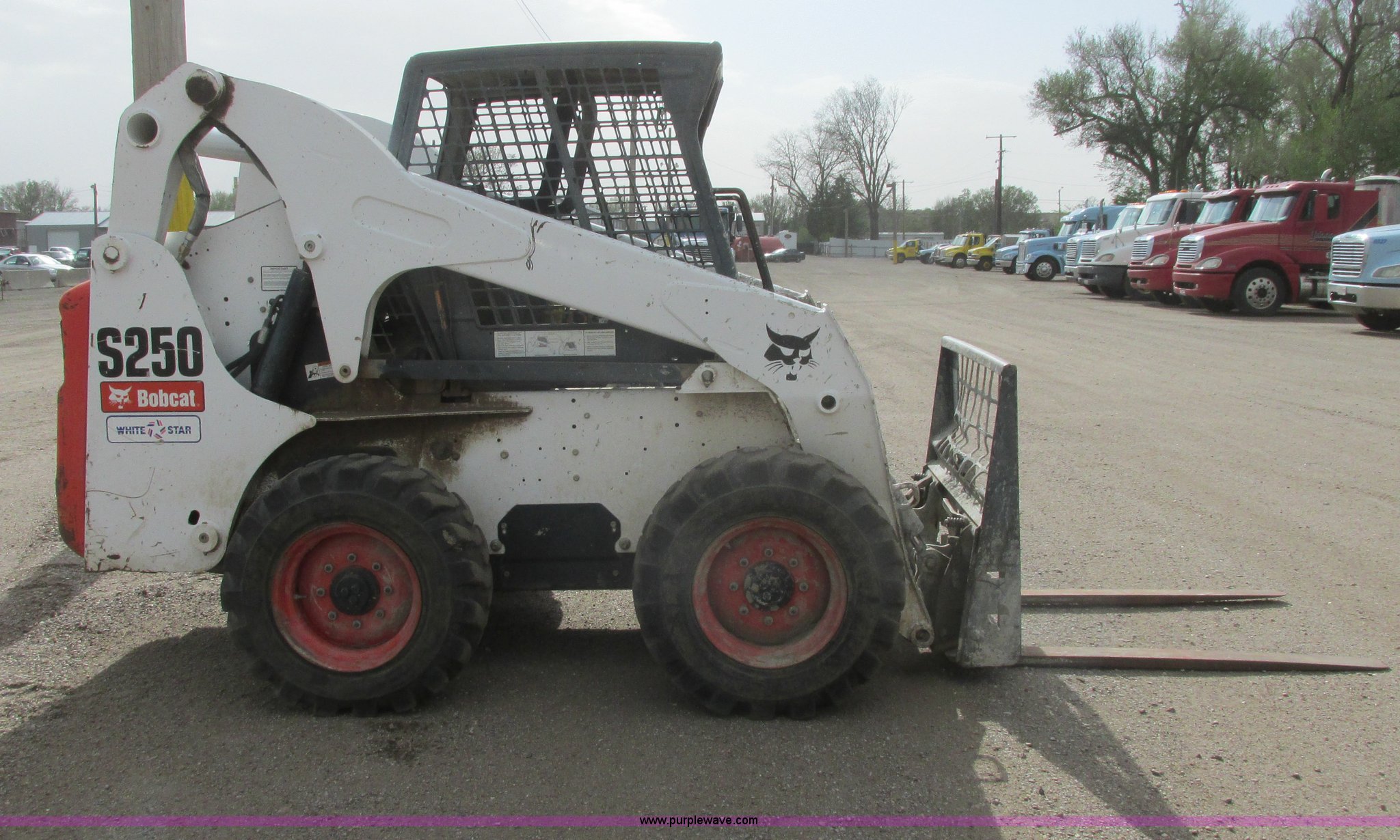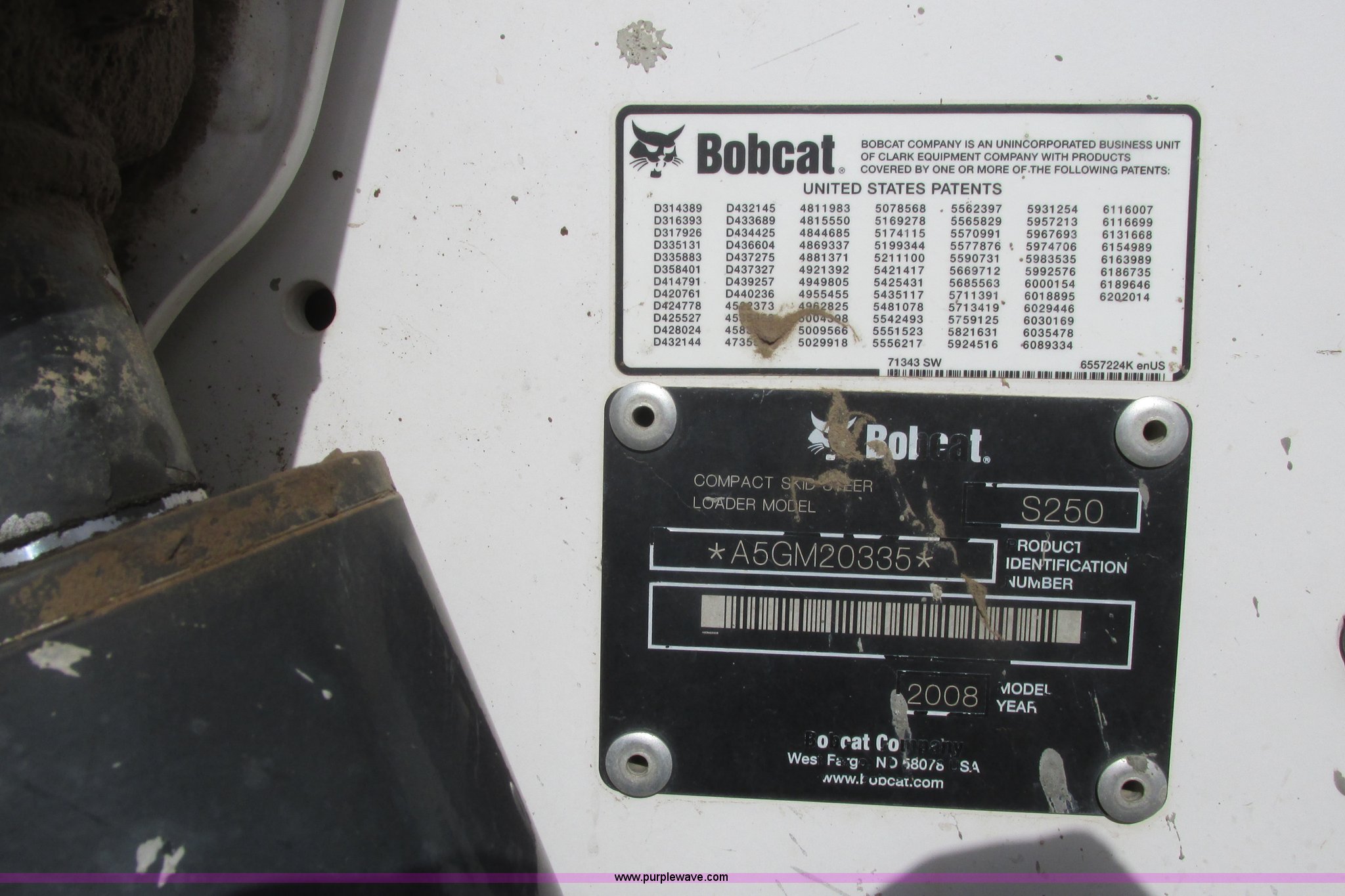 Purple Wave is selling a used Skid Steer Loader in Kansas. This item is a 2008 Bobcat S250 skid steer with the following: 1,833 hours on meter, Kubota V3800-01-T-EUG four cylinder turbo diesel engine, 75 HP, Hydrostatic transmission, OROPS, Spring suspension seat, Hand and foot controls, 6.9 mph travel speed, 25 gallon fuel tank, 48"L x 4"W x 21"H pallet forks, Premium 12-16.5 NHS tires, 2,500 lbs rated operating capacity, 5,000 lbs tipping load, 7,723 lbs. base operating weight, Previously used for masonry work, Serial A5GM20335