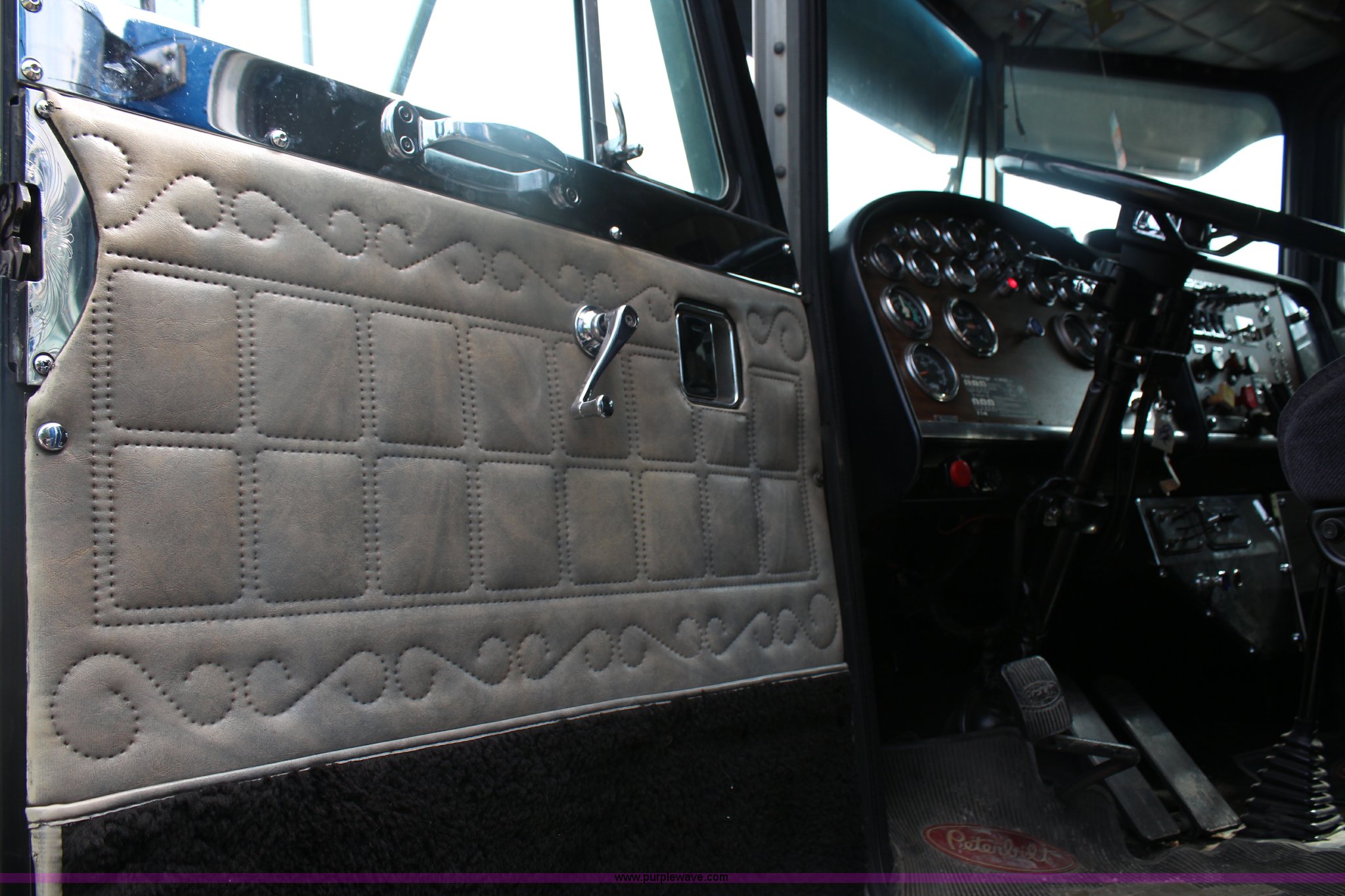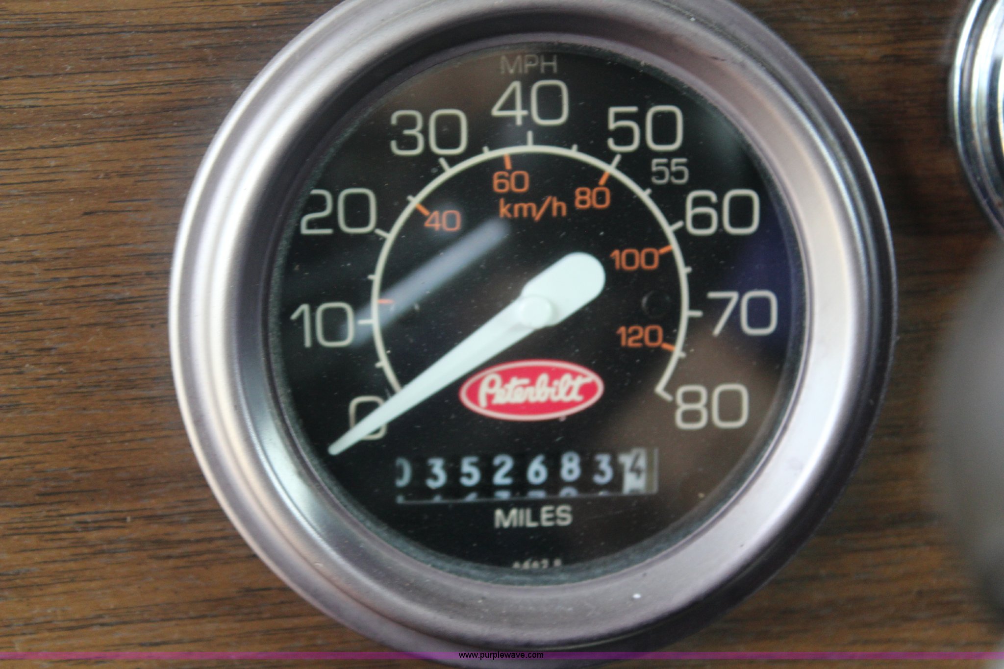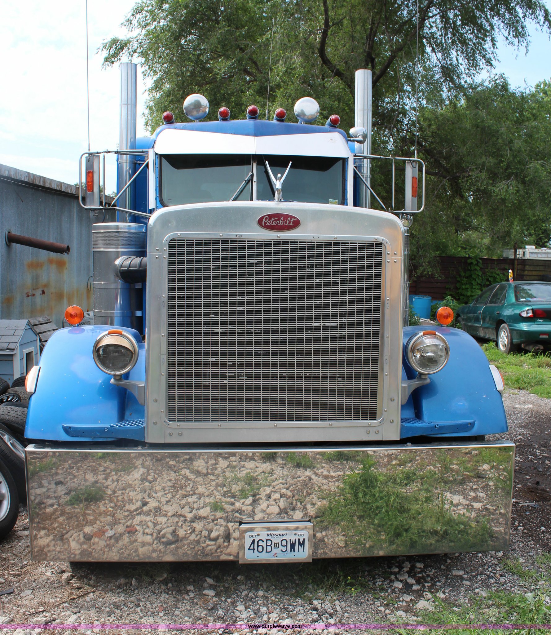 Purple Wave is selling a used Truck Tractor in Kansas. This item is a 1987 Peterbilt 359 Classic semi truck with the following: 352,683 miles on odometer, Caterpillar 3406 14.6L L6 diesel engine, 425 HP, Eaton Fuller 15 speed manual transmission, Twin screw, AC and heat, AM/FM, Heated mirrors, Air suspension seat, 60" sleeper, Spot light, Exterior visor, Chrome bumper, Air slide fifth wheel plate, Dual 100 gallon fuel tanks, Stainless steel quarter fenders, Dual front exhaust stack, Aluminum deck plate, Dump valves, Air suspension, Air brakes, Jake brake, Aluminum wheels, Wheel nut covers, 11R24.5 tires, GVWR 50,000 lbs, FAWR 12,000 lbs, IAWR 19,000 lbs, RAWR 19,000 lbs, Decals will be removed prior to auction