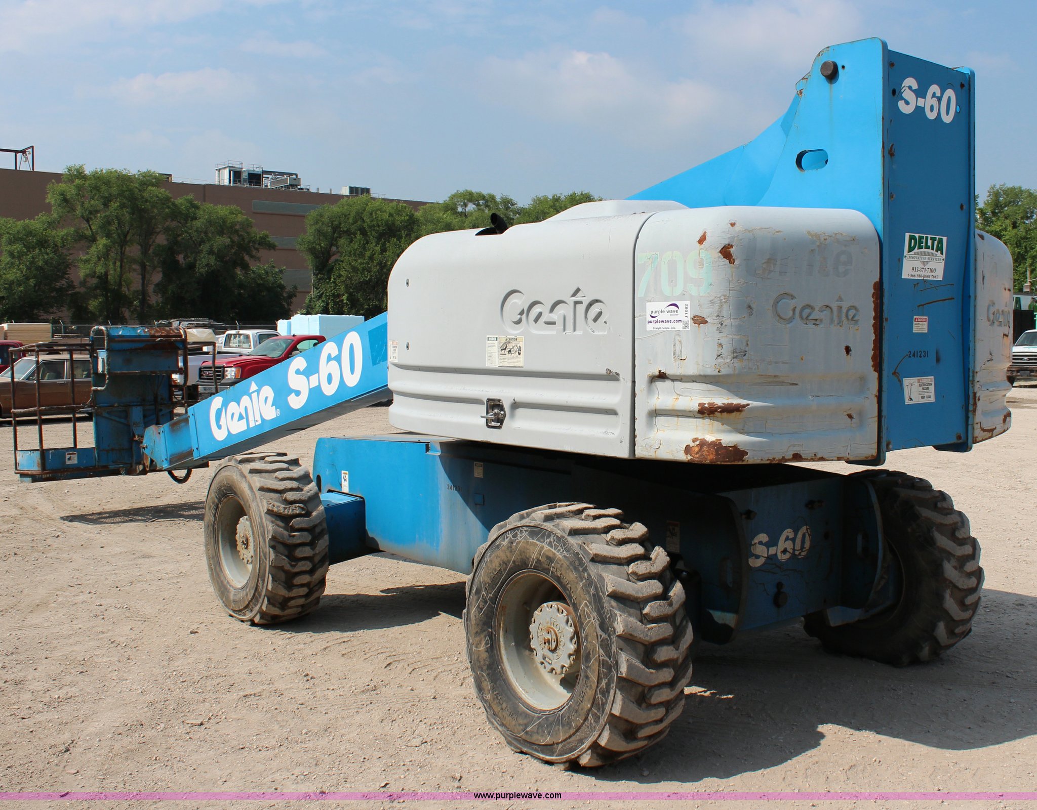 Purple Wave is selling a used Boom Lift in Kansas. This item is a 2000 Genie S60 boom lift with the following: 6,311 hours on meter, Ford four cylinder dual fuel engine, Gas or propane capable, Four wheel drive, 600 lbs maximum lift capacity, 60' maximum platform height, 57'3" maximum platform reach, 15-19.5 NHS tires, Serial S60-6637