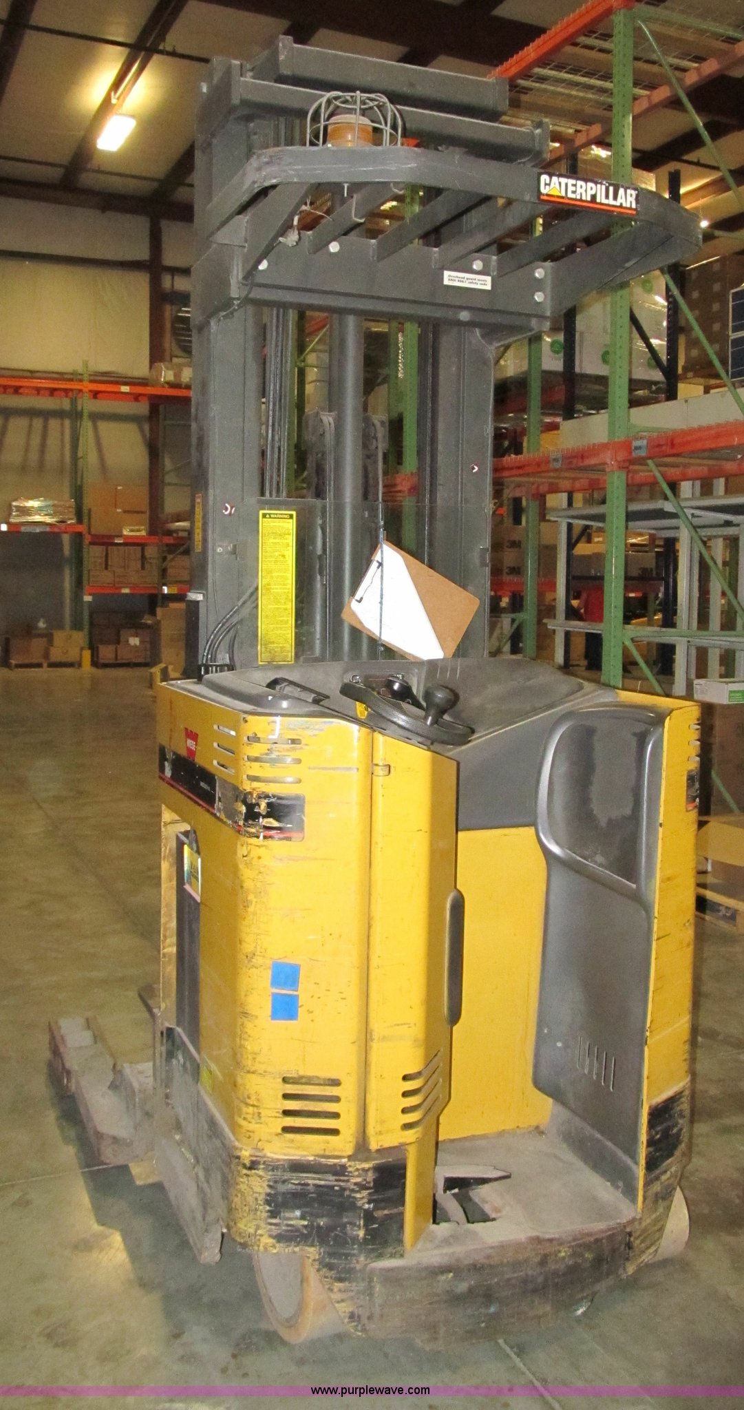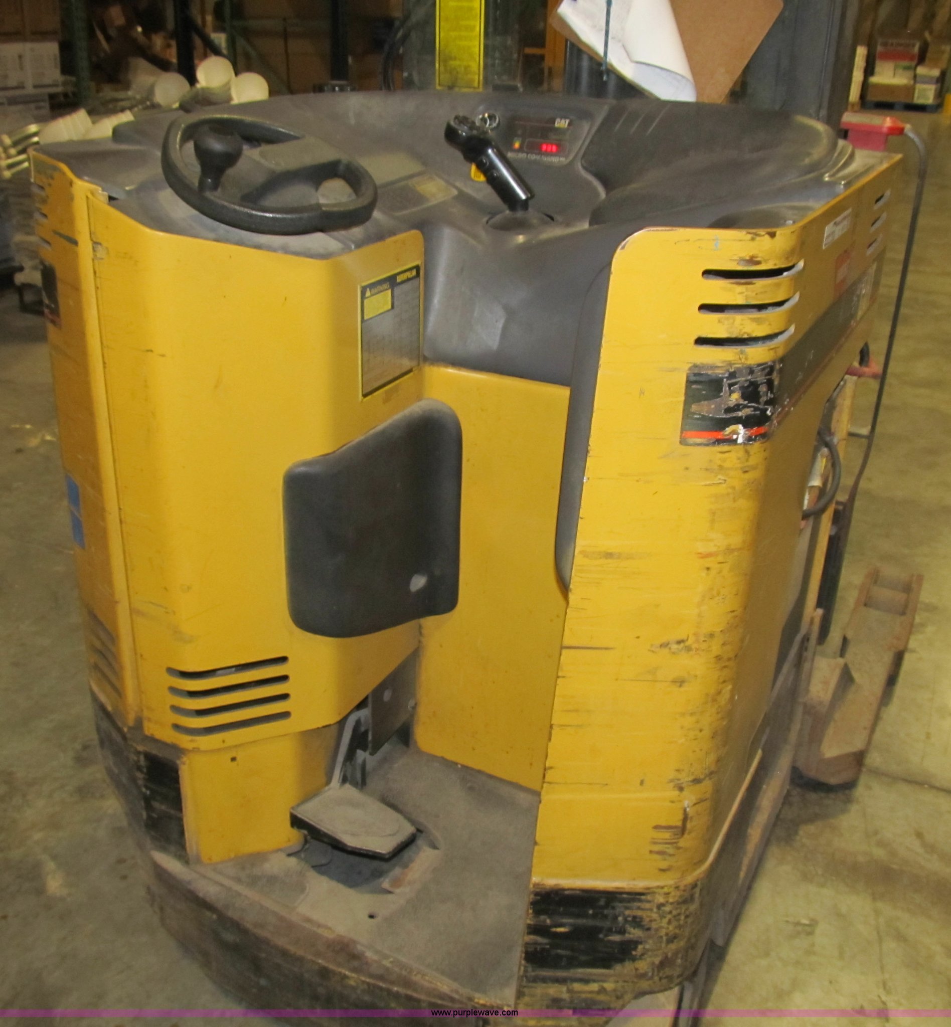 Purple Wave is selling a used Warehouse Forklift in Missouri. This item is a Caterpillar NRR40 forklift with the following: 4,365 hours on meter, 4,000 lbs maximum lift capacity, 245" maximum lift height, 24" slide-out fork carriage, 42"L forks, Three stage mast, Side shift, Built-in digital scale, Overhead protection, 36V system, Charger, Fork tilt has intermittent problems, Serial 2GL05867