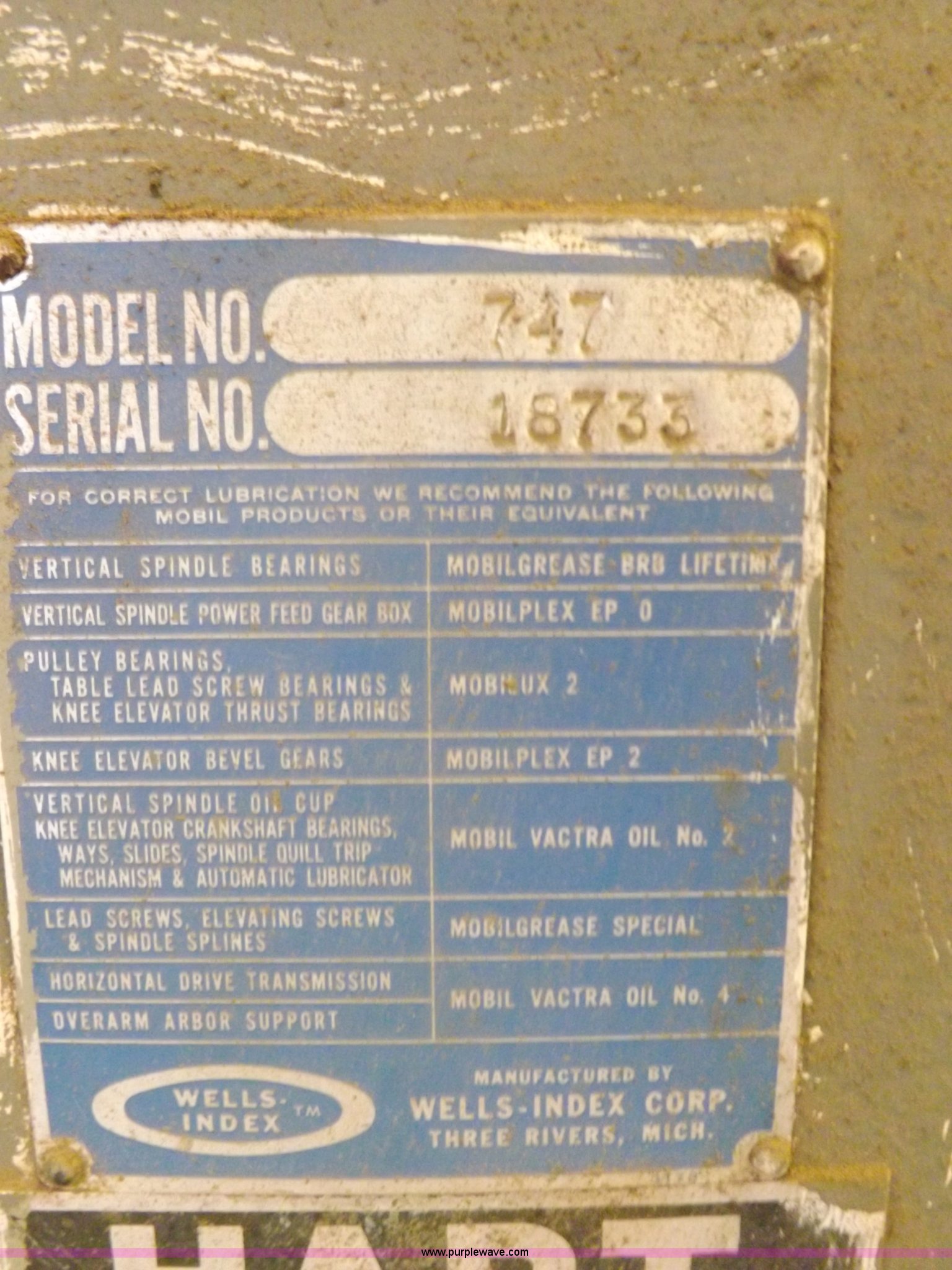 Purple Wave is selling a used Milling Machines in Oklahoma. This item is a Wells Index milling machine with the following: Model 747, 1 HP, 230/460V, Three phase, Variable spindle speed, 9" x 47" table, Hard wired at present location, Serial 18733