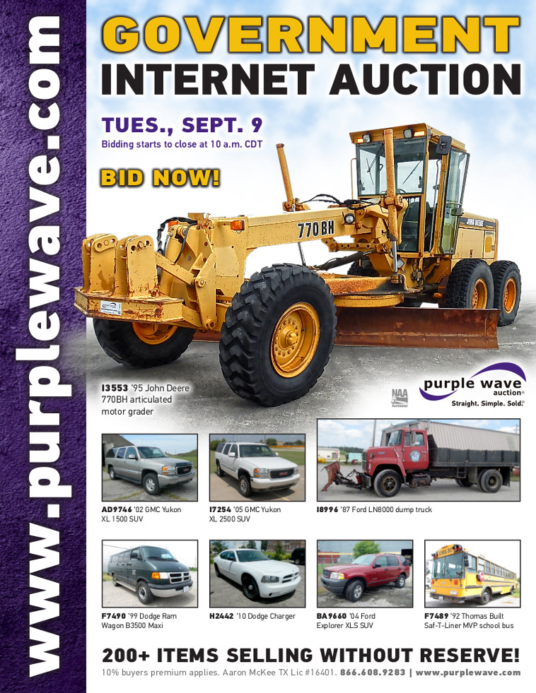 Bids over the amount of $10,000.00 are subject to Purple Wave's qualification process. Verification may include, but is not limited to, providing a bank letter of guarantee, credit references or credit card pre-authorization. Purple Wave may take any or all of these measures at any point during the auction. Purple Wave reserves the right to strike any Internet bid if the bidder refuses or fails to timely cooperate with Purple Wave's efforts to verify the bidder's qualification to bid. By registering to bid in this auction, you authorize all credit references, banks and credit reporting agencies to provide complete information about your credit to Purple Wave. For questions regarding Purple Wave's bid qualification process, please contact Amanda Hawk, Credit Specialist, at [email protected] or call 785.246.5718.