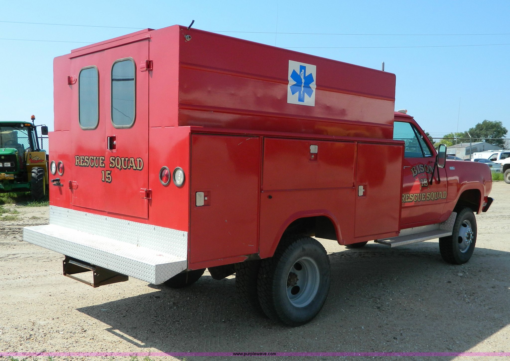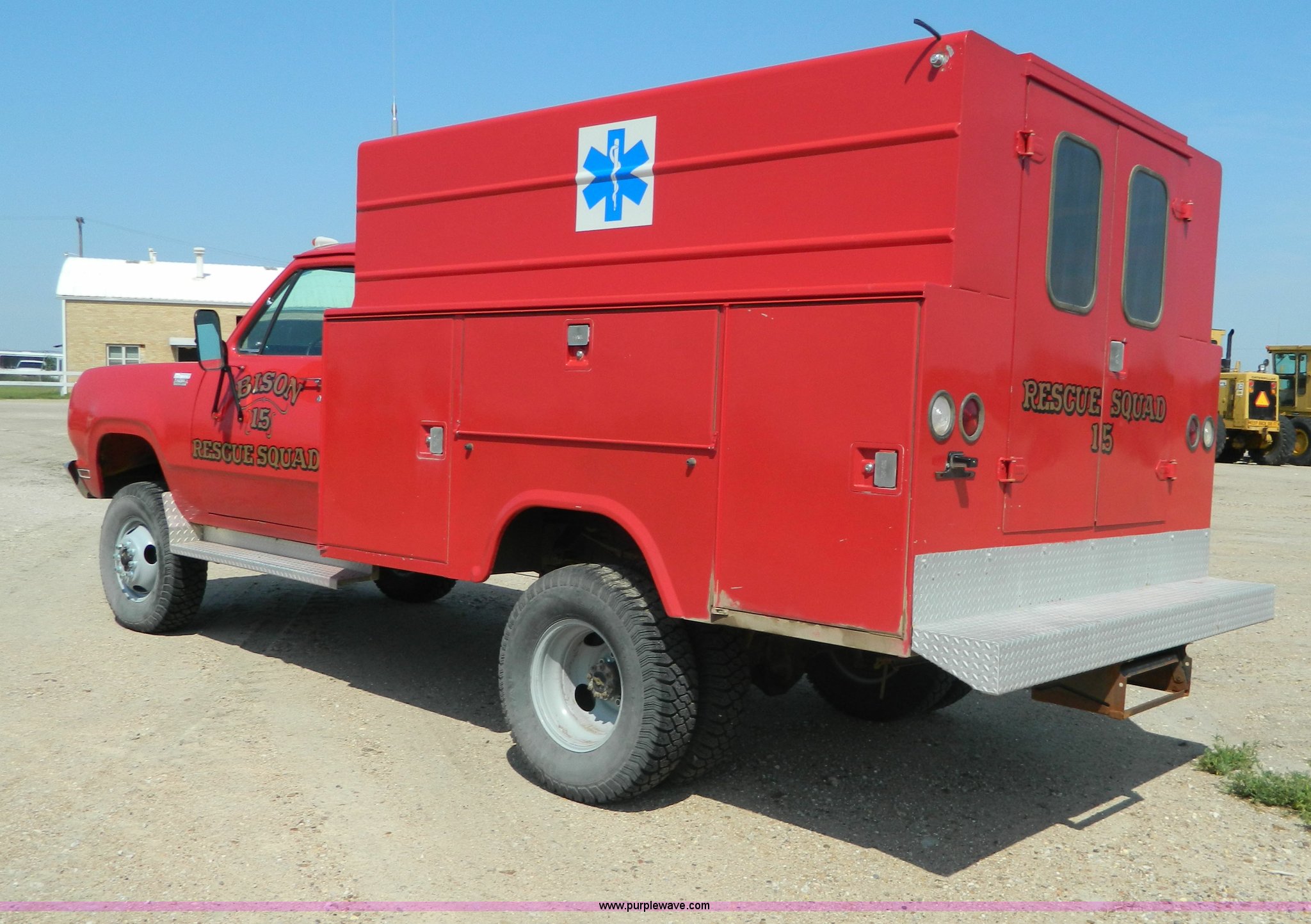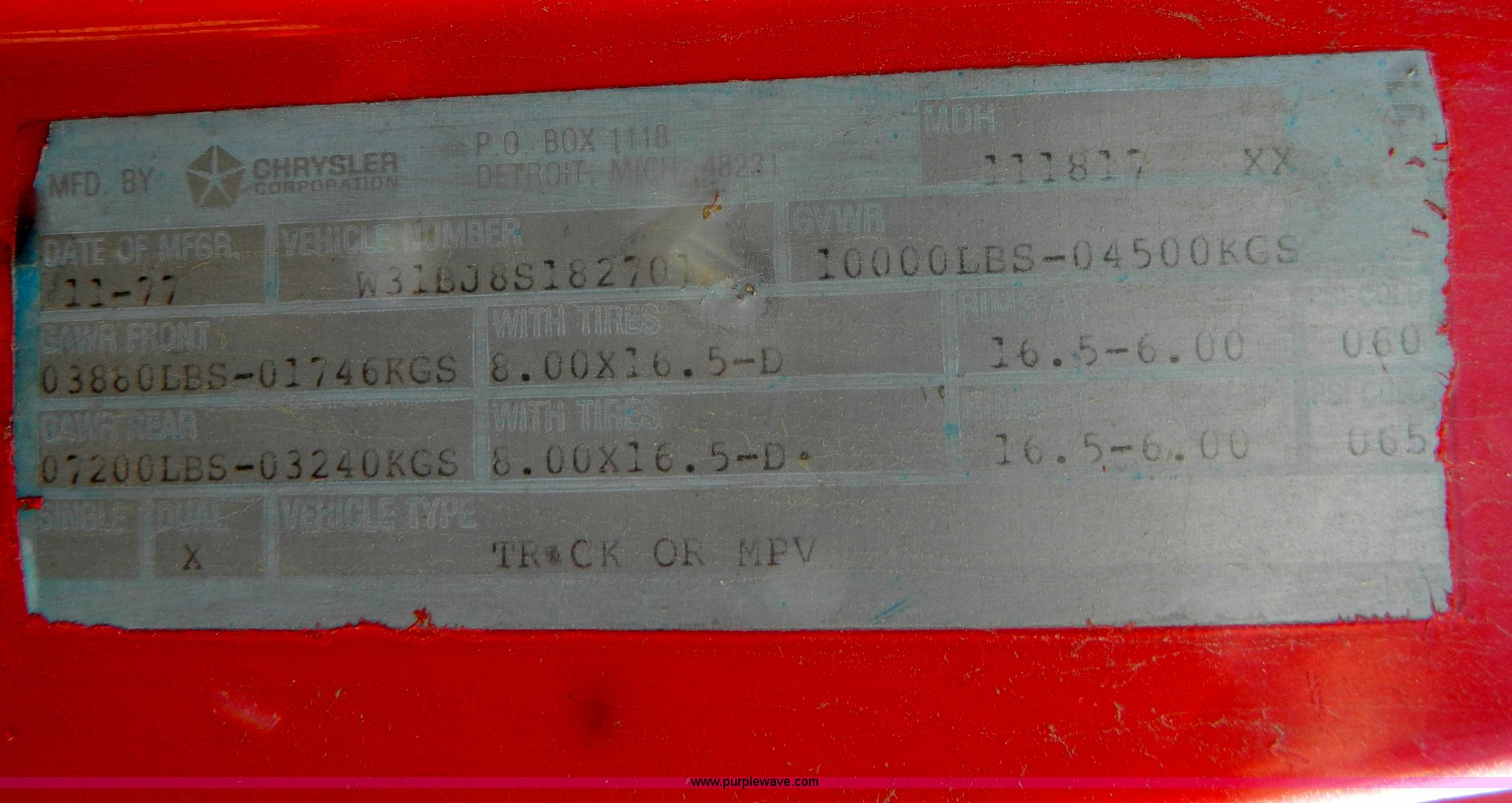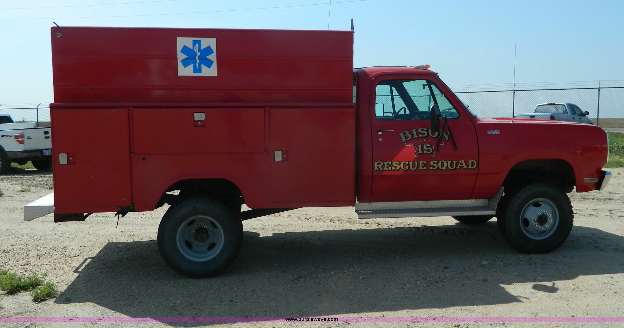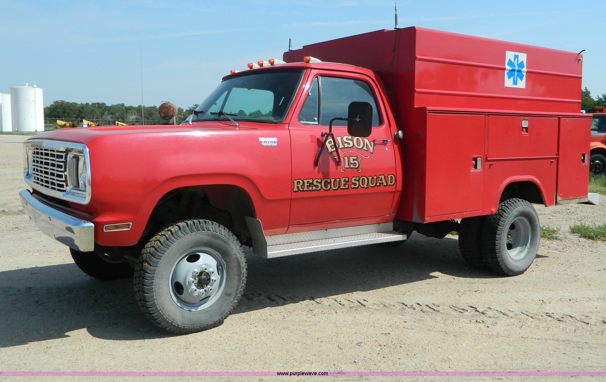 Purple Wave is selling a used Fire Truck or Emergency Vehicle in Kansas. This item is a 1978 Dodge fire rescue vehicle with the following: 42,677 miles on odometer, V8 gas engine, Automatic transmission, Four wheel drive, Heat, AM, Manual windows and locks, Cloth interior, Utility bed, Over load springs, Battery kill switch, LT235/85R16 tires, GVWR 10,000 lbs, Brakes weak, Transmission weak, Interior/exterior cosmetic damage