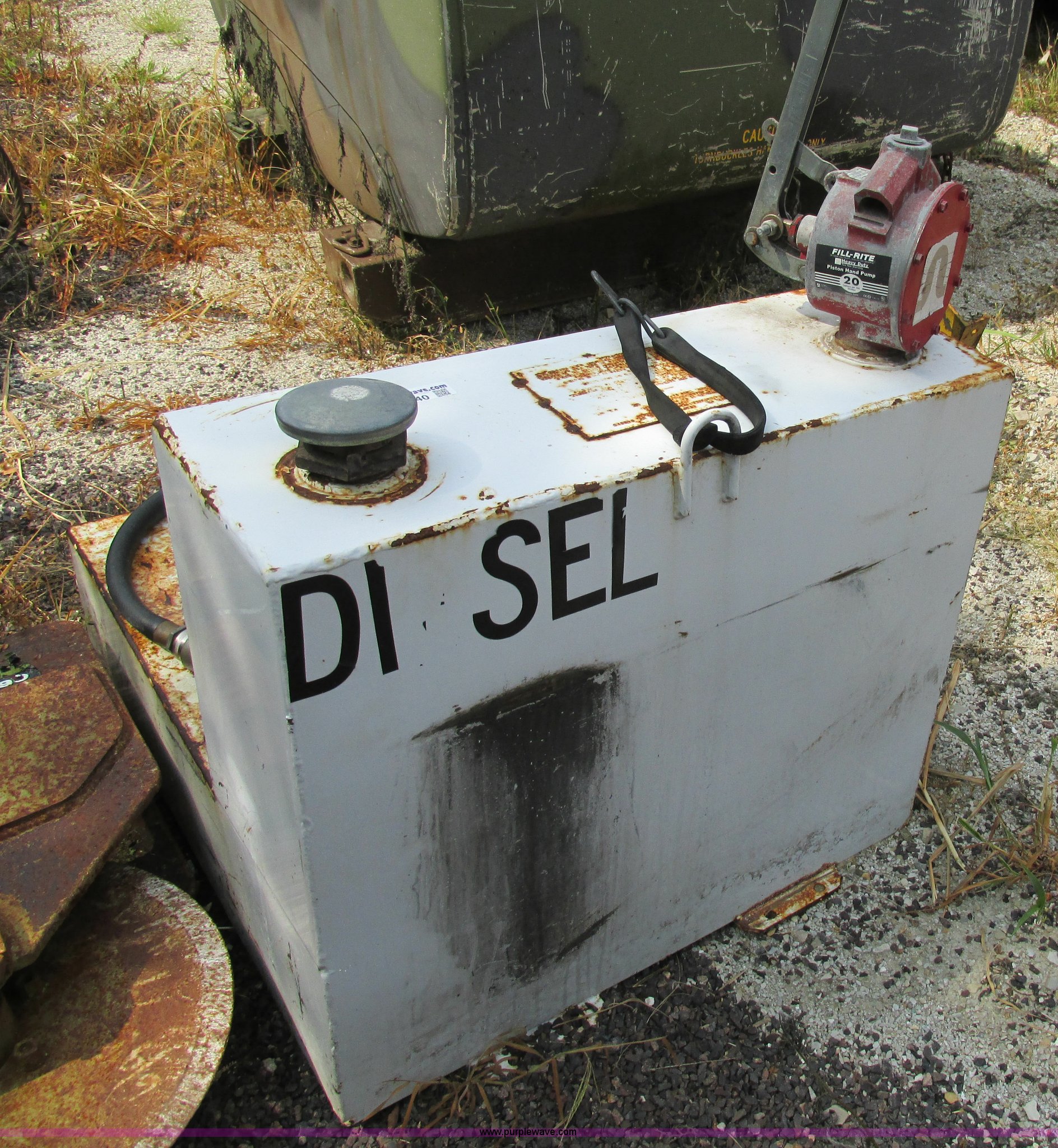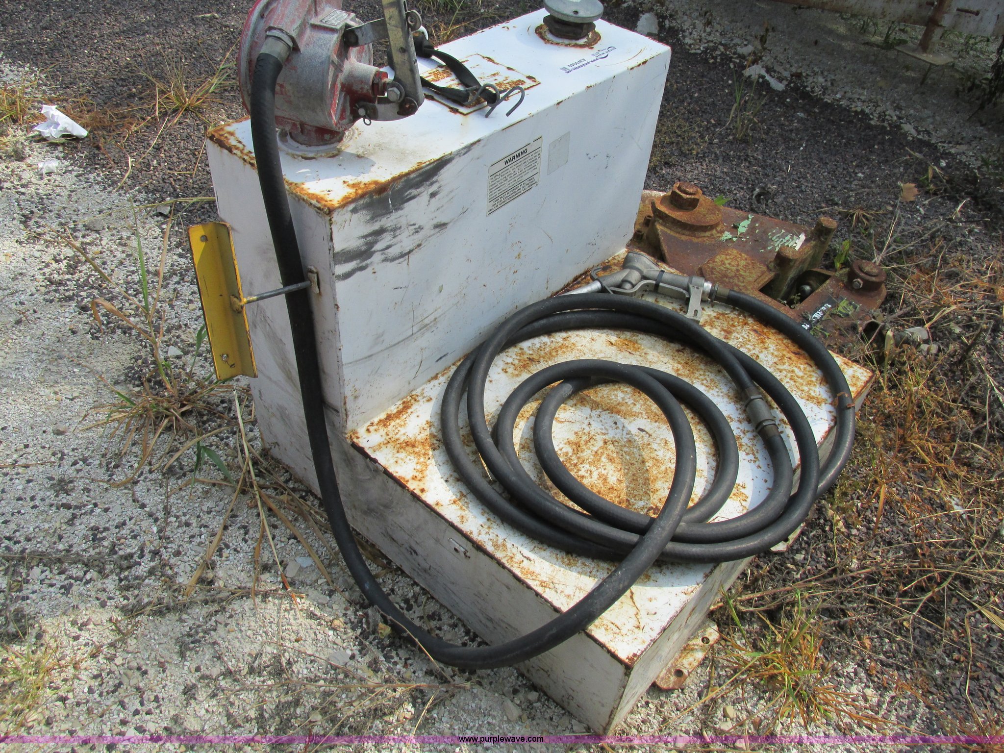 Purple Wave is selling a used Fuel and Lube in Missouri. This item is a L-shaped fuel tank with the following: 52 gallon capacity, Hand operated fuel pump, Nozzle, Previously used for diesel