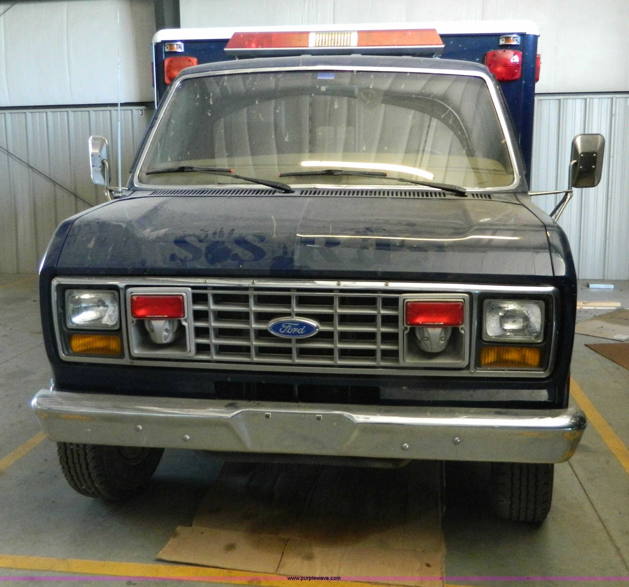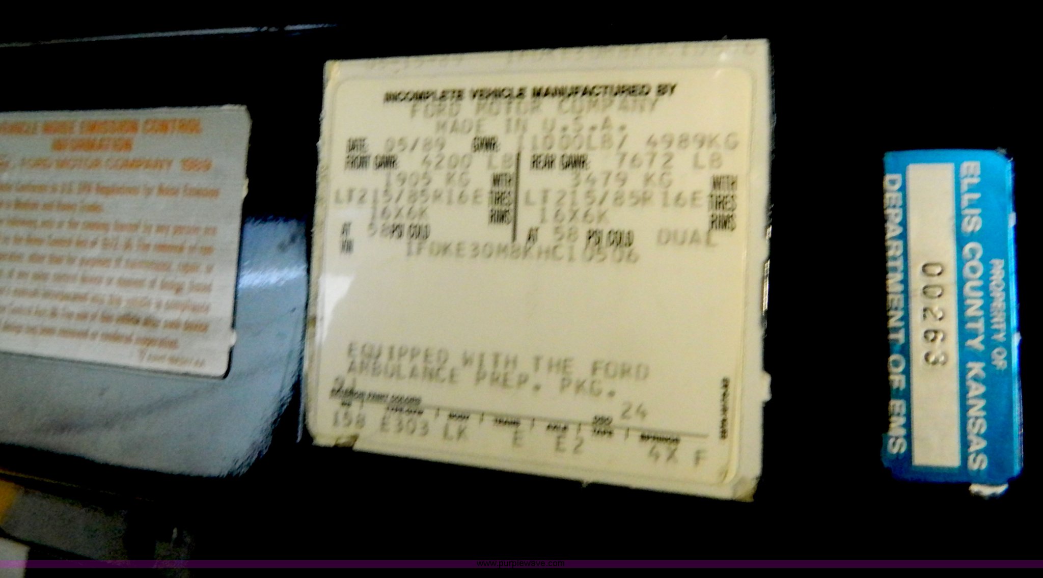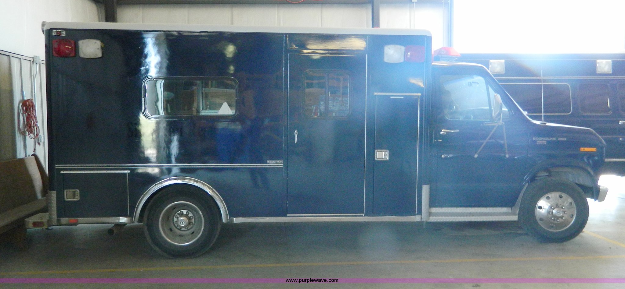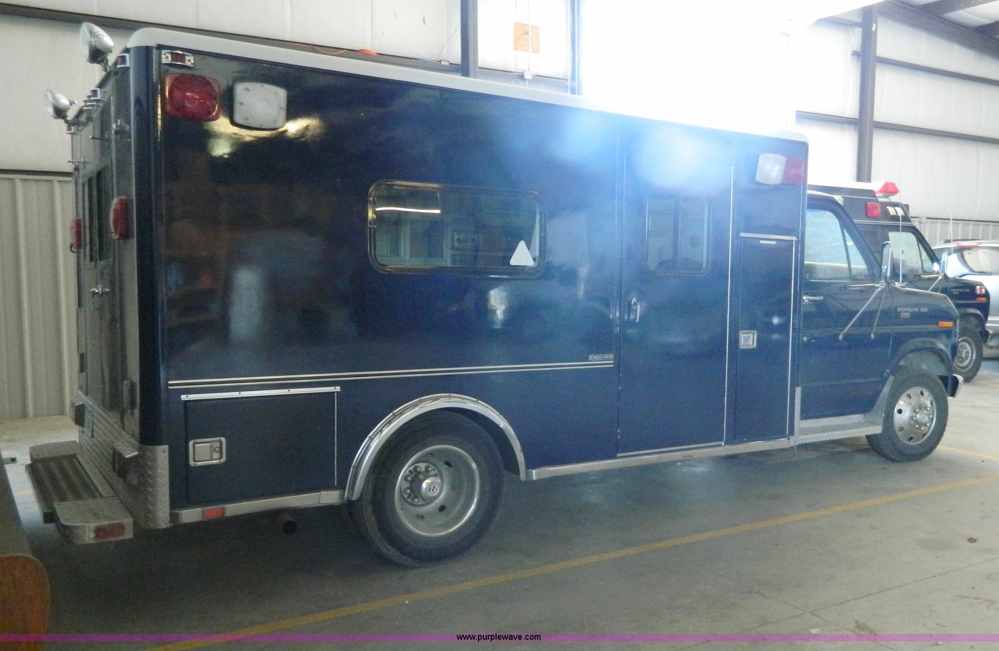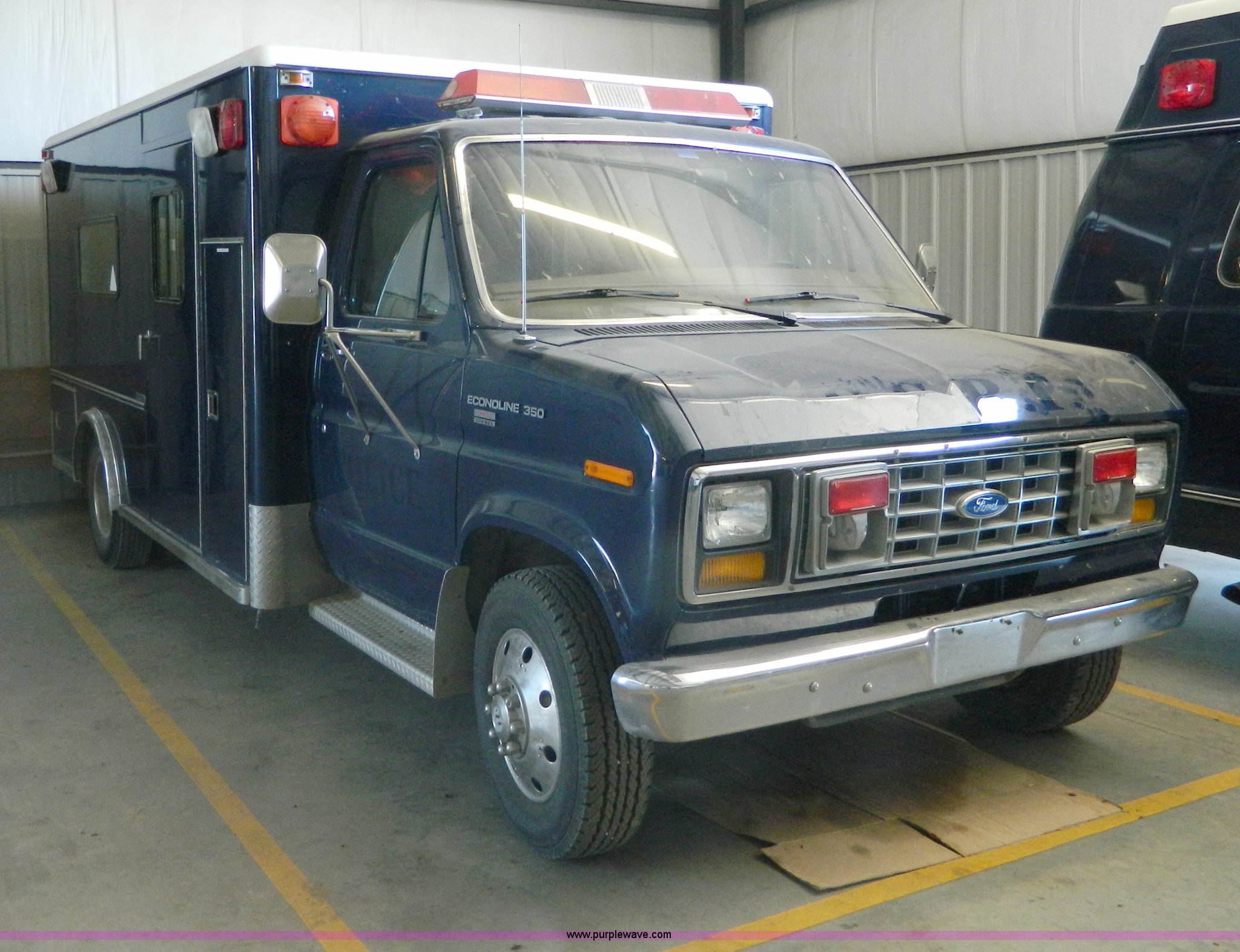 Purple Wave is selling a used Fire Truck or Emergency Vehicle in Kansas. This item is a 1989 Ford Econoline E350 ambulance with the following: 47,928 miles on odometer, Actual Mileage Unknown, 7.3L V8 OHV 16V diesel engine, Automatic transmission, AC and heat, Cruise, AM/FM/cassette, Manual windows and locks, Cloth interior, Vanner Series 30 charger, 500 MR conversion, SVP electronic siren, Code 3 light bar, LT215/85R16 tires, GVWR 10,000 lbs, Engine has fuel leak when running, Hard to start, Unknown fuel issue, Aluminum center table not included, Decal residue