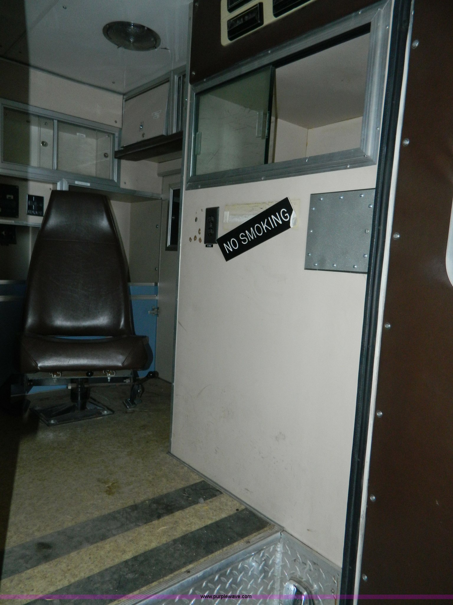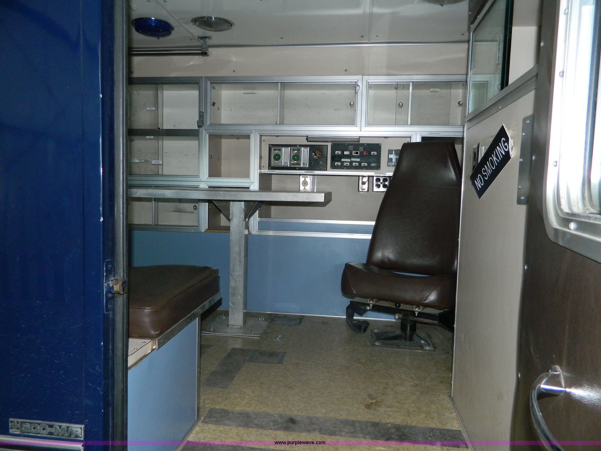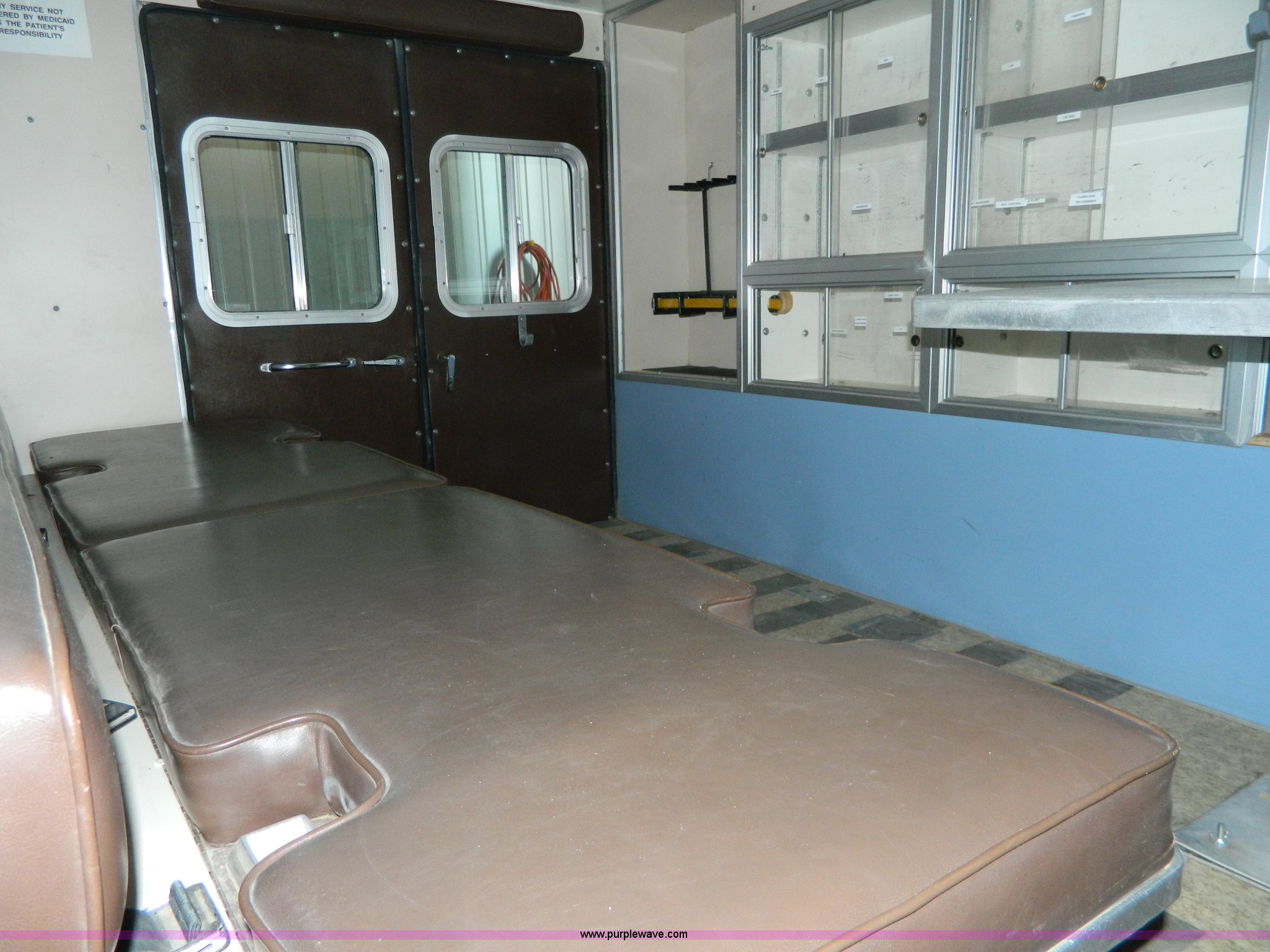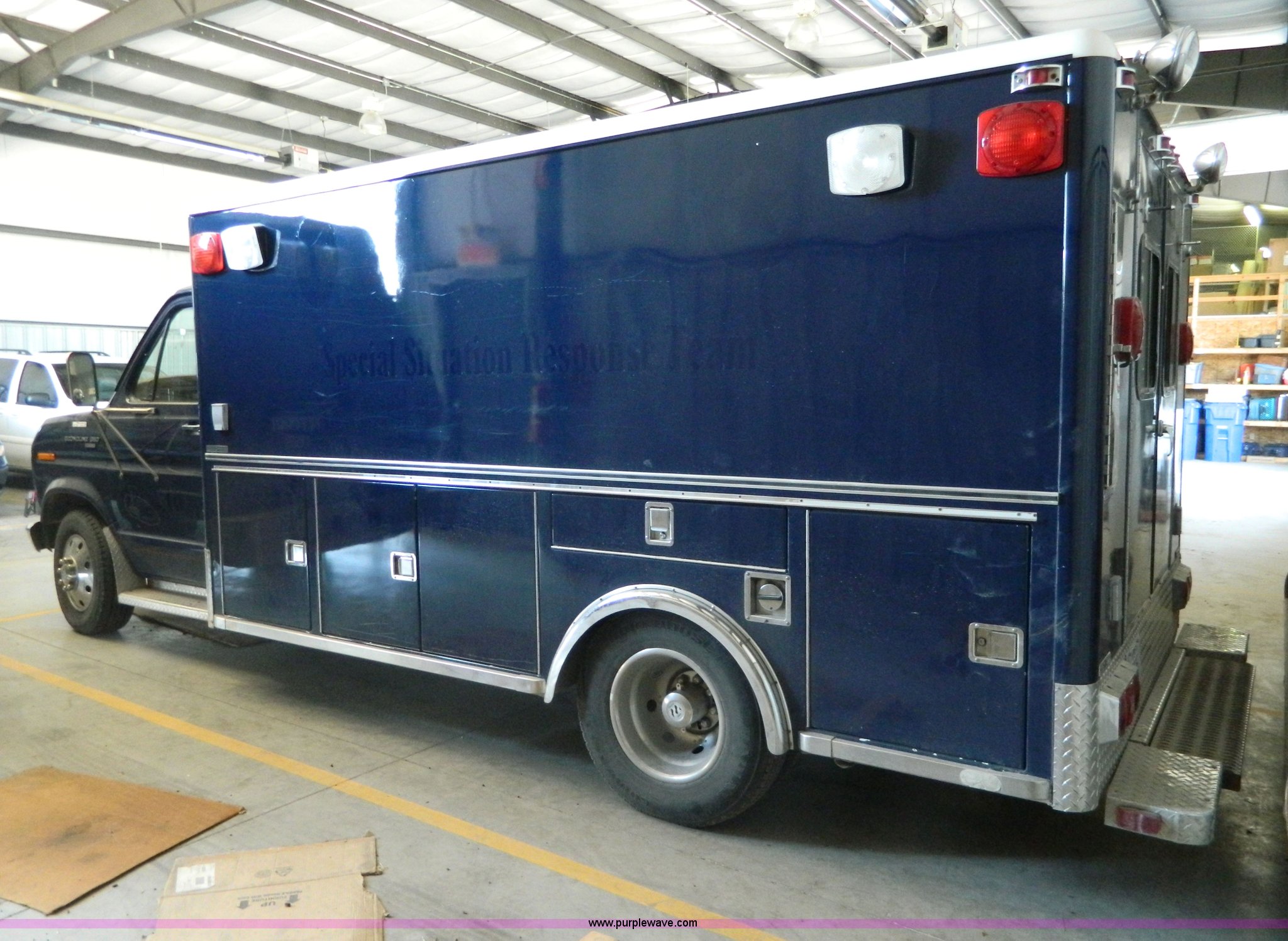Purple Wave is selling a used Fire Truck or Emergency Vehicle in Kansas. This item is a 1989 Ford Econoline E350 ambulance with the following: 47,928 miles on odometer, Actual Mileage Unknown, 7.3L V8 OHV 16V diesel engine, Automatic transmission, AC and heat, Cruise, AM/FM/cassette, Manual windows and locks, Cloth interior, Vanner Series 30 charger, 500 MR conversion, SVP electronic siren, Code 3 light bar, LT215/85R16 tires, GVWR 10,000 lbs, Engine has fuel leak when running, Hard to start, Unknown fuel issue, Aluminum center table not included, Decal residue