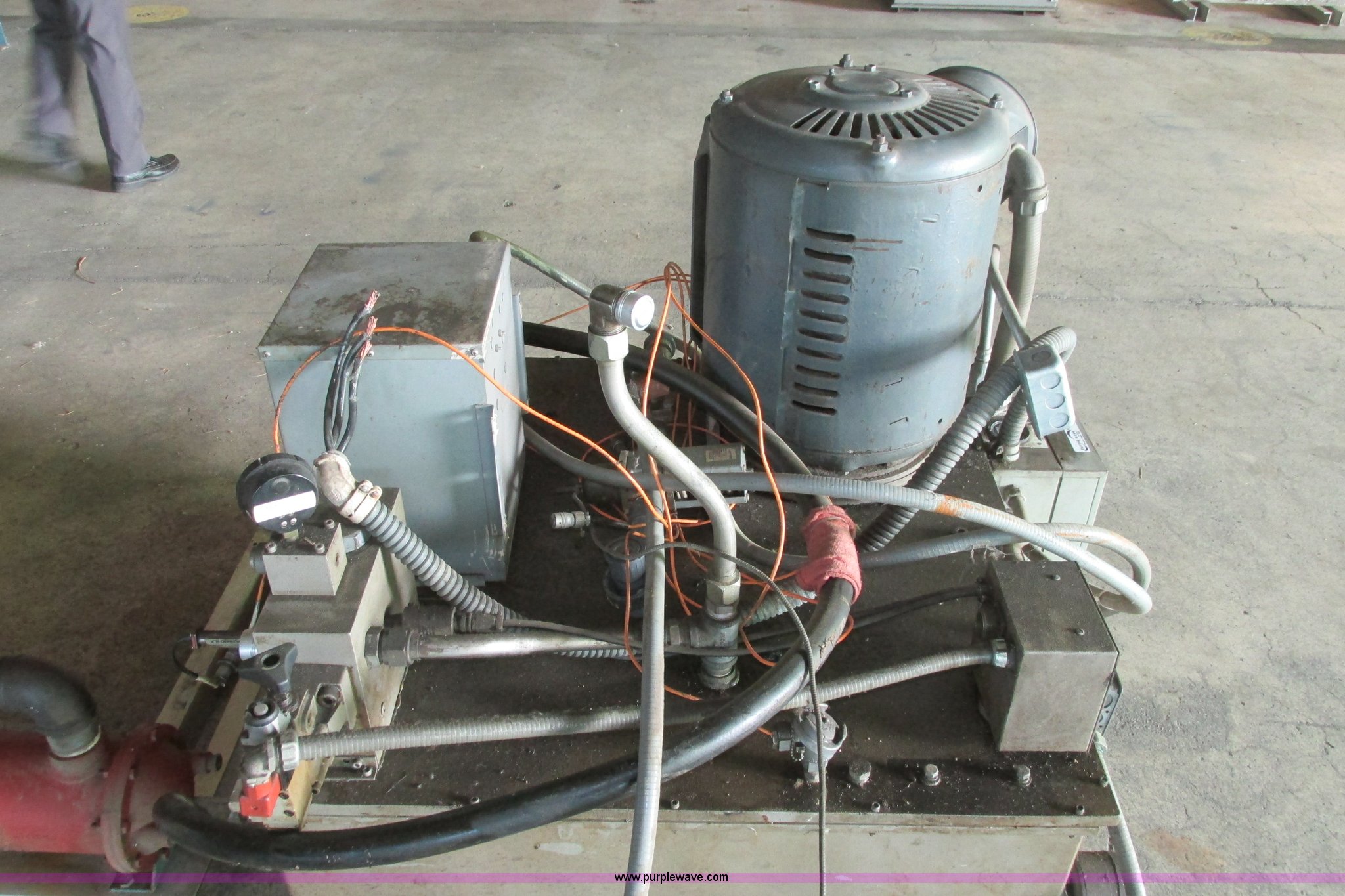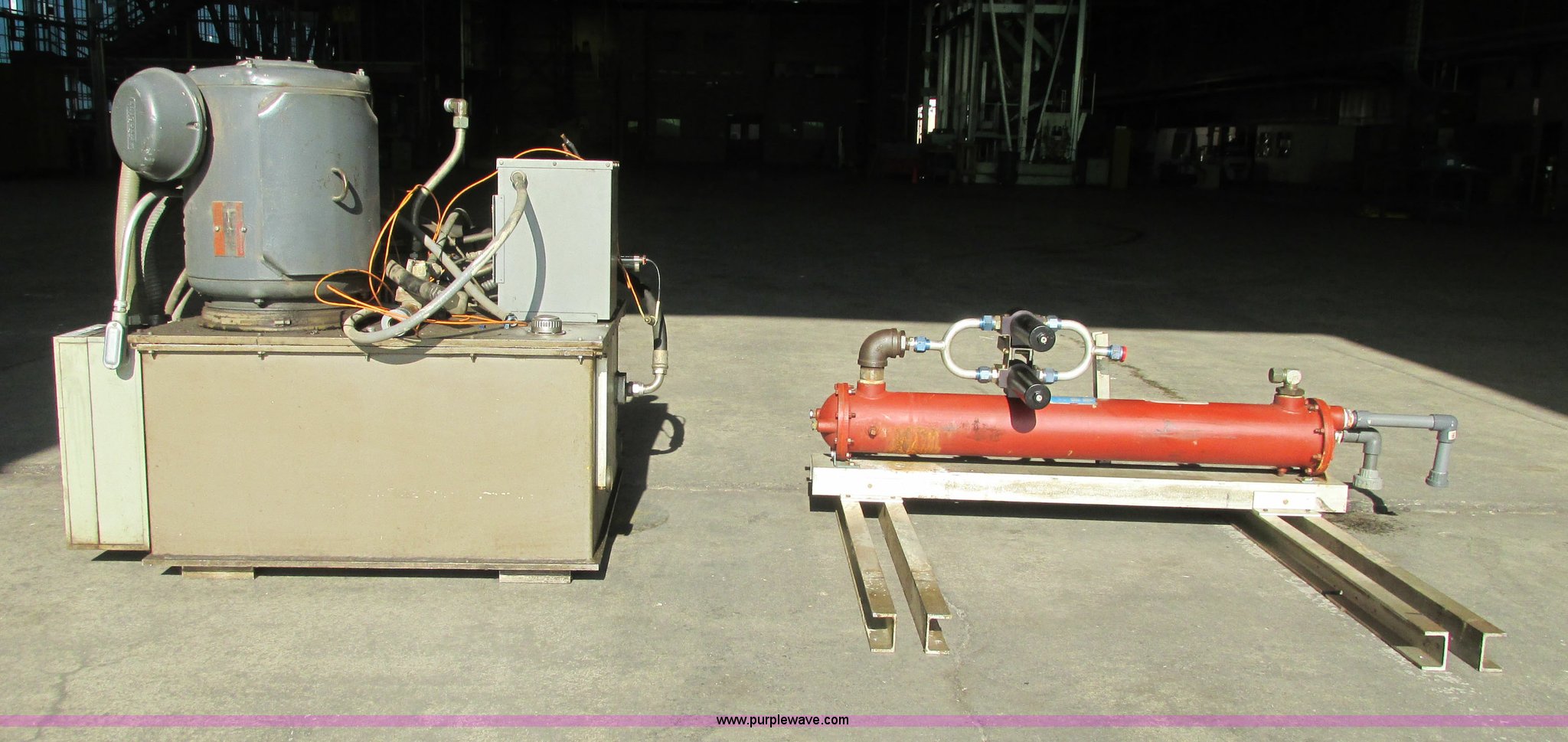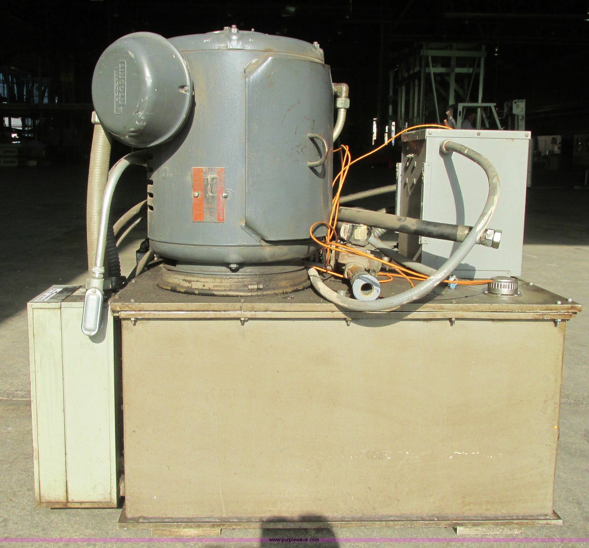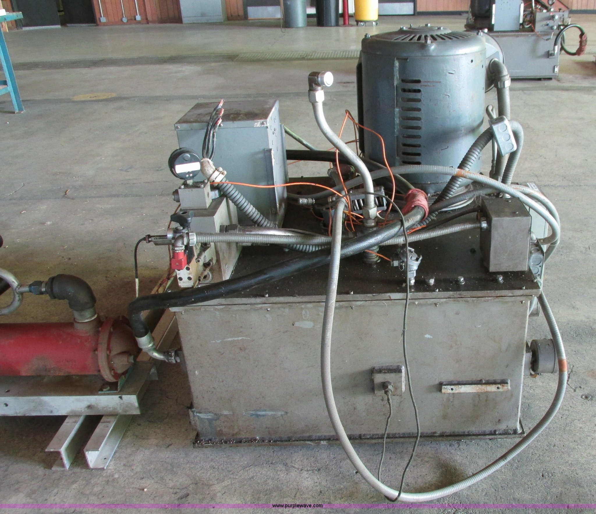 Purple Wave is selling a used Tools in Kansas. This item is a Instron hydraulic power supply with the following: Model 210-20, 22,943 hours on meter, Lincoln 40 HP motor, 230/460V, Three phase, 1,765 RPM, 100/50 amp, Lincoln code TV-3594, Serial 2281053, GE Control 200 Line starter, 80 gallon hydraulic reservoir, Basco head exchanger, Size 06048, Shell 300, Tube 150, Max WIP psi, 300 degree Fahrenheit max temperature, P/N 2A05A06048, Operational when removed from service in 2013