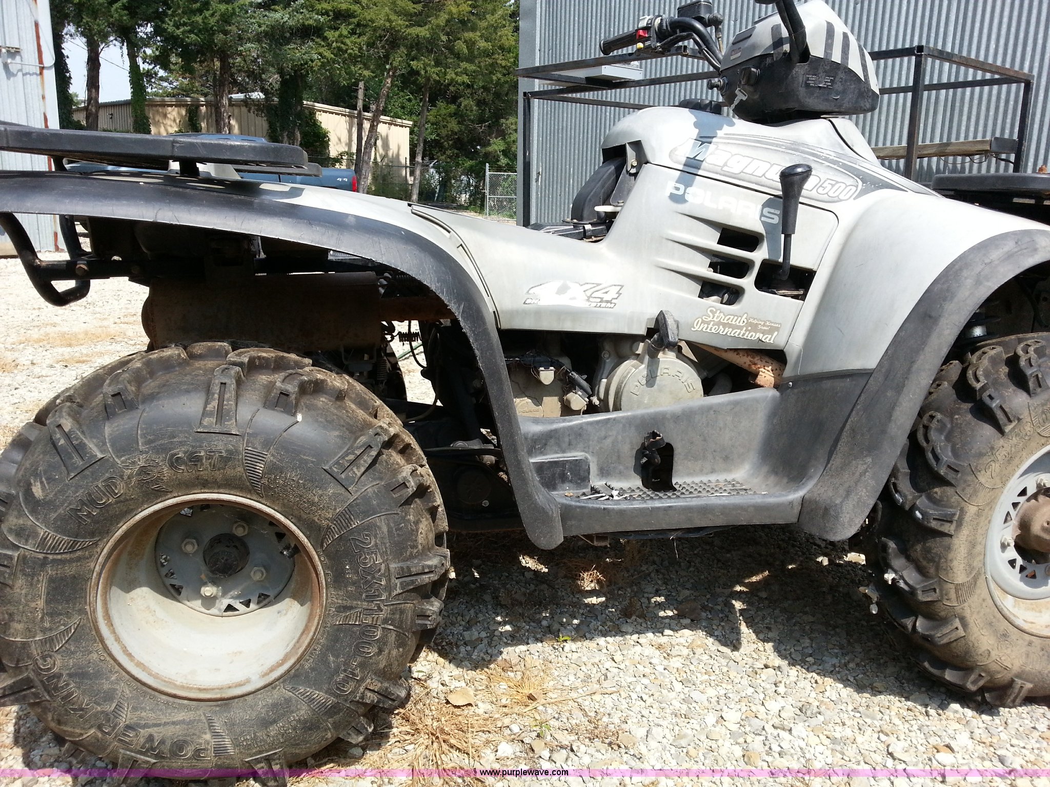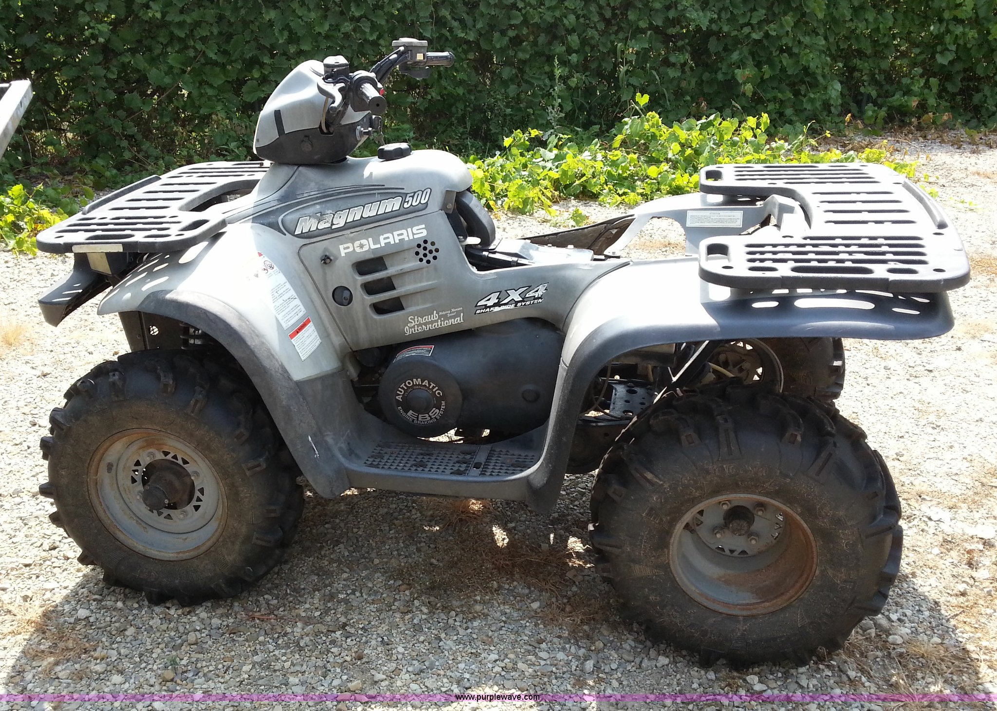 Purple Wave is selling a used ATV in Kansas. This item is a 2001 Polaris Magnum 500 ATV with the following: Odometer inoperable, Automatic transmission, Reverse, Push button start, 2" ball hitch, Seat cushion missing, Engine over heats