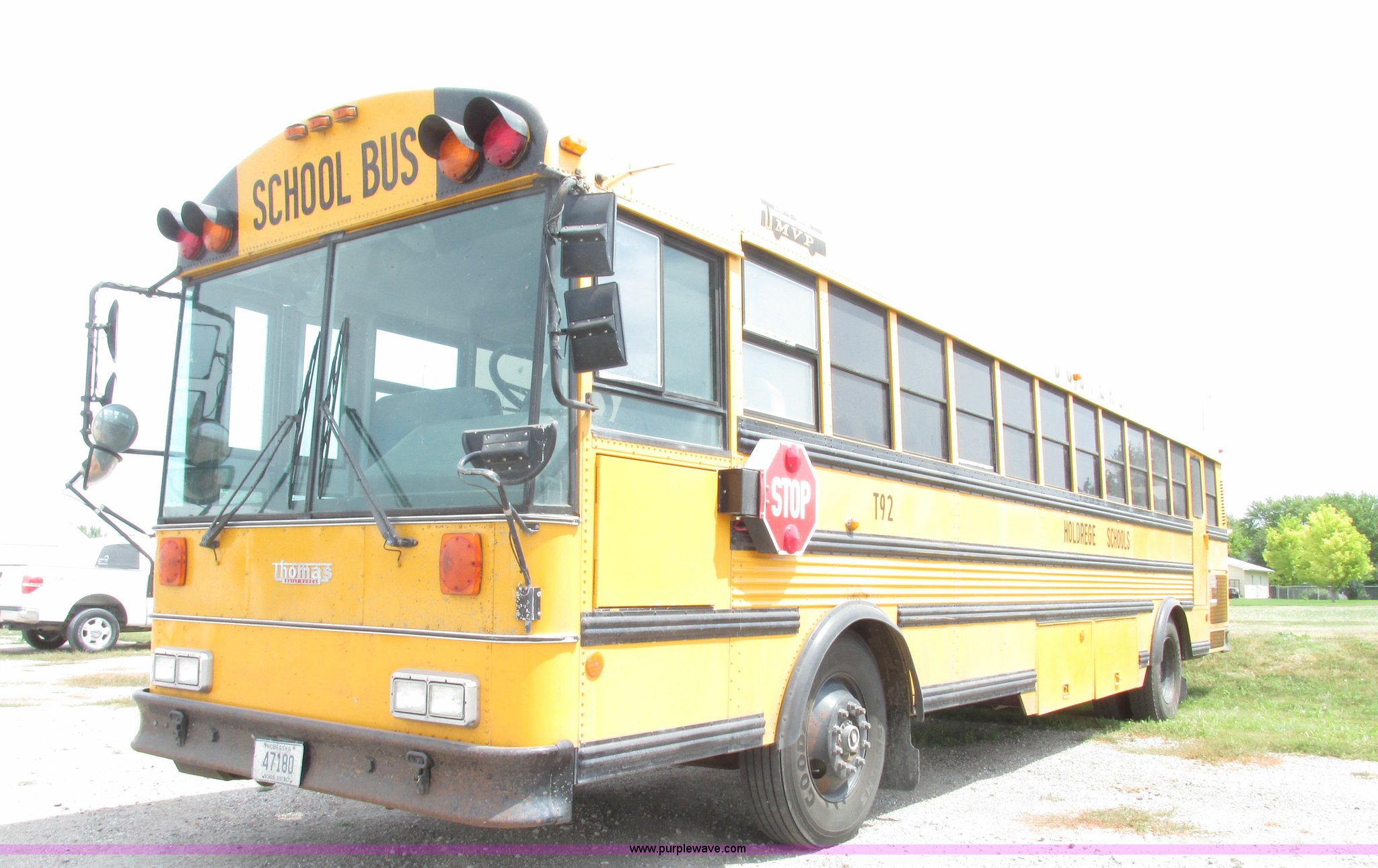 Purple Wave is selling a used Bus in Nebraska. This item is a 1992 Thomas Built Saf-T-Liner MVP school bus with the following: 232,812 miles on odometer, 8,370 hours on meter, Cummins 210 5.9L L6 turbo diesel engine, Serial 44737650, Allison MT643RM automatic transmission, Re-manufactured, Serial 9208075271, Heat, Tilt, Panasonic B520 AM/FM/cassette, Manual windows, Vinyl interior, Overhead lighting, Air suspension seat, Heated mirrors, (2) recirculation fans, 72 passenger capacity, Bergstrom 12V bus heater, 101,000 BTU, Part# 710071, Serial 204001592, Roof vents, (2) roof emergency egress, Rear side emergency egress, (4) side emergency egress, Stop sign, Strobe light, Electrical access entry door, Overhead storage racks, Overhead emergency equipment, First aid kit, Health related supplies and clean up kit, Fire extinguisher, Safety triangles, Mudflaps, Tow hooks, Spring suspension, Air brakes, Thomas F3W-1200 front axle, Eaton 22123 rear axle, 11R22.5 tires, GVWR 30,000 lbs, FAWR 11,000 lbs, RAWR 19,000 lbs, Body ID # 12325-72903-ER-1309S, Interior/exterior cosmetic damage, Extension cord not included, Contents not included