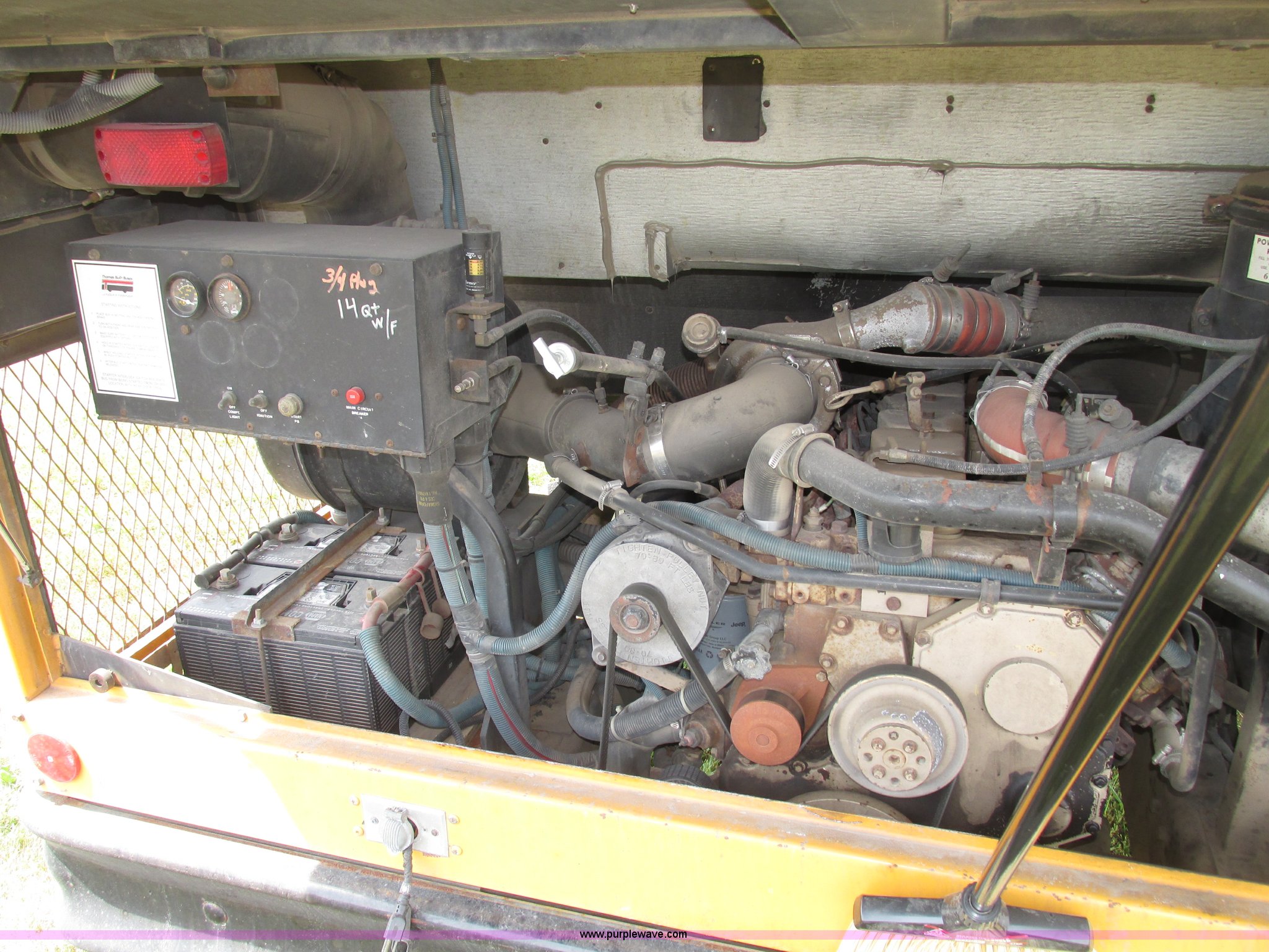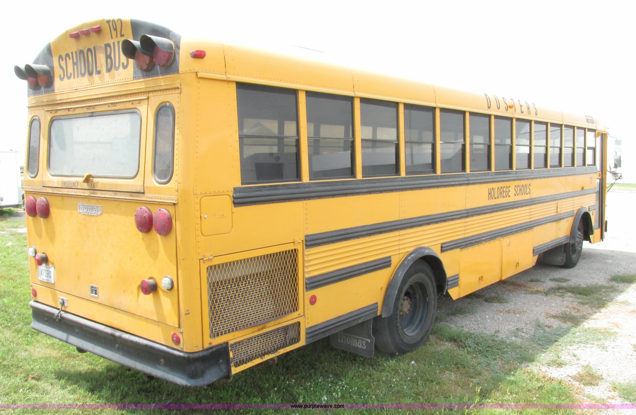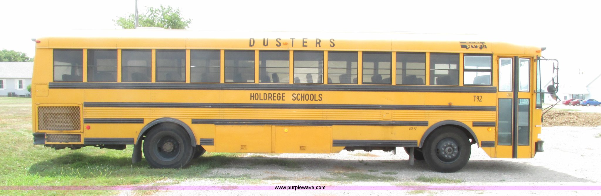 1992 Thomas Built Saf-T-Liner MVP school bus. 232,812 miles on odometer, 8,370 hours on meter, Cummins 210 5.9L L6 turbo diesel engine Serial 44737650, Allison MT643RM automatic transmission Re-manufactured, Serial 9208075271, Heat, Tilt, Panasonic B520 AM/FM/cassette, Manual windows, Vinyl interior, Overhead lighting, Air suspension seat, Heated mirrors, (2) recirculation fans, 72 passenger capacity, Bergstrom 12V bus heater 101,000 BTU, Part# 710071, Serial 204001592, Roof vents, (2) roof emergency egress, Rear side emergency egress, (4) side emergency egress, Stop sign, Strobe light, Electrical access entry door, Overhead storage racks, Overhead emergency equipment, First aid kit, Health related supplies and clean up kit, Fire extinguisher , Safety triangles, Mudflaps, Tow hooks, Spring suspension, Air brakes, Thomas F3W-1200 front axle, Eaton 22123 rear axle, 11R22.5 tires, GVWR 30,000 lbs, FAWR 11,000 lbs, RAWR 19,000 lbs, Body ID # 12325-72903-ER-1309S, Interior/exterior cosmetic damage, Extension cord not included, Contents not included. 1T79R4B26N1112325. View equipment video. Holdrege Public Schools. 505 14th Ave. Holdrege, NE 68949