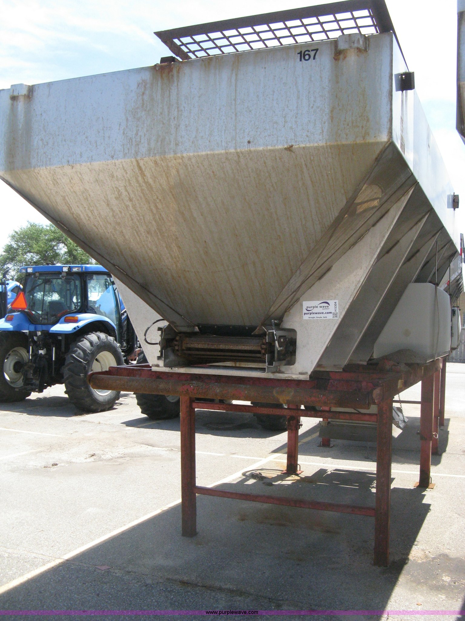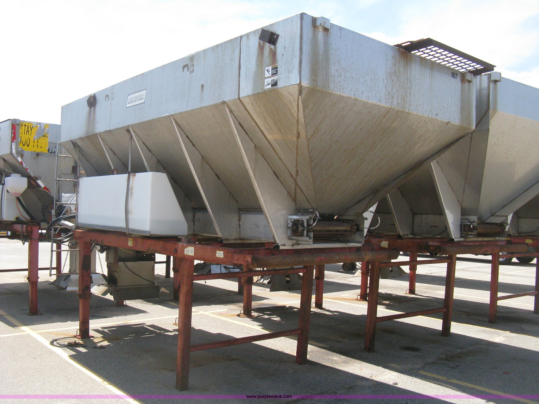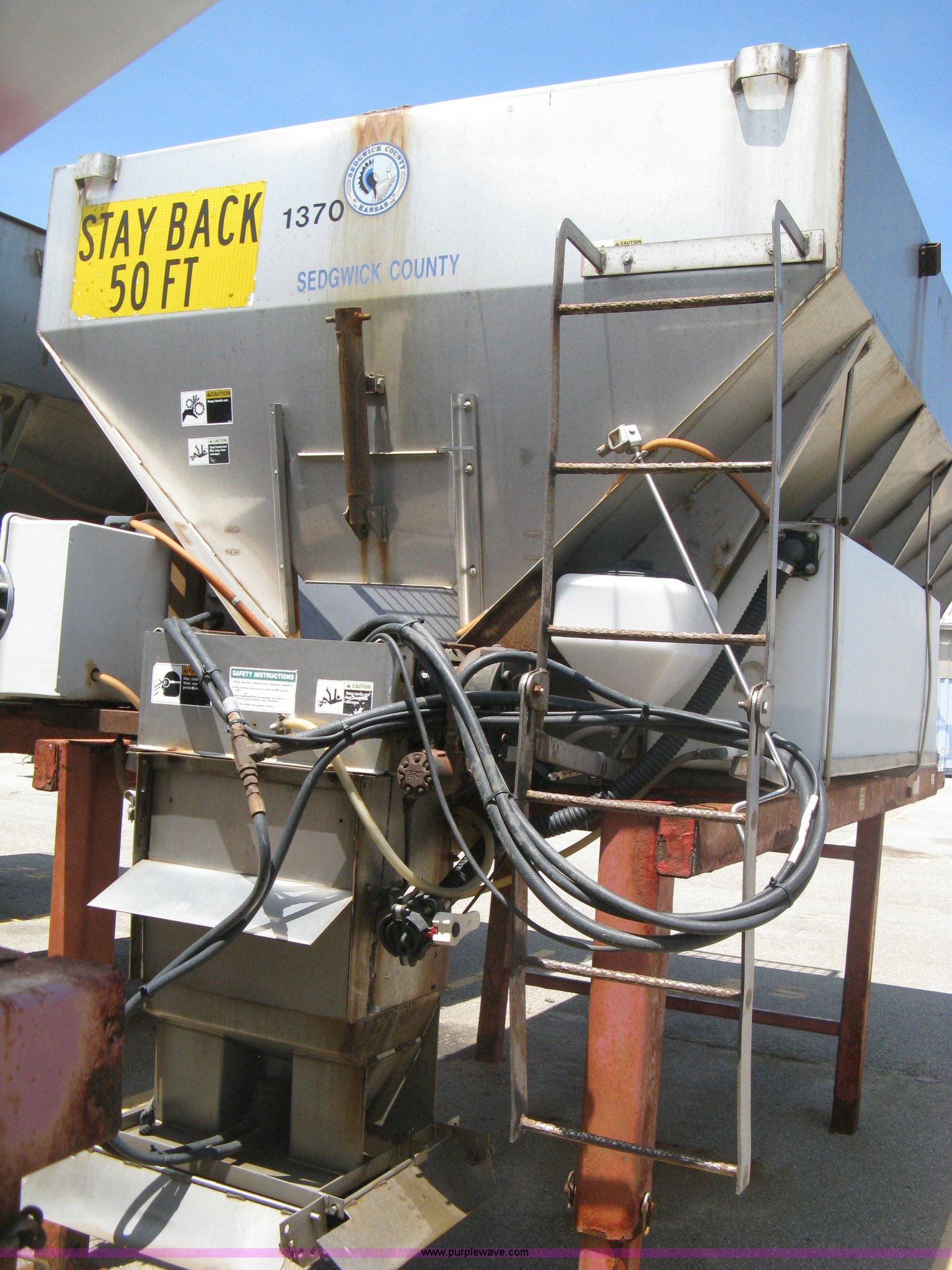 Henderson slide-in salt/sand spreader. Model WSHX14X60X304, 13.5 cu. yd. capacity, Stainless steel, Hydraulic drive spinner, (2) poly side mount brine tanks, Stand alone frame stand Front slide-in roller, Top grates, Serial WSH21438, Unit 1370. Sedgwick County. 1021 Stillwell St. Wichita, KS 67213